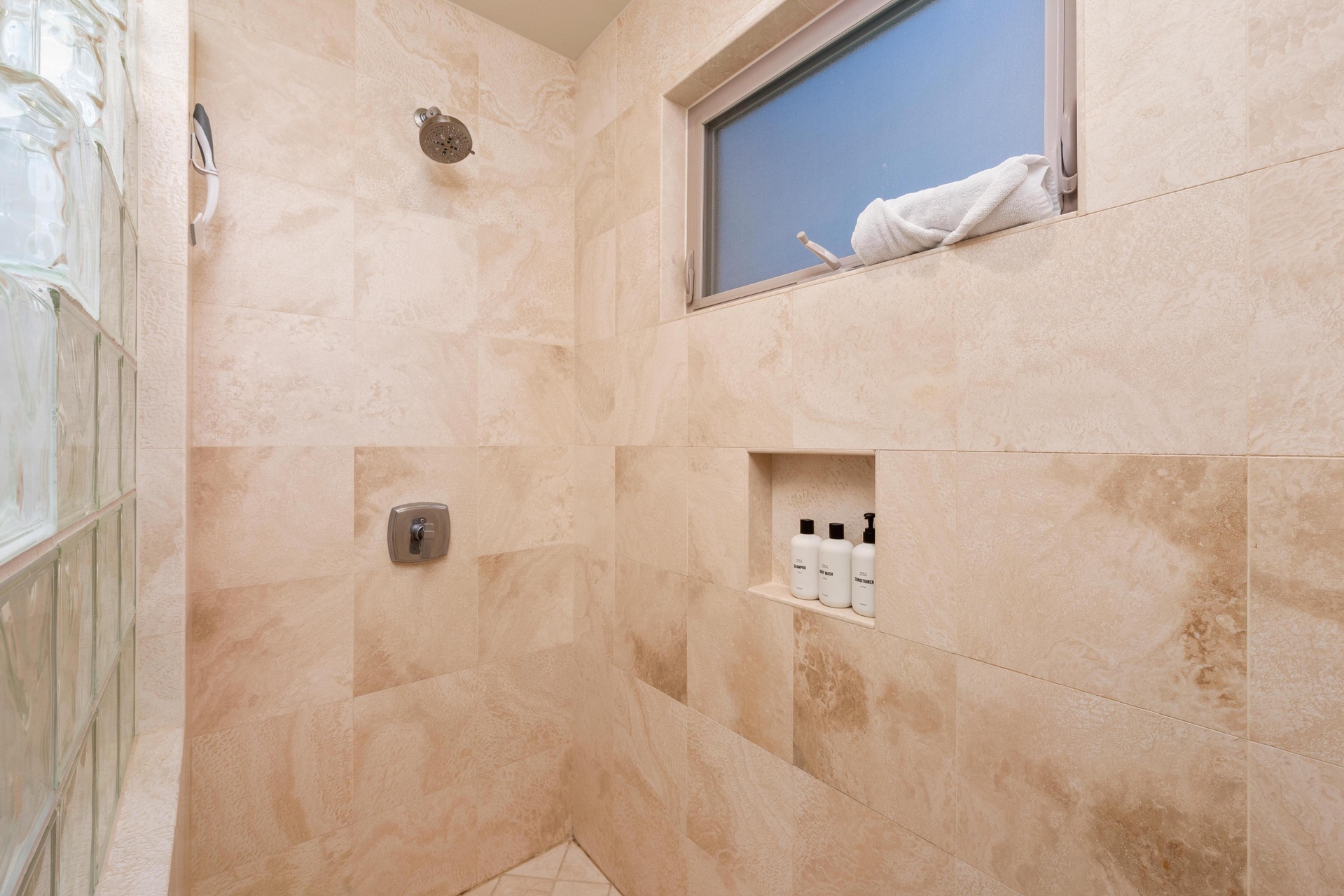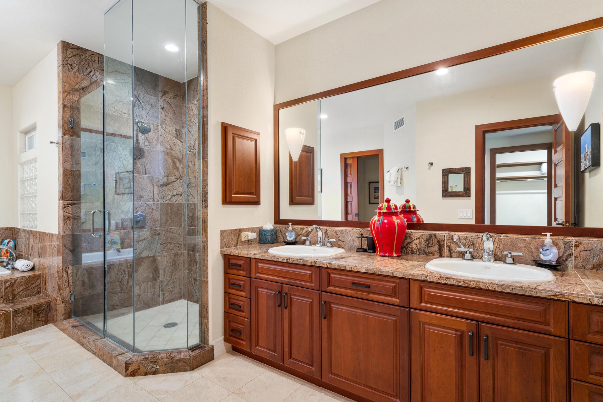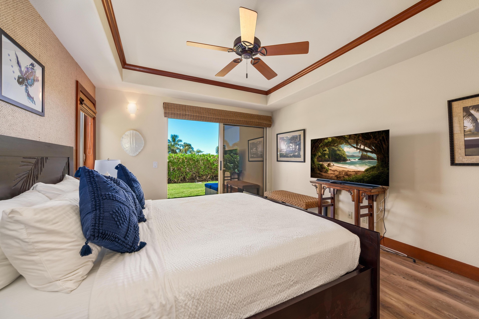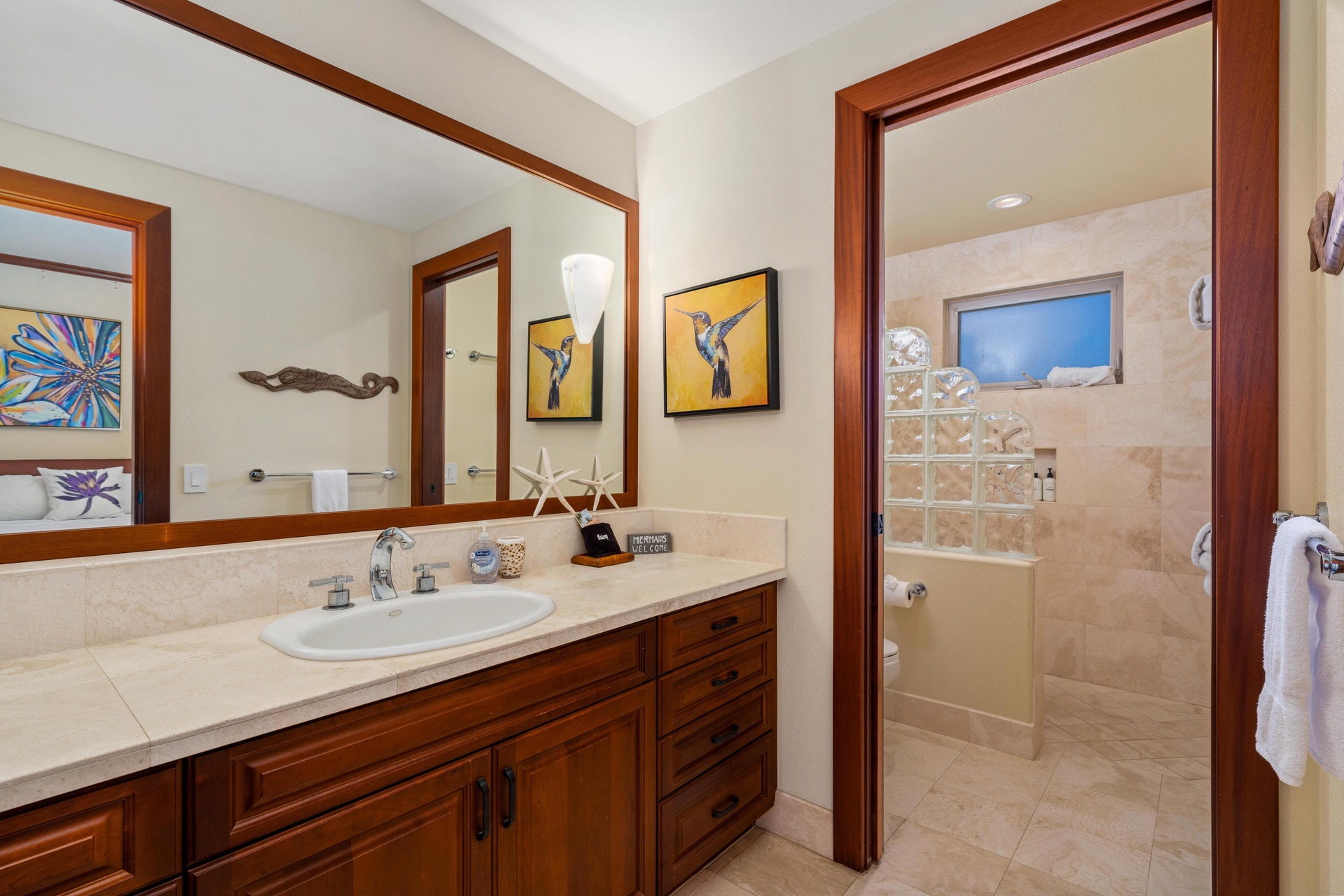 Guest Suite (Downstairs) The first guest bedroom with a king bed offers its own ensuite bathroom with a soaking tub, a walk-in shower, and direct access to a private lanai. Step right out onto the lush grass from your own patio and enjoy the peaceful surroundings.