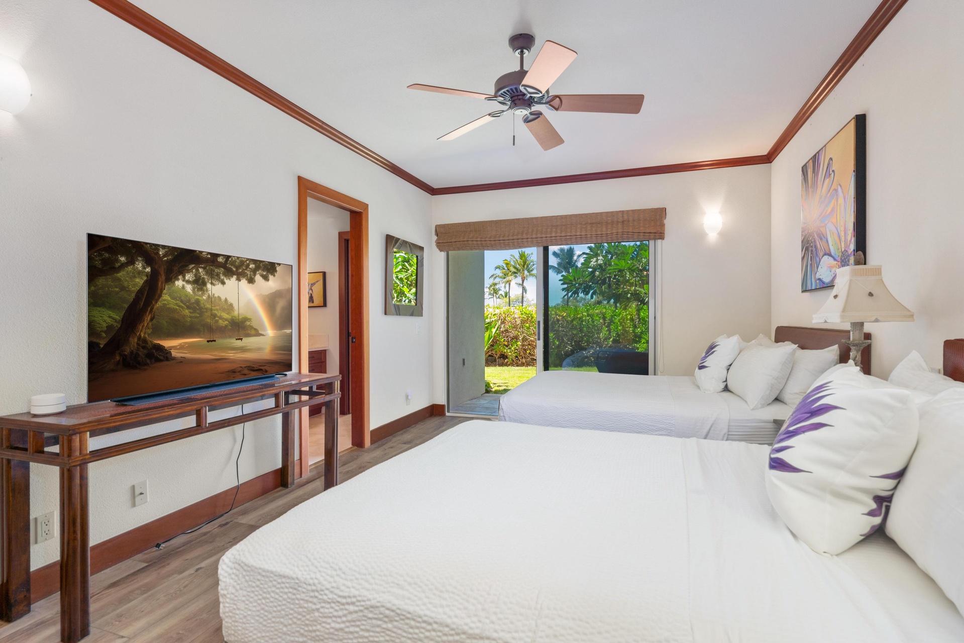Third Bedroom (Downstairs) This spacious room features two queen beds, its own private bathroom, and also has access to a private lanai that leads directly to the beautiful garden area.