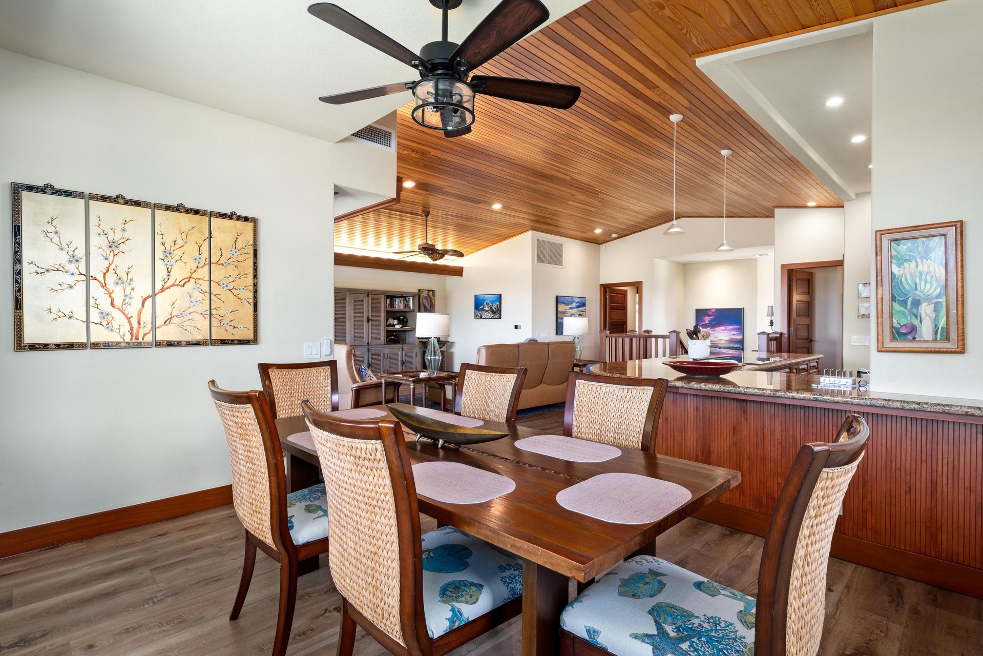The chef’s dream kitchen is equipped with upgraded, top-of-the-line appliances, a large island with bar seating, and everything you need to prepare gourmet meals. Enjoy your culinary creations indoors at the dining table or al fresco on the expansive lanai.
