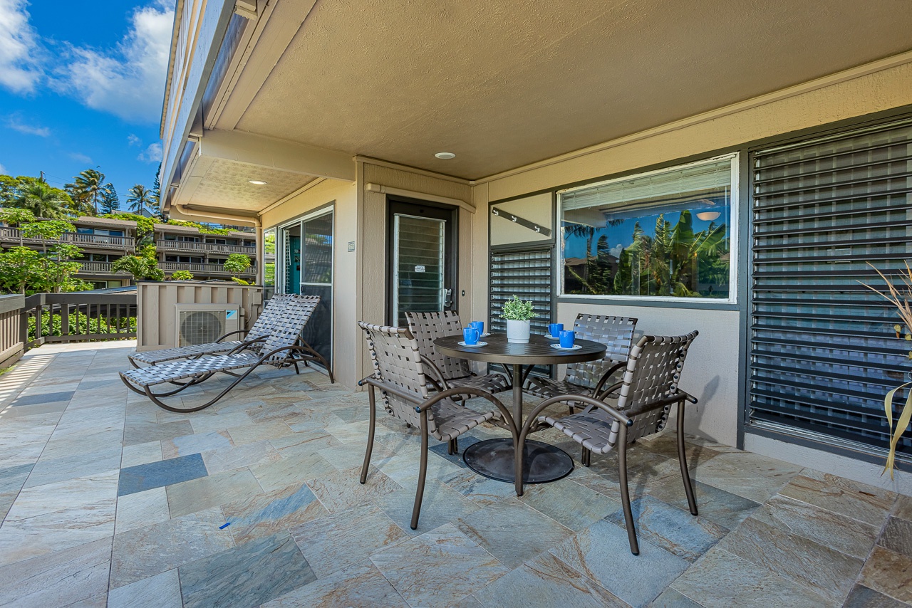 Lanai dining setup for four, plus two lounge chairs for relaxing