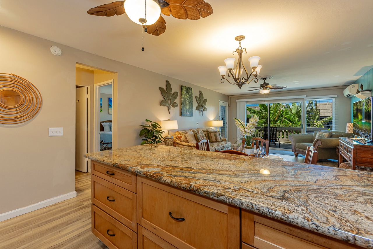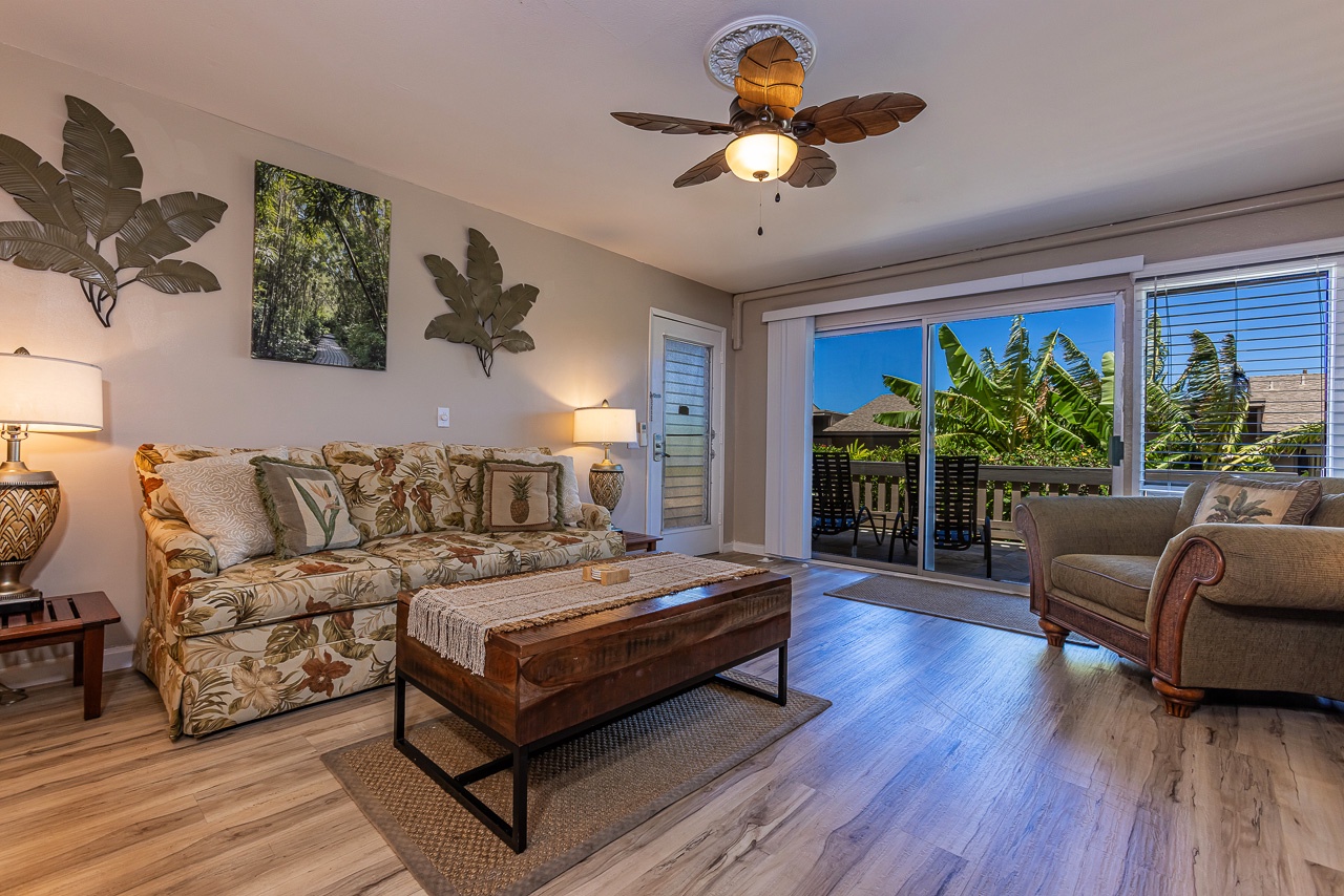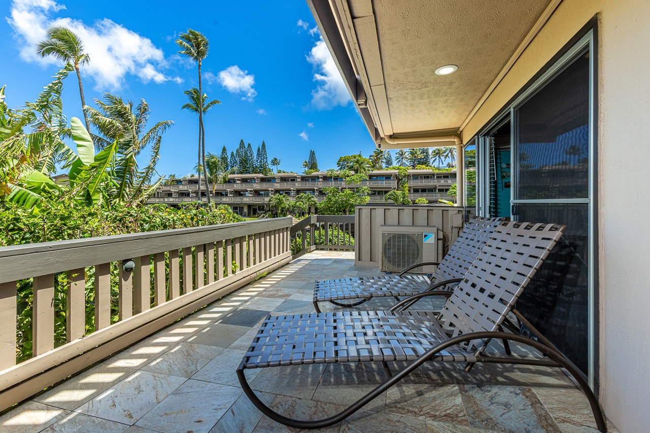 Step outside the living room to your lanai with lounge chairs. Perfect for relaxing in the island breeze.