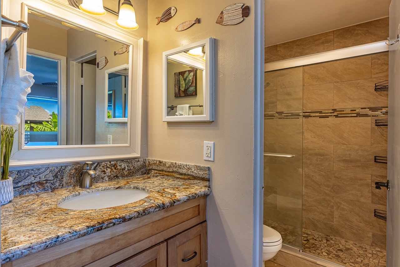 Upgraded kitchen and bathroom with modern counters and cabinets