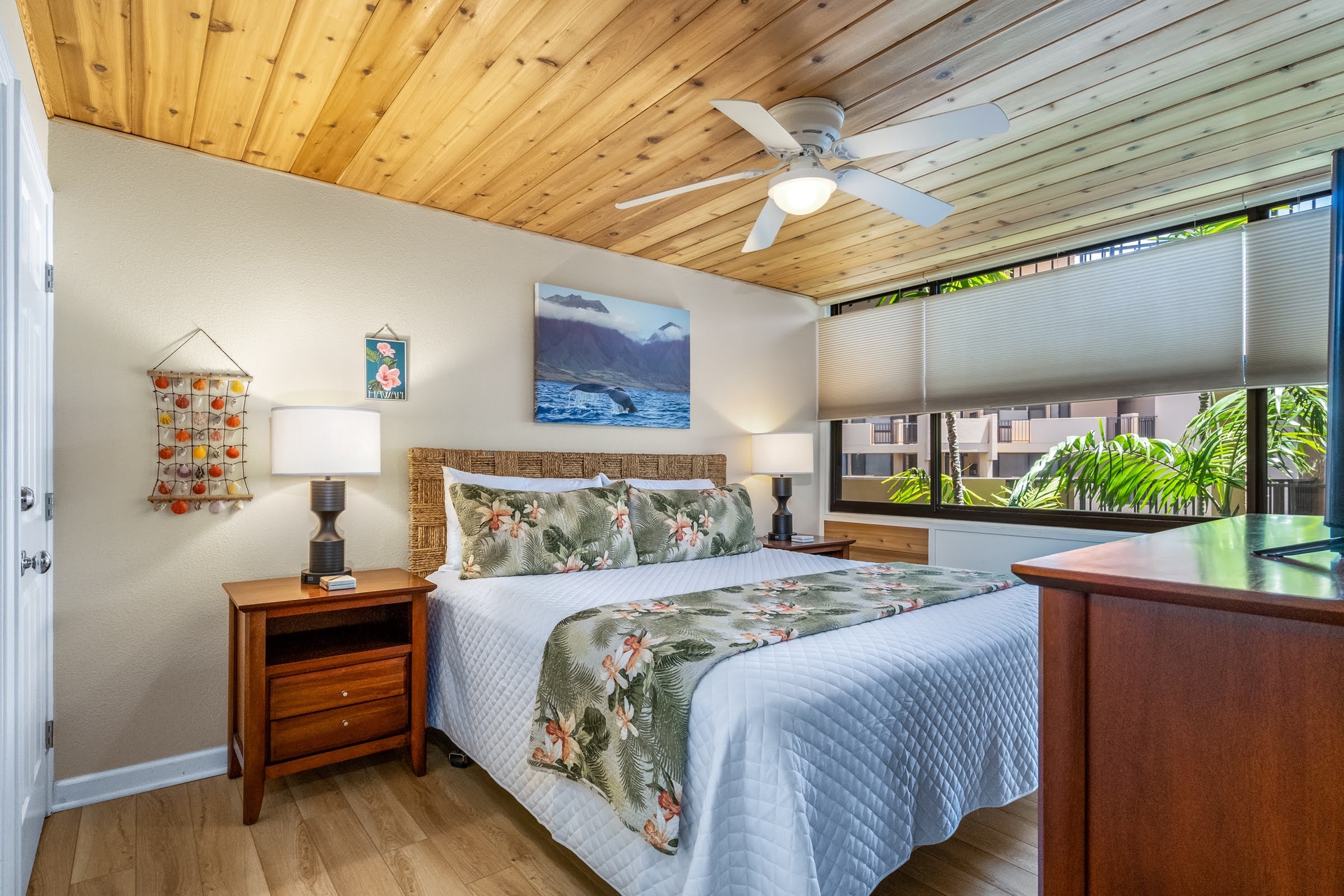 King bed with tropical decor to relax for your next Maui adventu