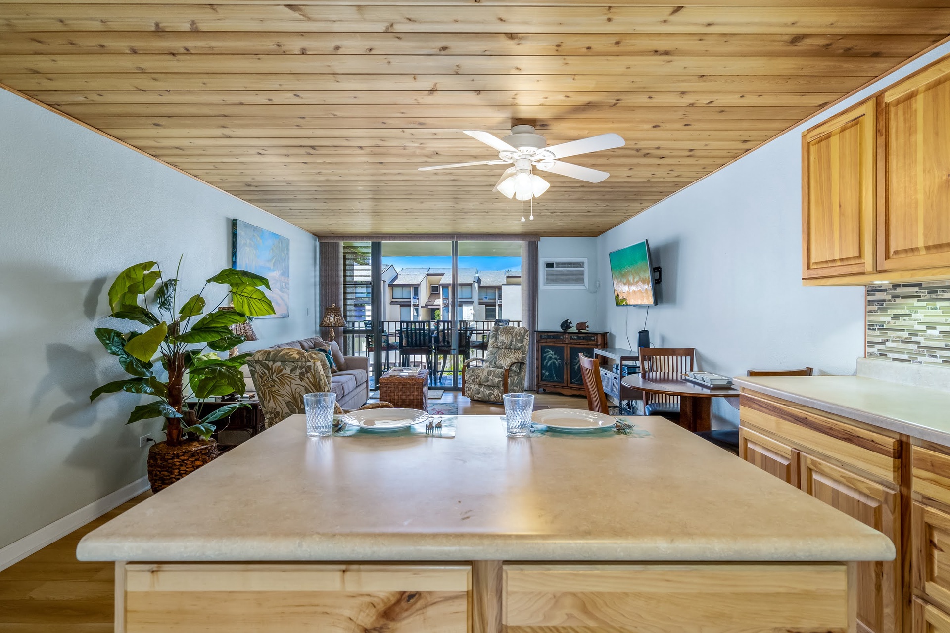 This condo with light wood throughout and tasteful island décor offers a great little beach house ambiance. The newer kitchen provides plenty of space to prep meals and comes with all appliances, cookware, and utensils needed for cooking. You can enjoy dinner for 2 at the inside dining table or move out to the lanai for a romantic meal al fresco with views of the beautiful Pacific Ocean. Keep an eye out for Humpback Whales during Winter months!