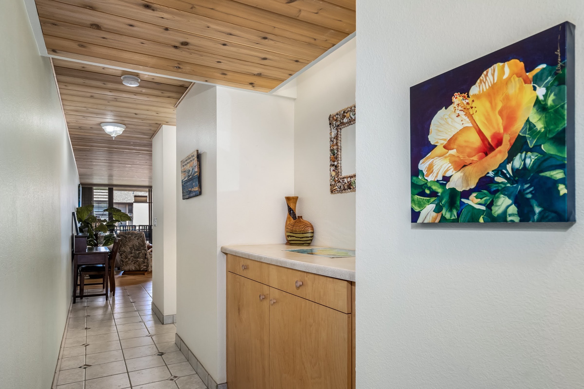 Spacious living area with tropical decor!