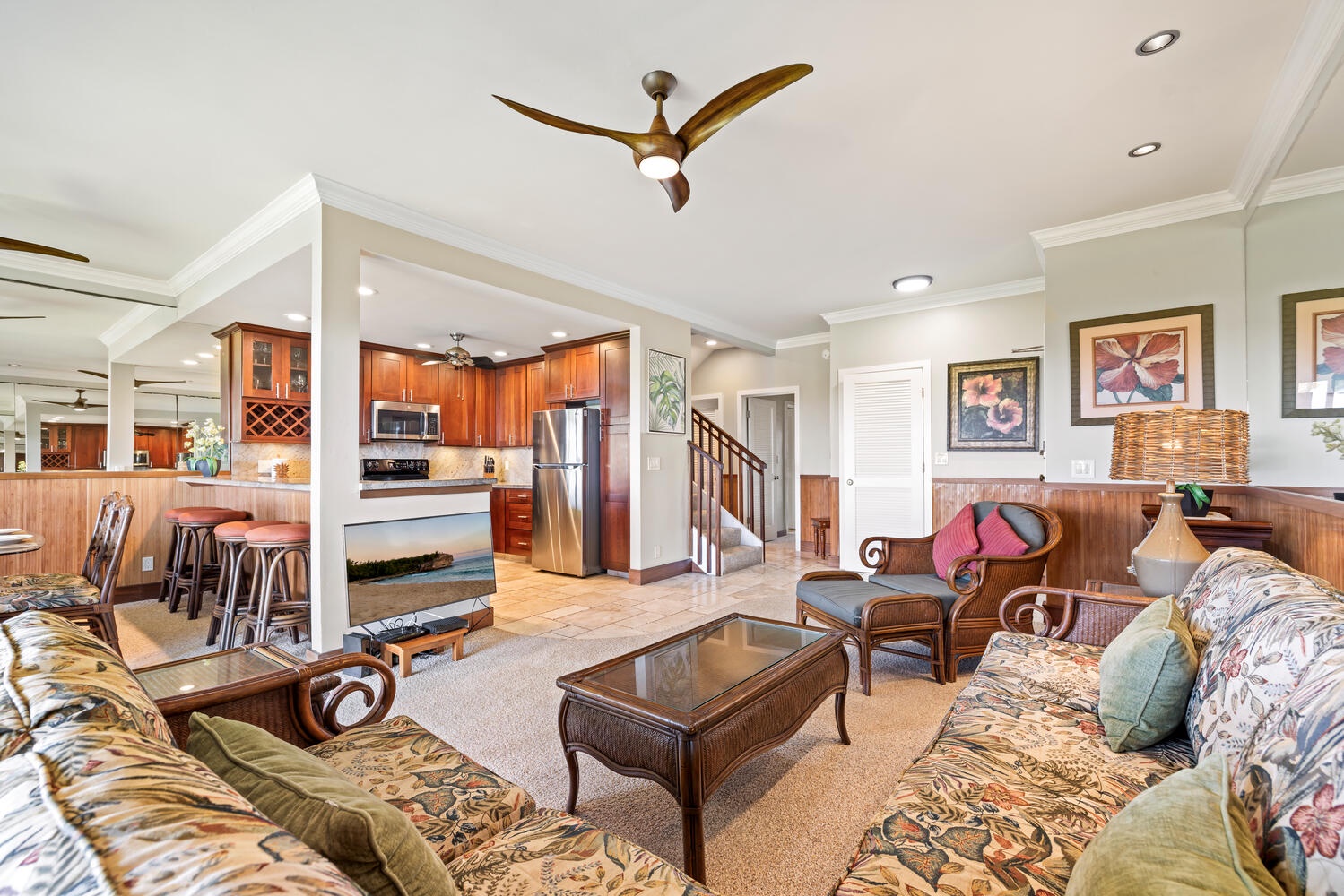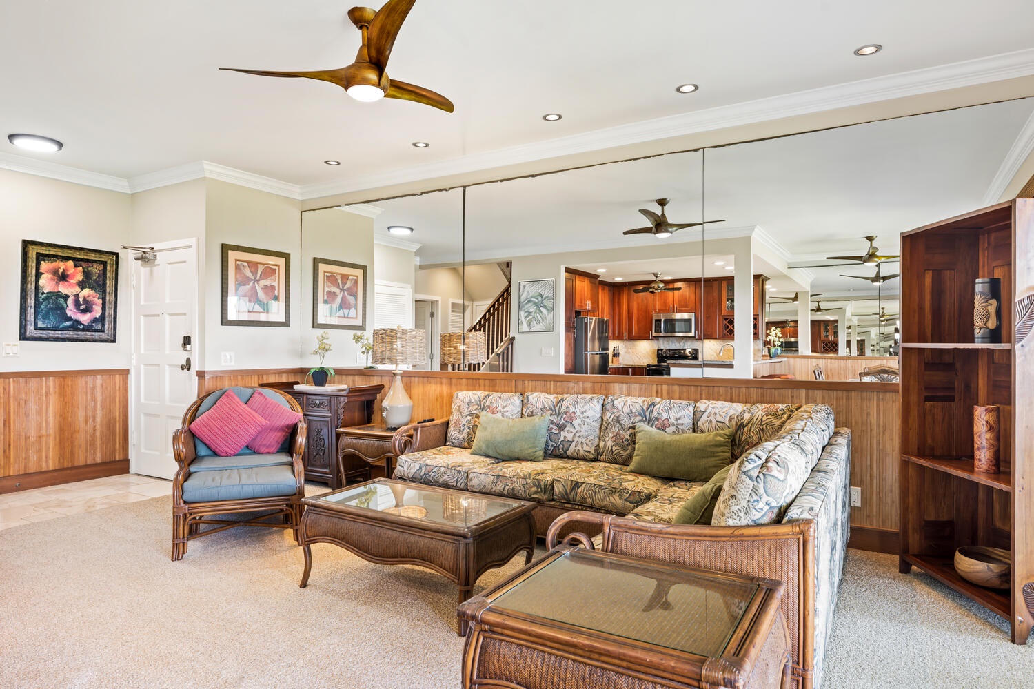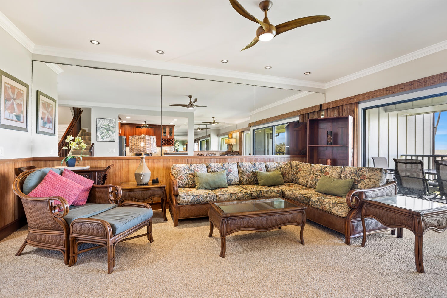 Airy Living Space: Light-filled great room with island-inspired furnishings and authentic Hawaiian touches.