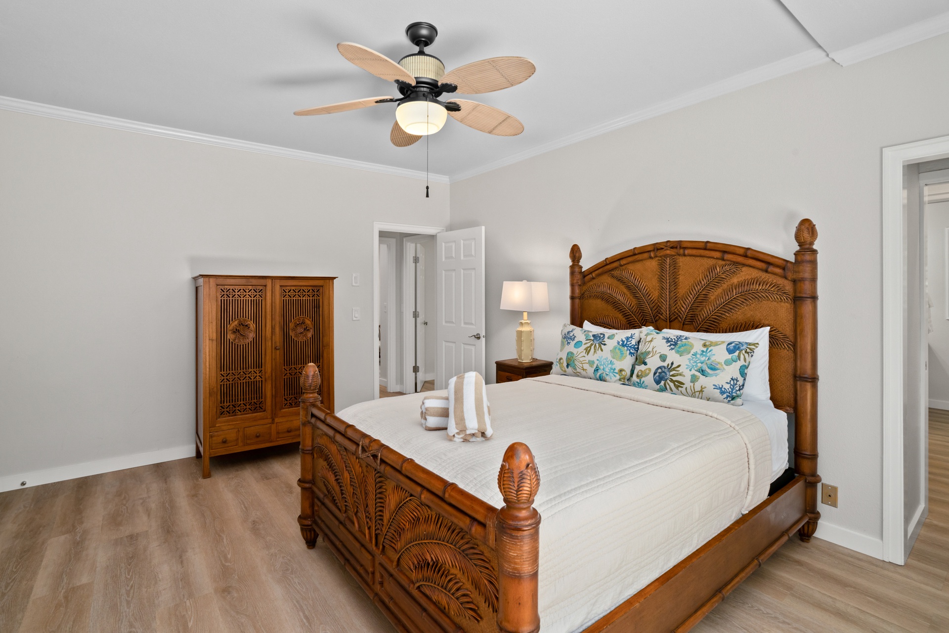 Relax and unwind in the spacious primary bedroom, featuring a plush king-size bed.