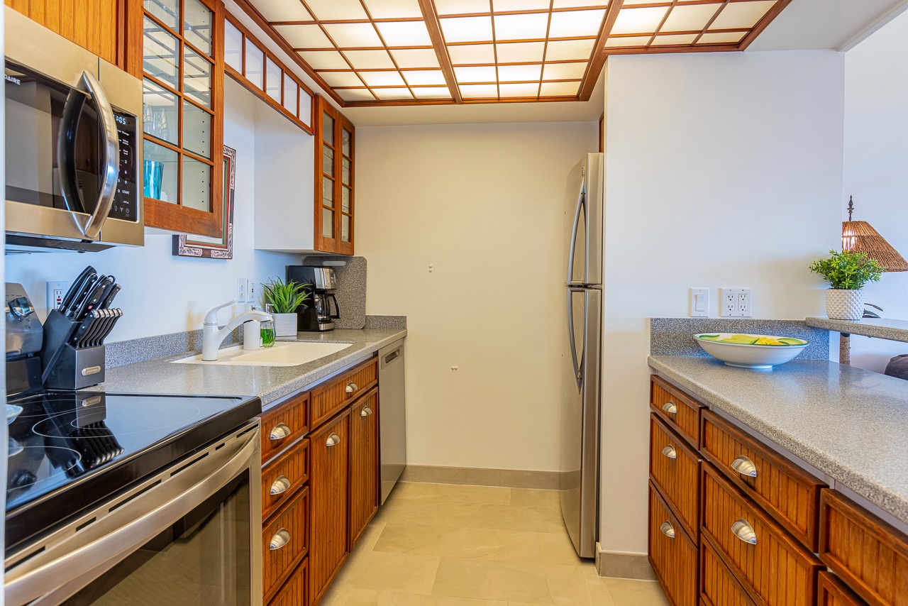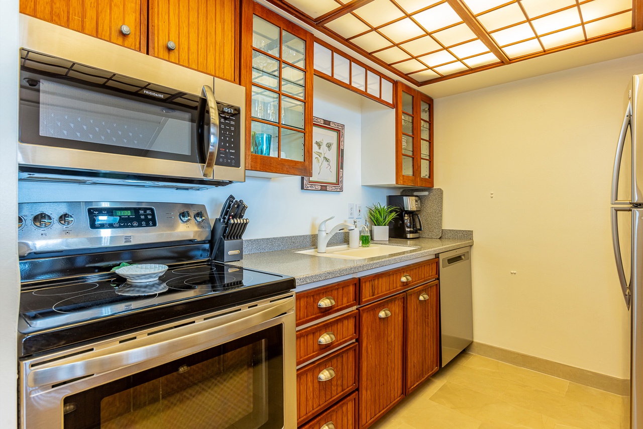 -Kitchen offers full size appliances: fridge w/ice maker, dishwasher, stove, oven, microwave