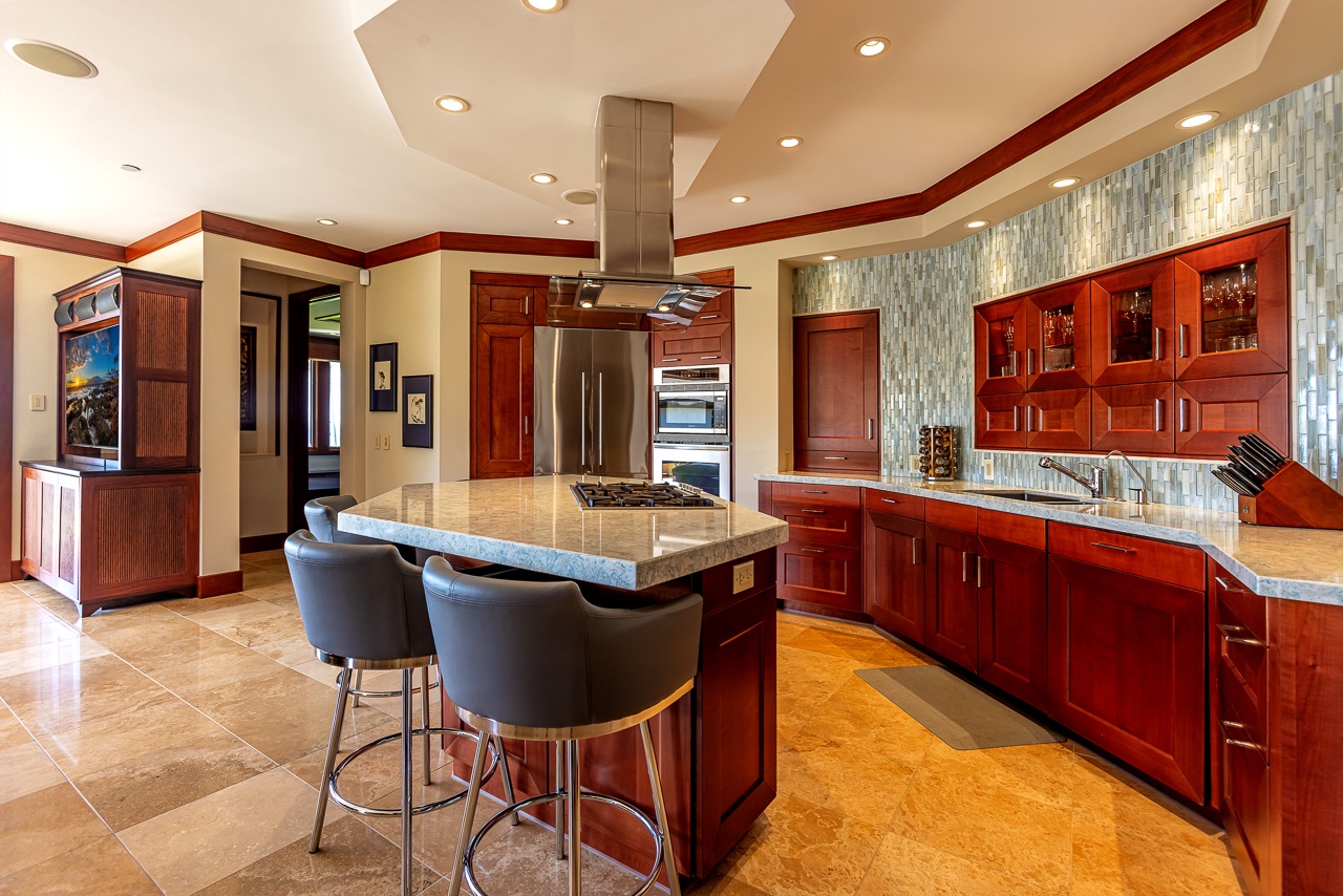 Located on the second floor, this alluring villa offers a generous 3000 sqft of open living space. Step inside and be captivated by the floor-to-ceiling glass pocket doors that seamlessly merge the indoor and outdoor spaces, creating an enchanting blend of comfort and natural beauty. Delight in al fresco dining while relishing the most magnificent ocean view in all of Wailea. During whale season, spot the majestic whales right in front of you, and witness breathtaking sunsets every evening. This private villa offers a sanctuary of tranquility, all within a few steps from the sandy shores.