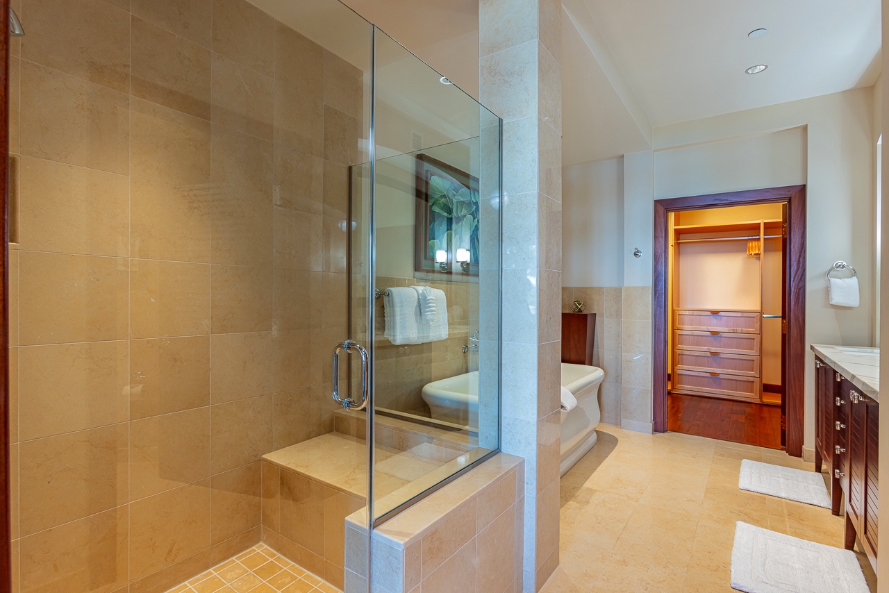 Choose between a walk-in shower or large soaking tub