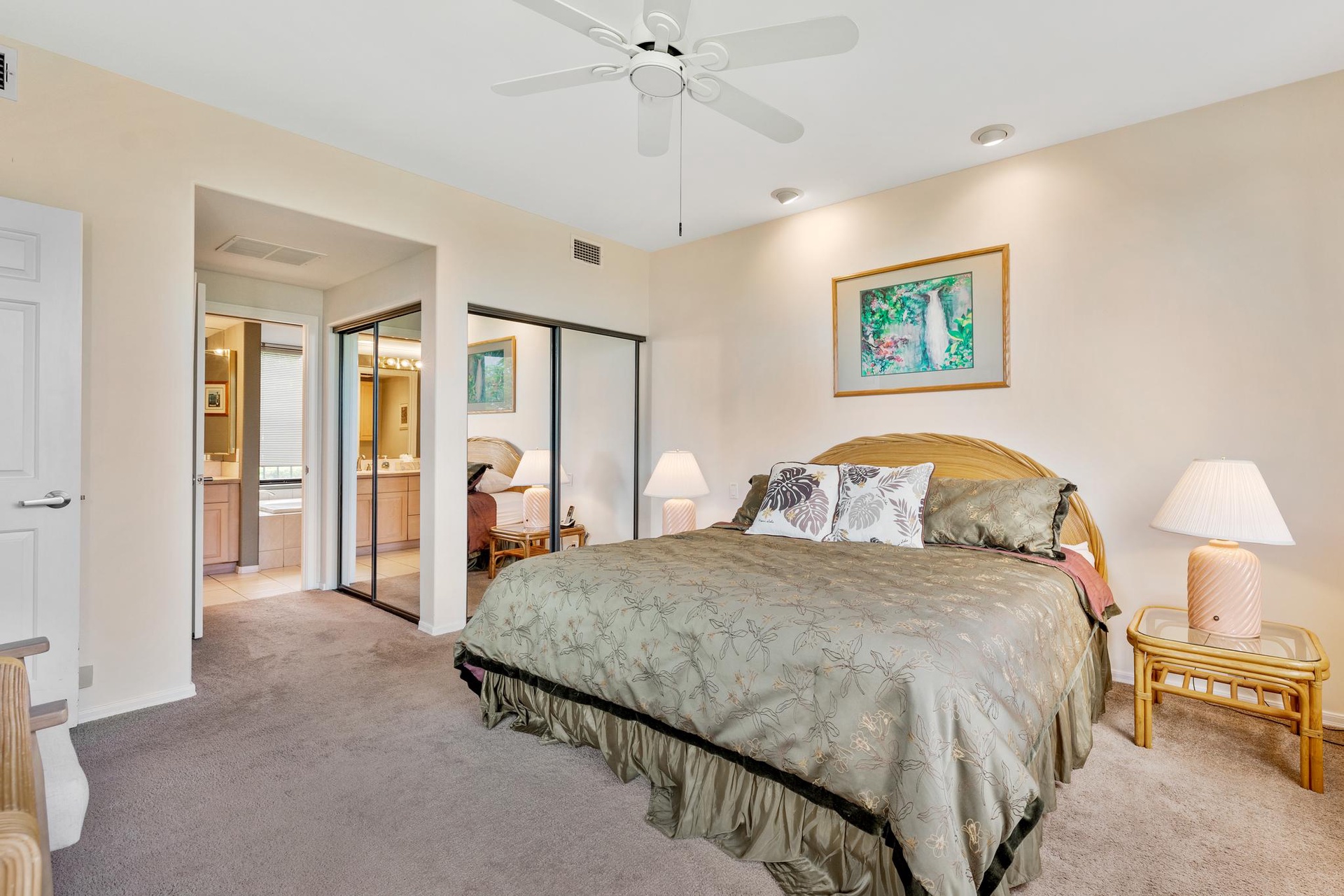 The primary suite has a California king bed and an en-suite bathroom with double vanity, a soaking tub, and a walk-in shower. A large closet as well as a chested drawer. Enjoy your ocean view and private lanai access.