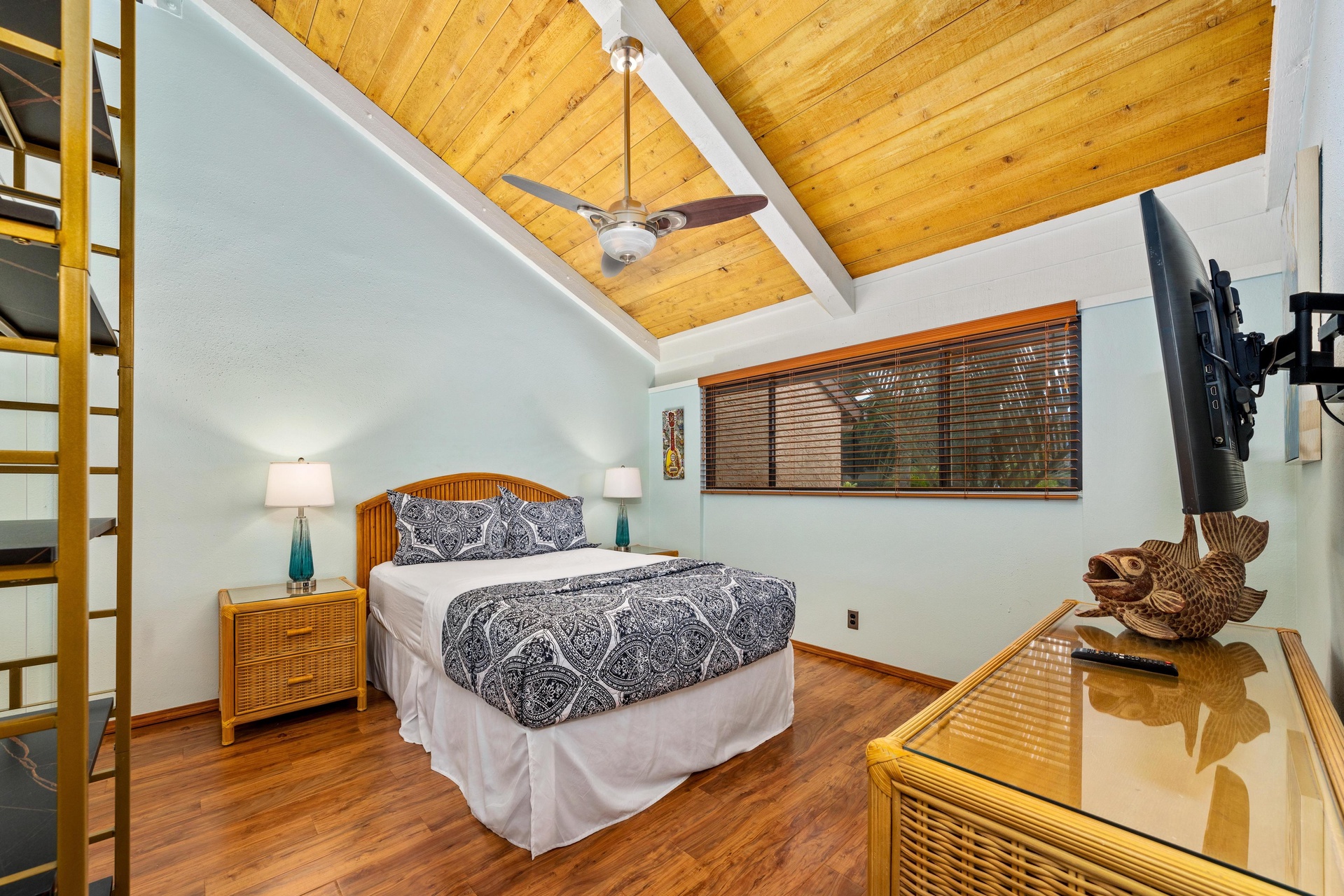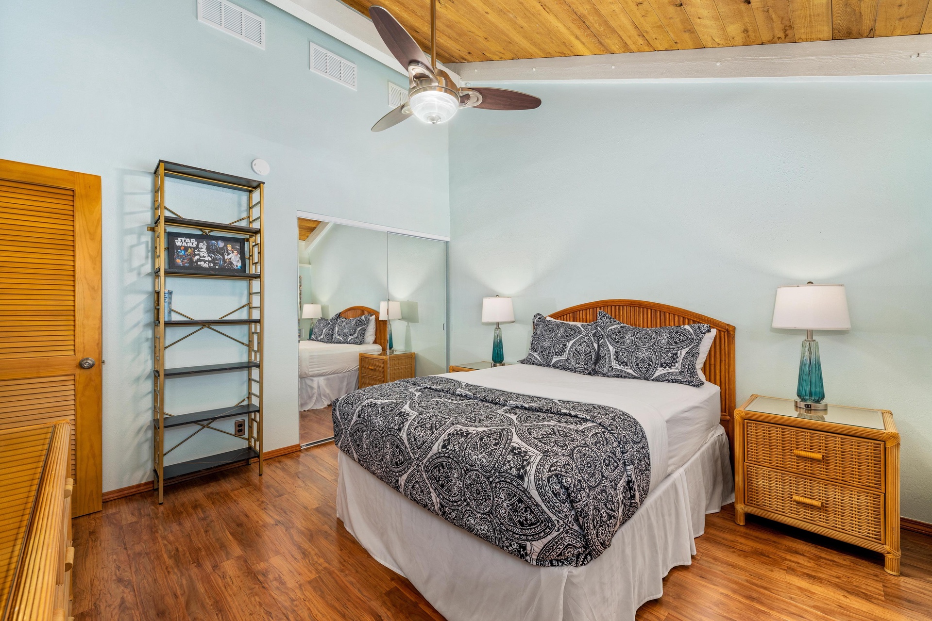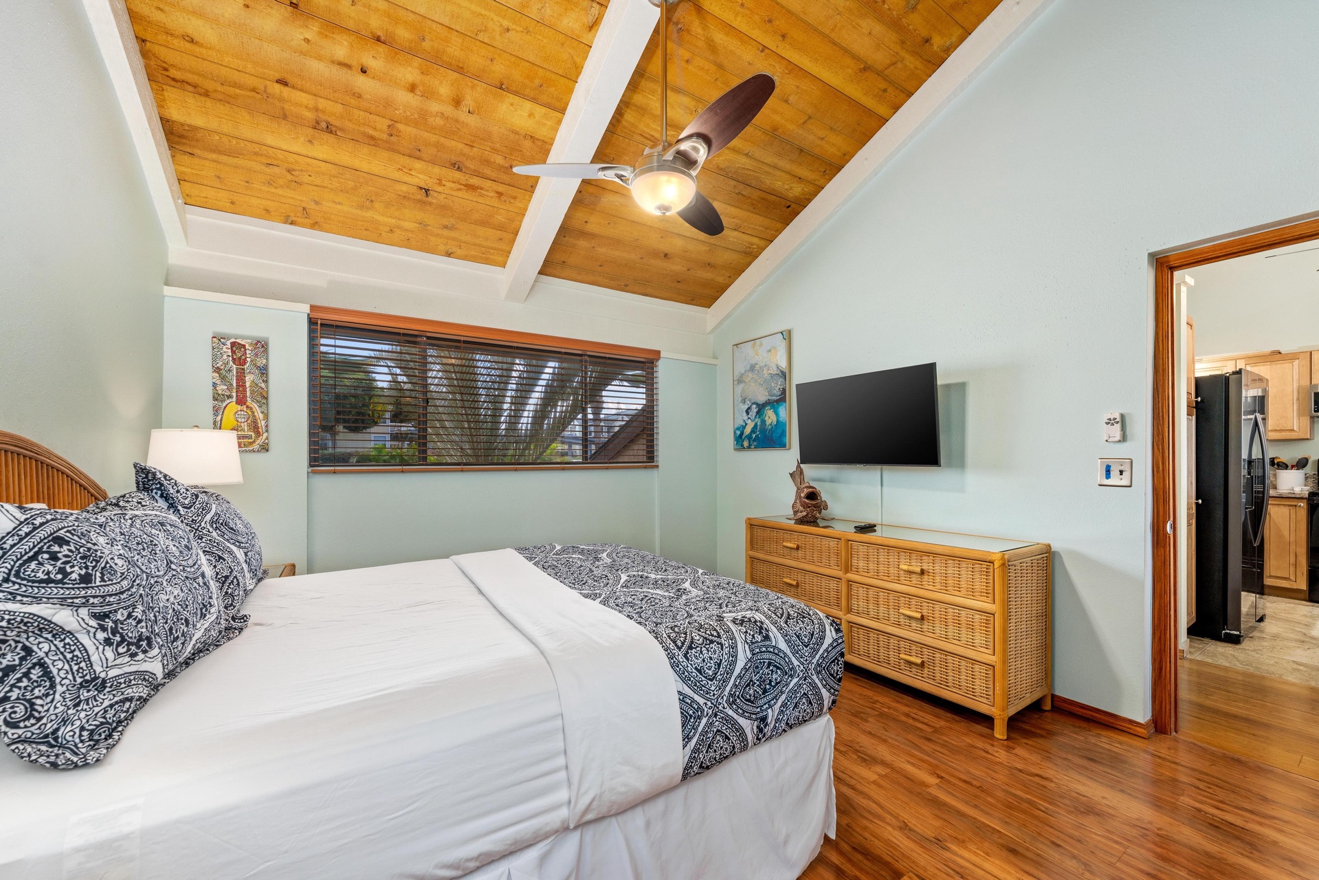 The primary suite is its own retreat with a great vibe with local art. Relax in the king-size bed and enjoy access to the lanai. The primary bathroom has a large tiled shower and plenty of space to be comfortable.