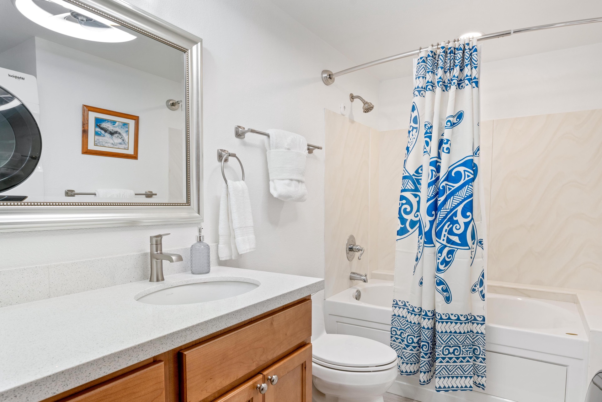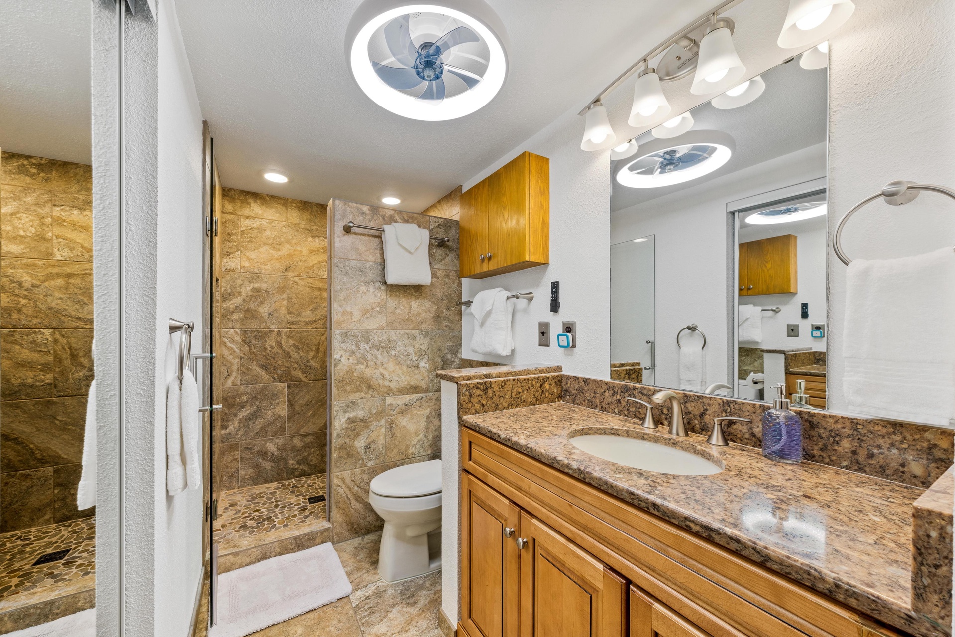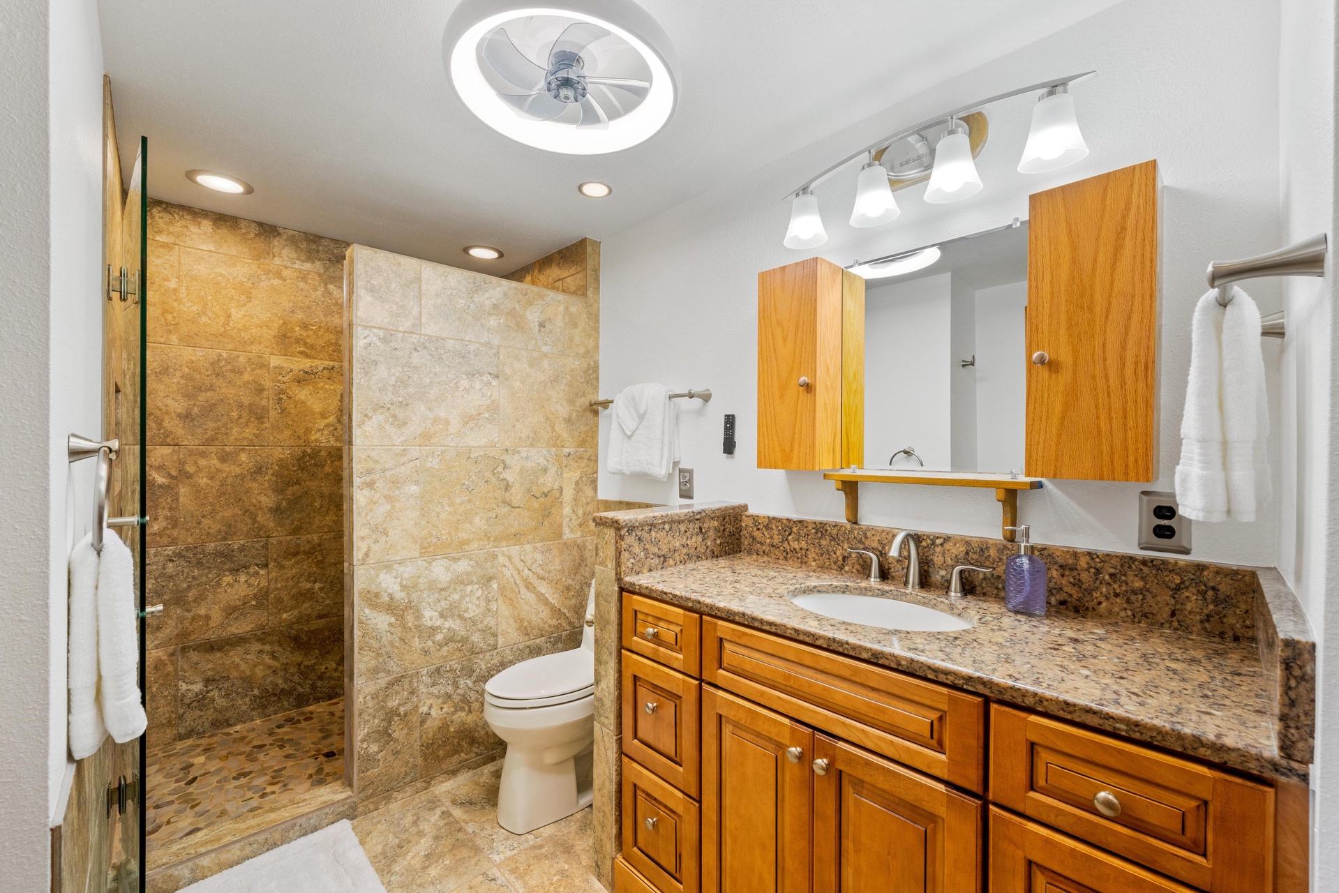 The primary suite is its own retreat with a great vibe with local art. Relax in the king-size bed and enjoy access to the lanai. The primary bathroom has a large tiled shower and plenty of space to be comfortable.