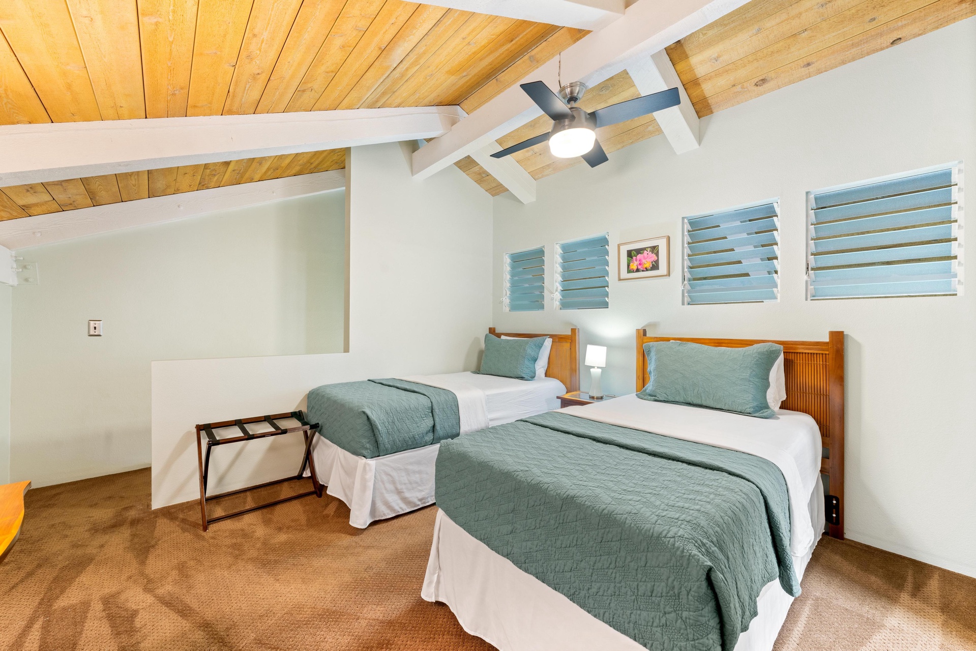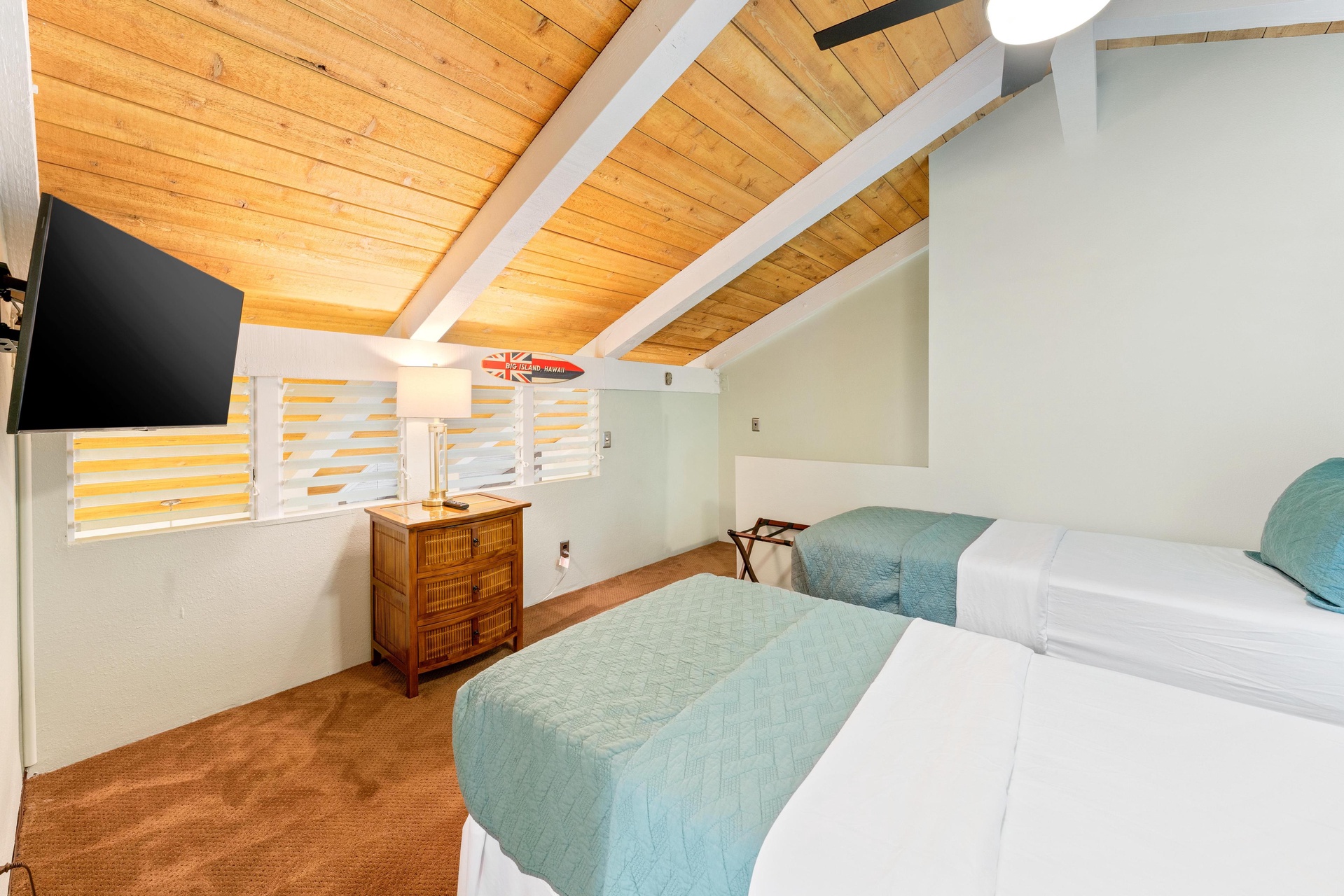 Up a flight of stairs, you have a large loft/bedroom with a smart television and two twin beds, these can be converted to a king upon request and charge. There is a bathroom that has a large tiled shower for guests' use. This is a great room to unwind and relax.