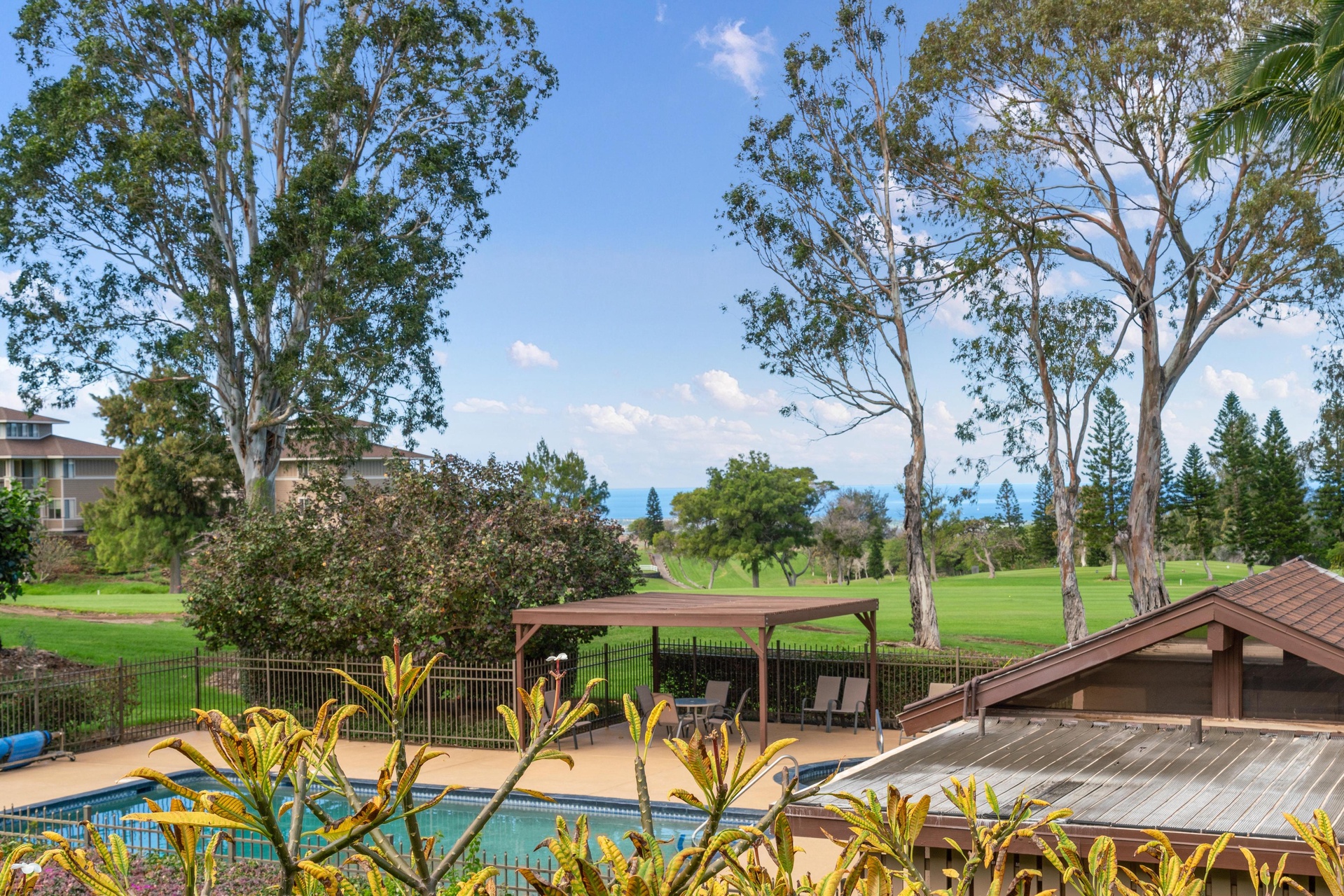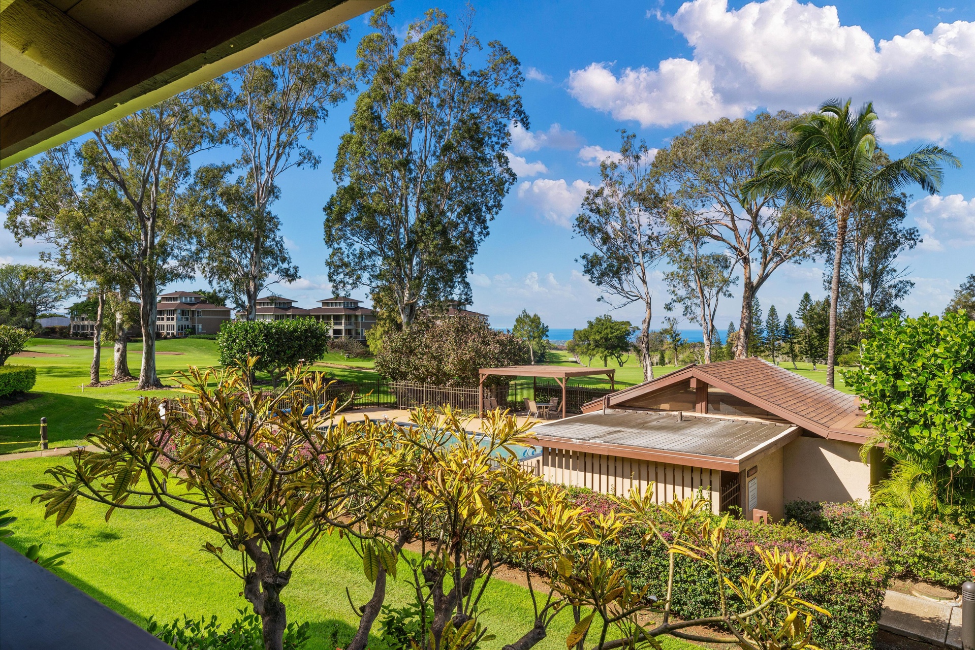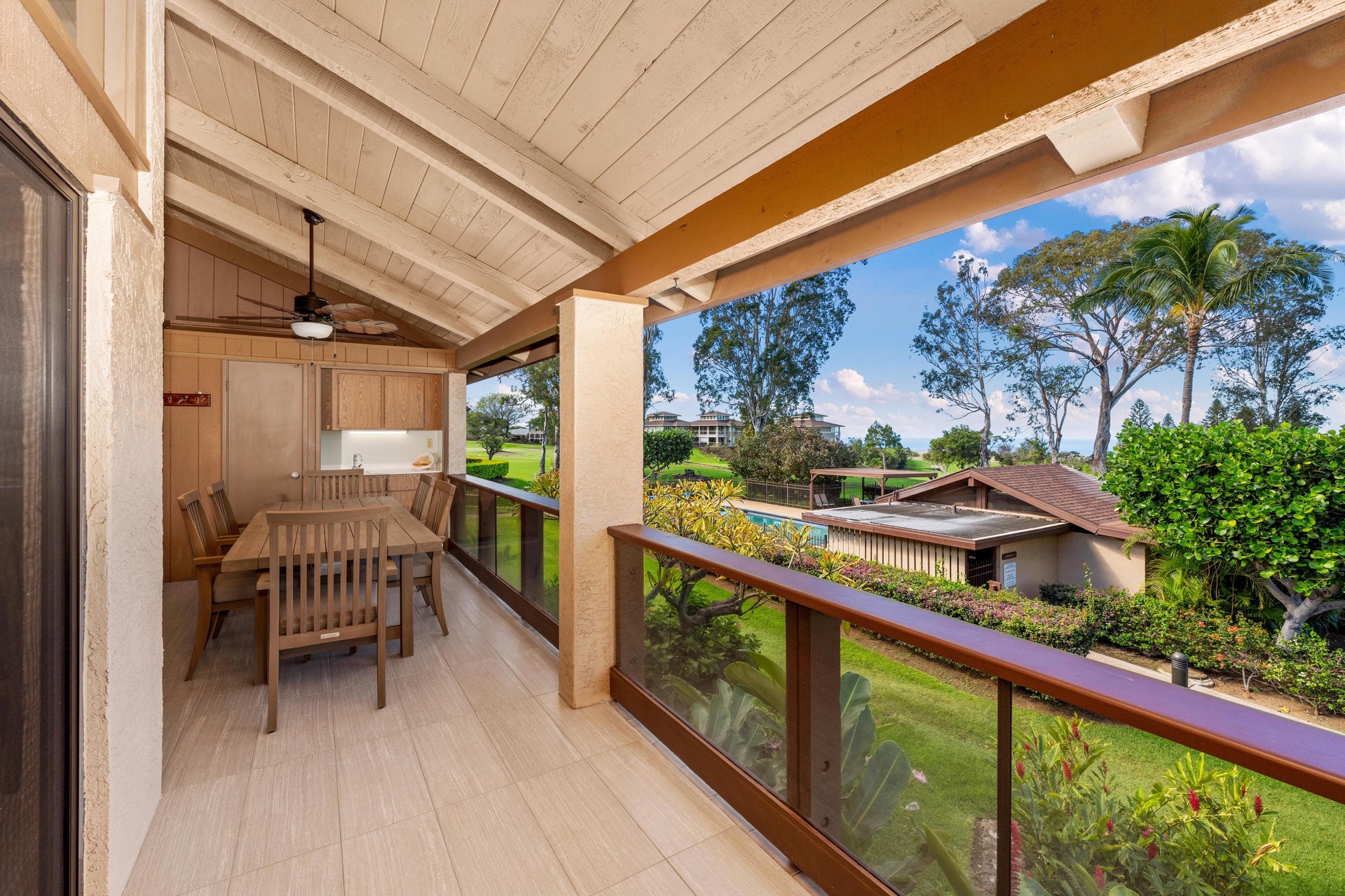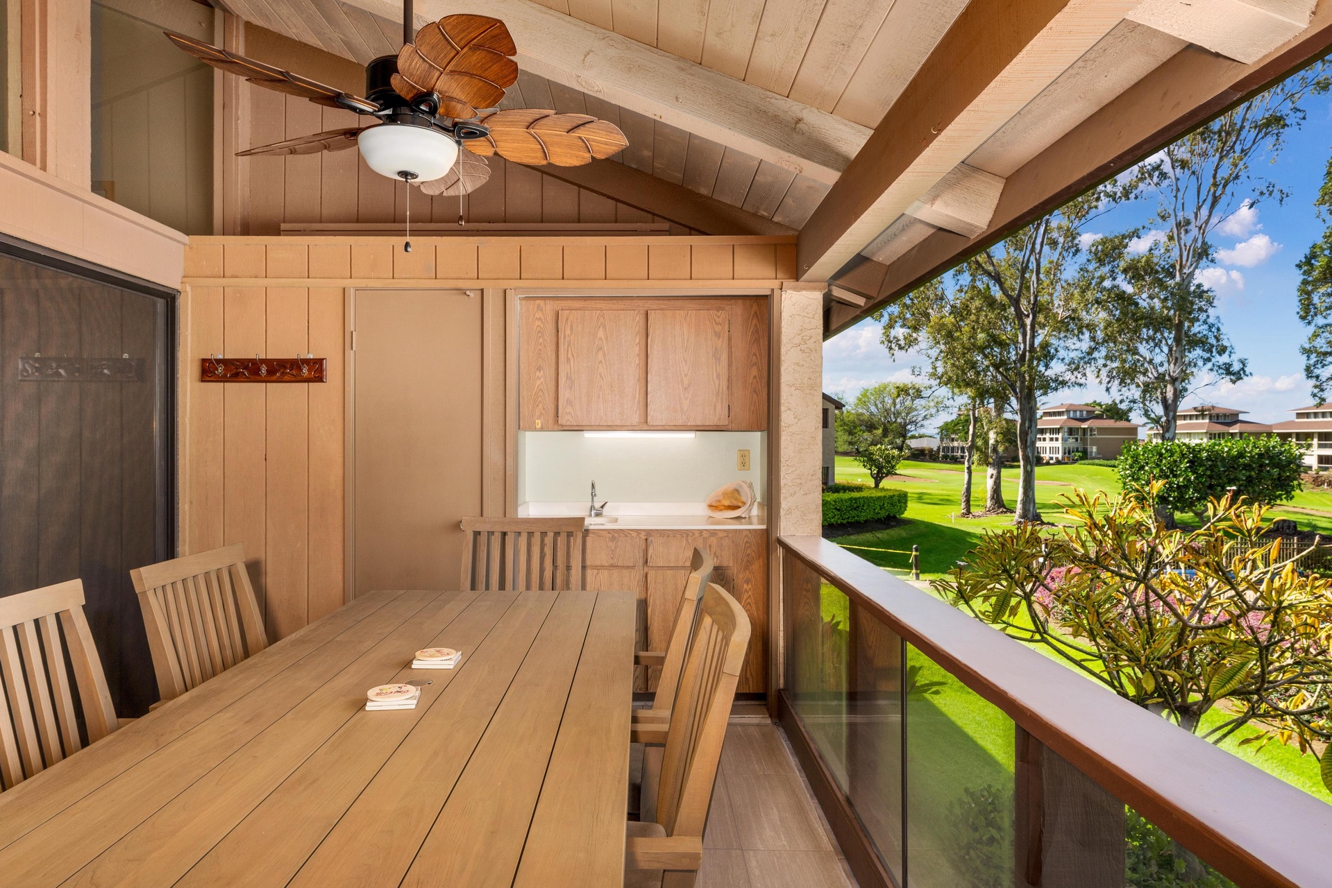 This home is decorated in island style and has an open-plan living area that leads to a lanai with a large dining table. Take in the views of the golf course and the lushly landscaped surroundings over your morning cup of Kona coffee. You can even see the blue Pacific ocean over the trees for peek-a-boo ocean views.