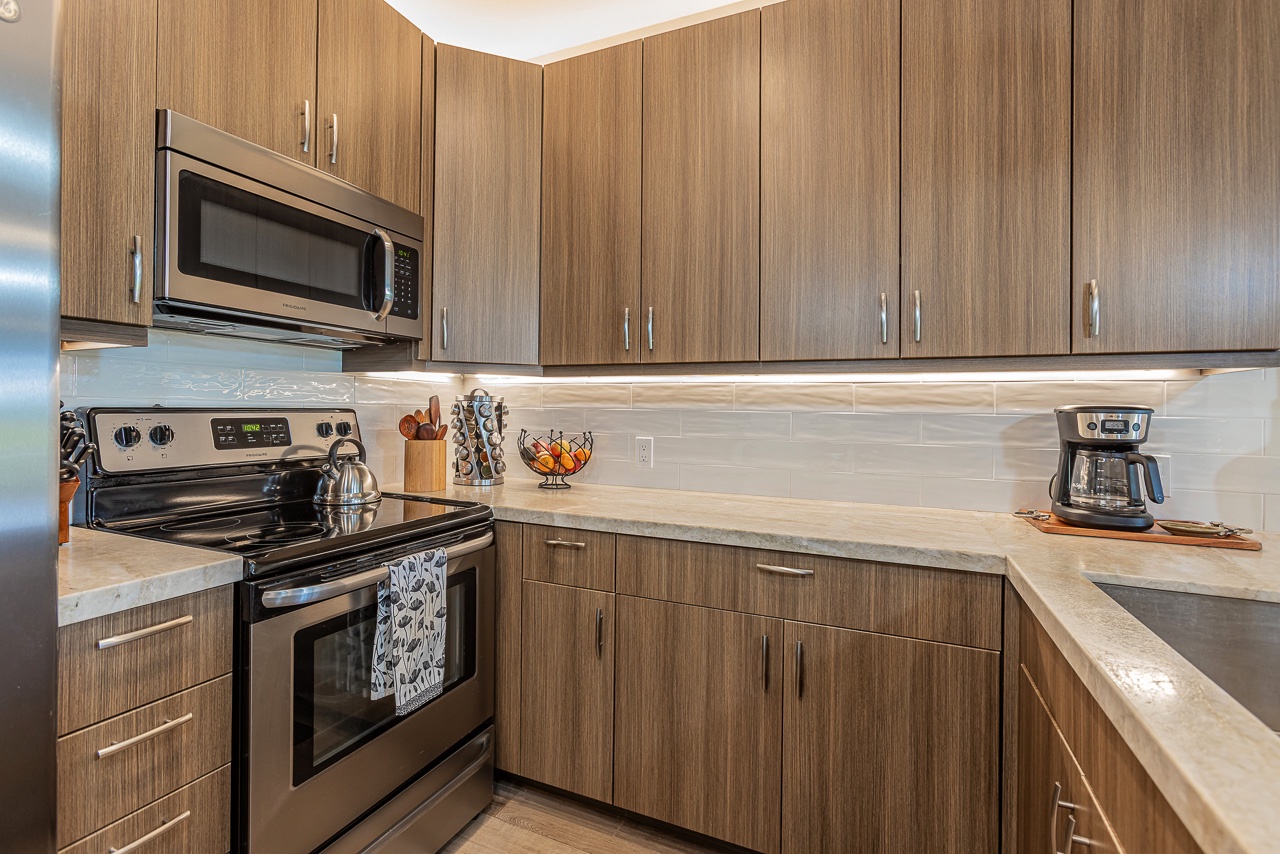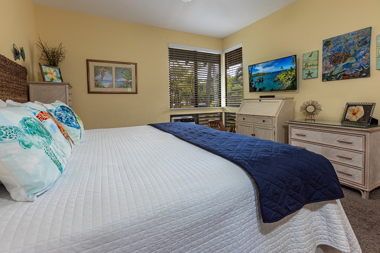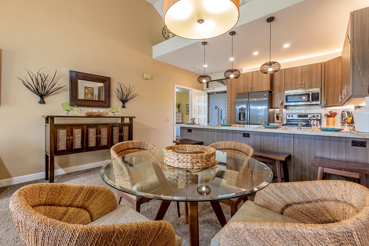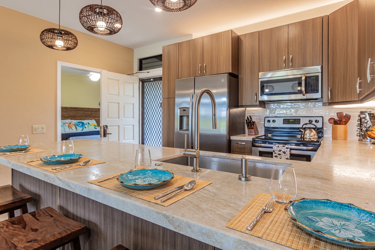 The tasteful and well-thought-out furnishings truly embrace the Hawaiian spirit. Catch up on your favorite shows via upgraded high-speed internet and three Smart TVs, including the large wall-mounted flat-screen in the living room. Blackout curtains in the living area make use of the upgraded sleeper sofa even more comfortable for sleeping up to six guests. The kitchen is updated with stainless appliances, slab granite countertops, and everything you need to enjoy home-cooked meals al fresco on the lanai.