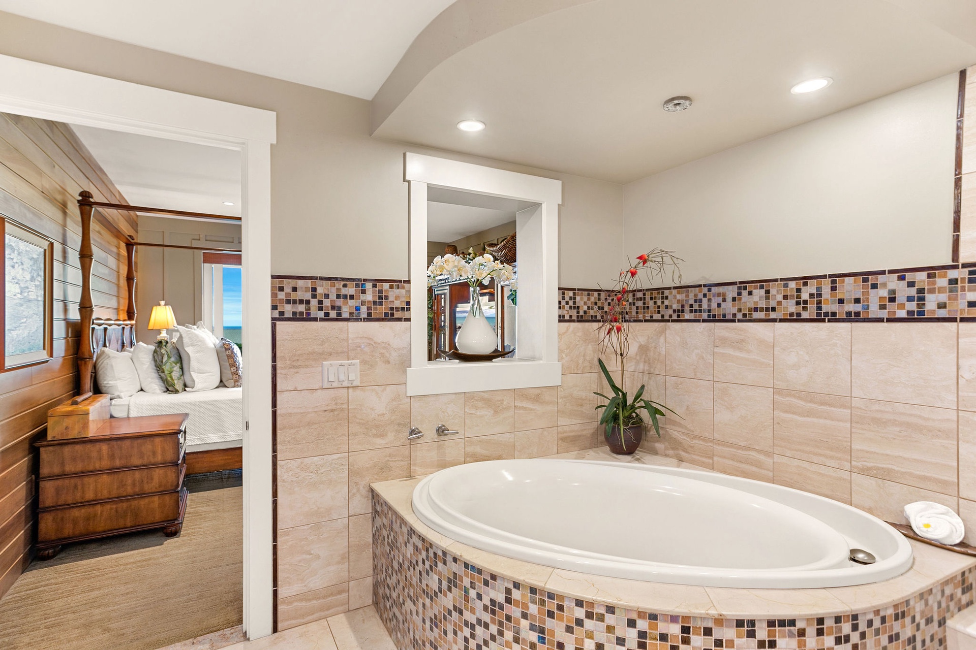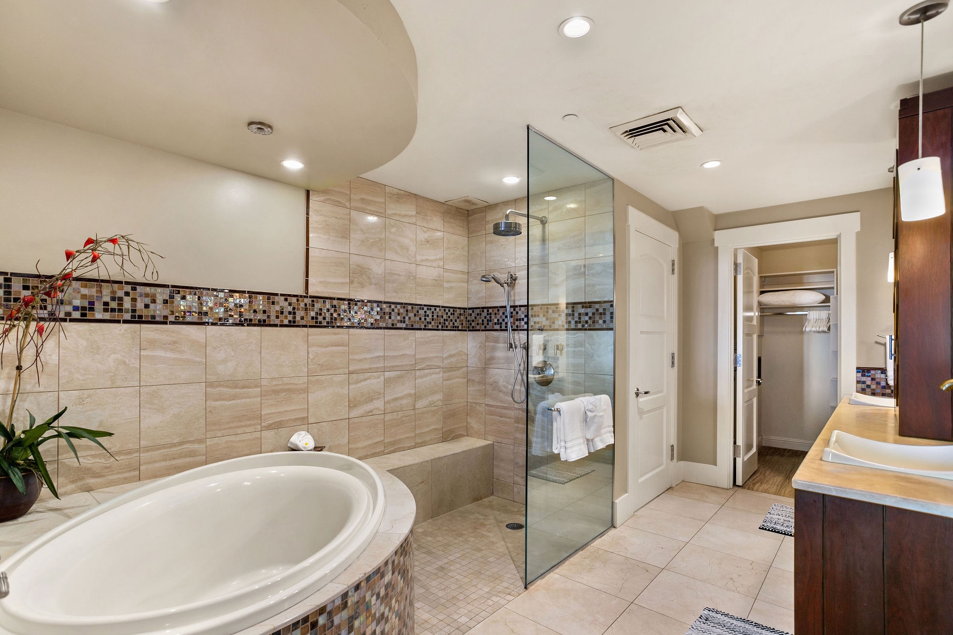 Primary Suite (Lower Level): King bed, ensuite with soaking tub, walk-in shower, dual vanities, walk-in closet, private lanai.
