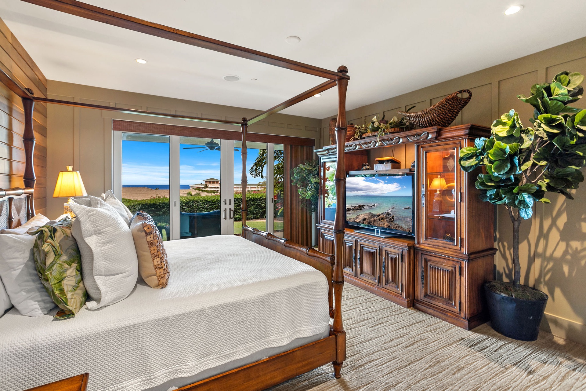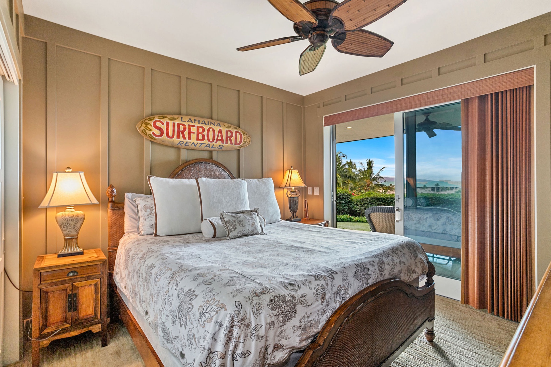 Ground level bedroom flows to the lanai and manicured lawn.