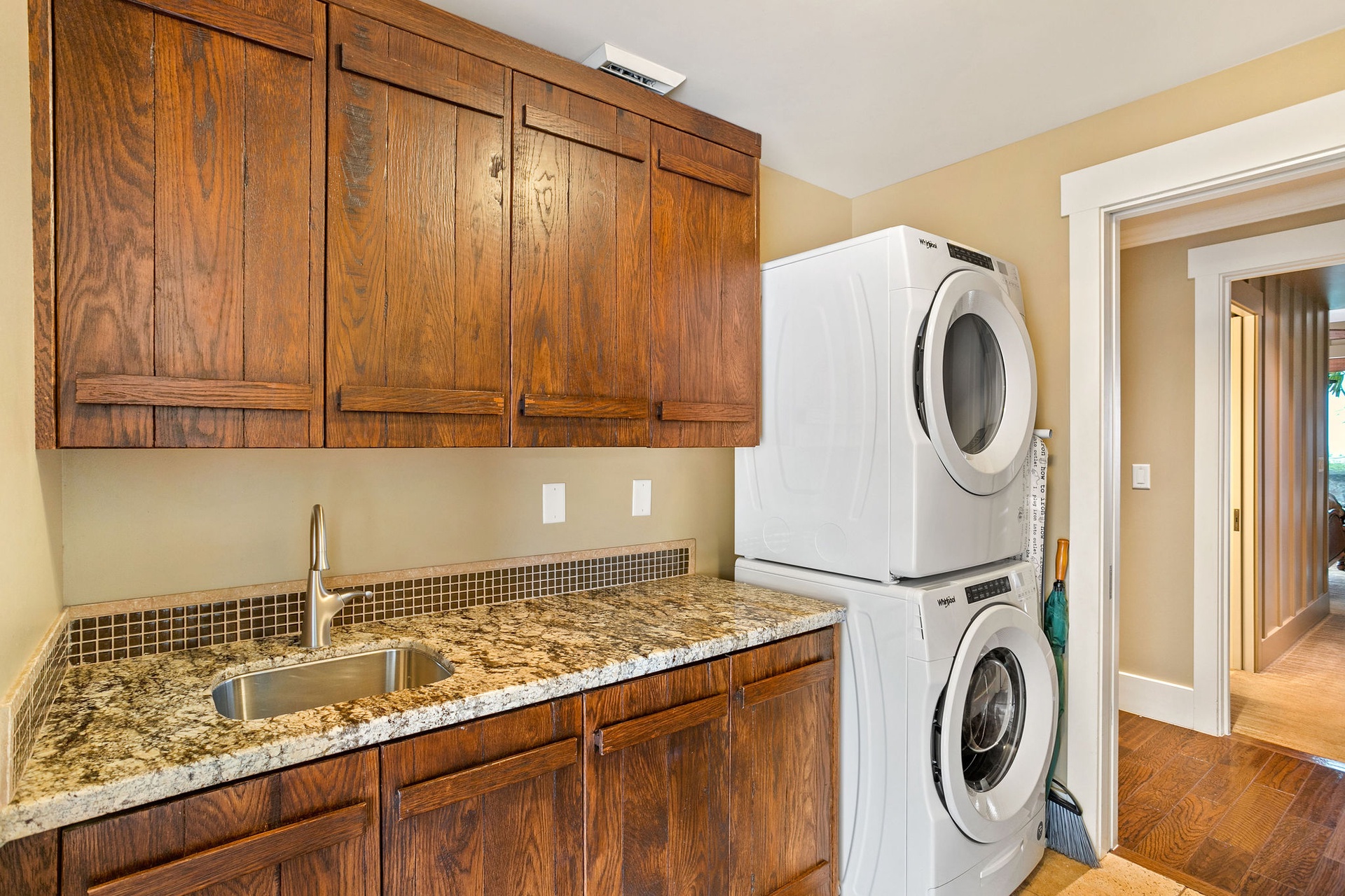 Stacked washer/dryer adjacent to the ground level garage.