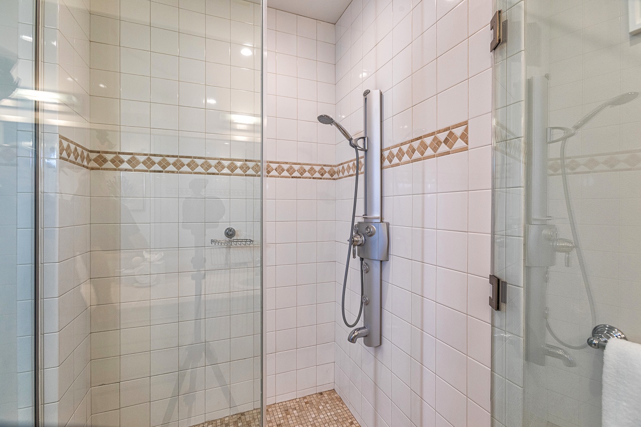 Guest bathroom has a walk in shower.