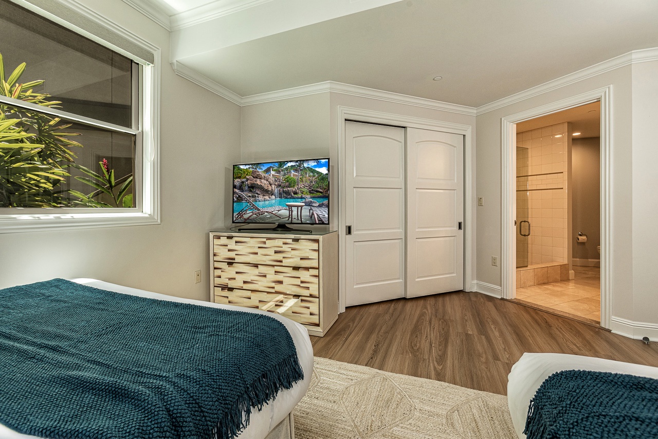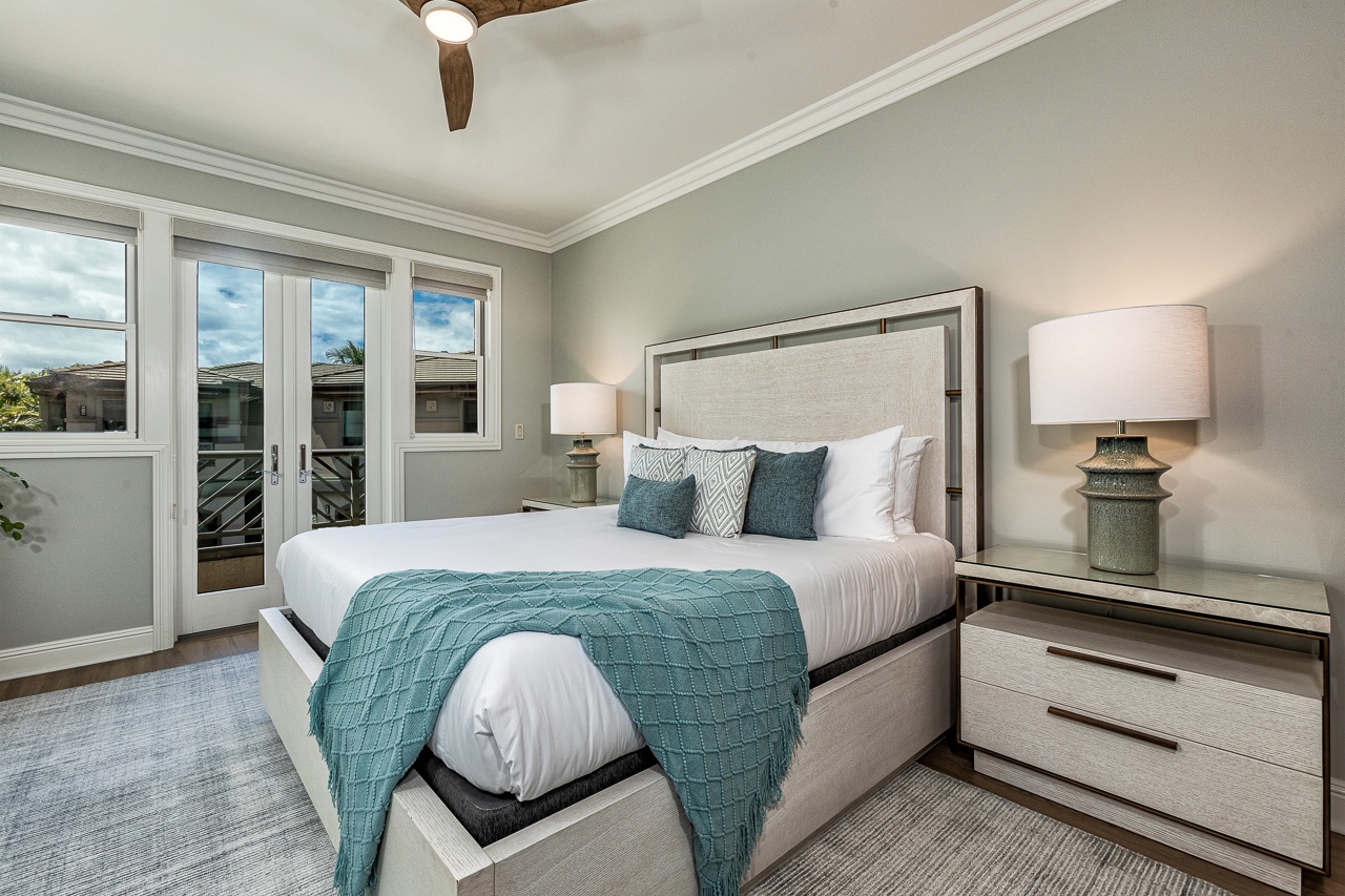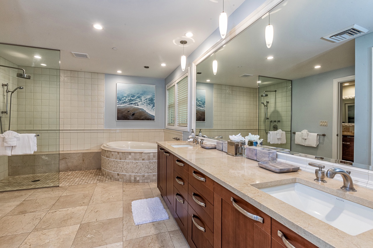 The Primary Bedroom, located on the lower level, features a King Bed, a spacious en suite bathroom with a soaking tub, walk-in shower, dual vanity sinks, and an expansive closet. Step out onto your private ocean-view lanai with comfortable lounge chairs just off the primary room. The second bedroom is also downstairs, offering two queen beds and a full en suite bathroom. The top floor boasts a guest bedroom with a King-sized bed and a private en suite bathroom.