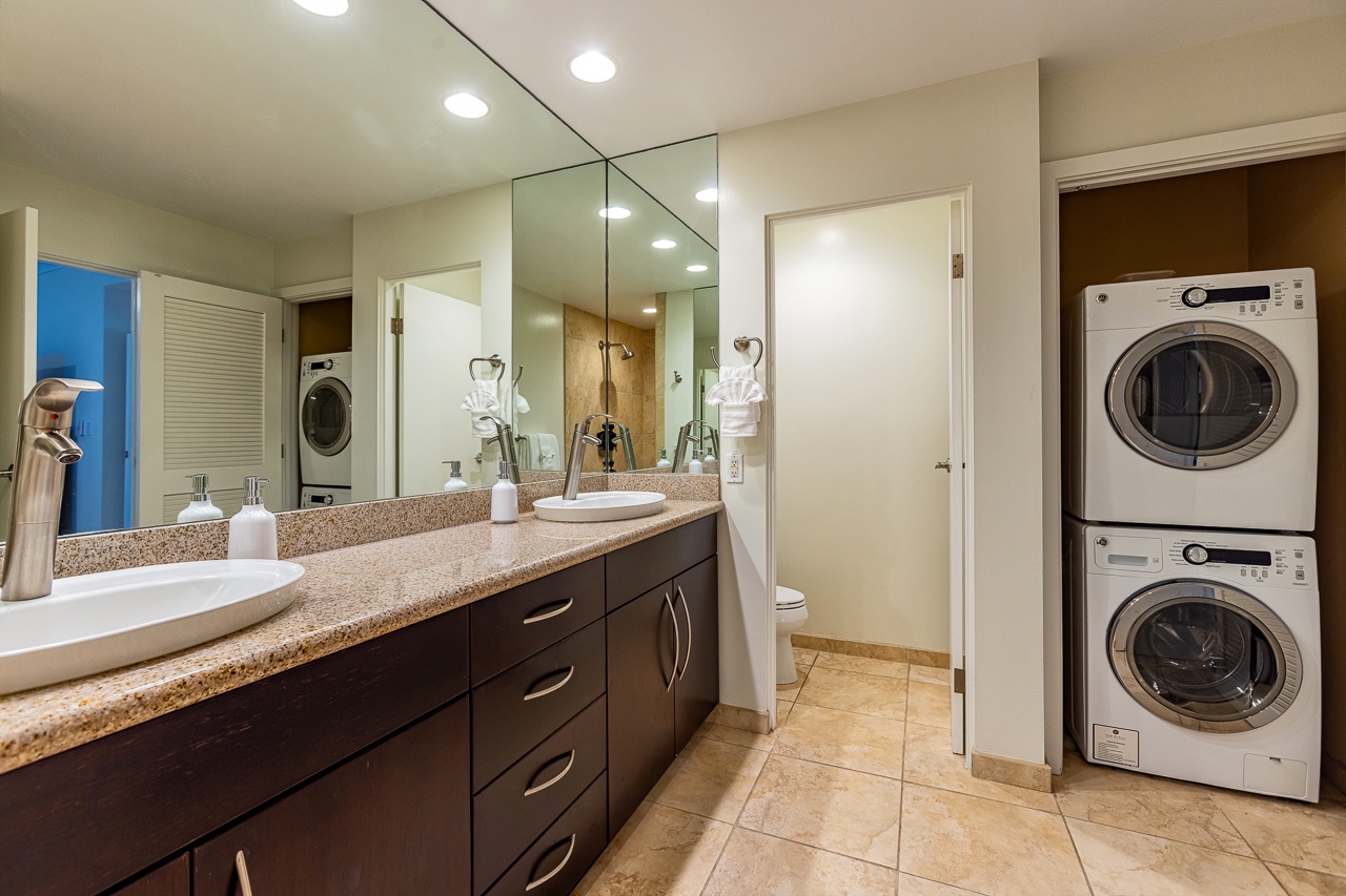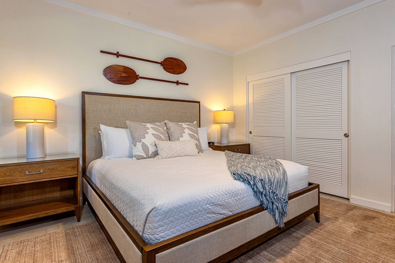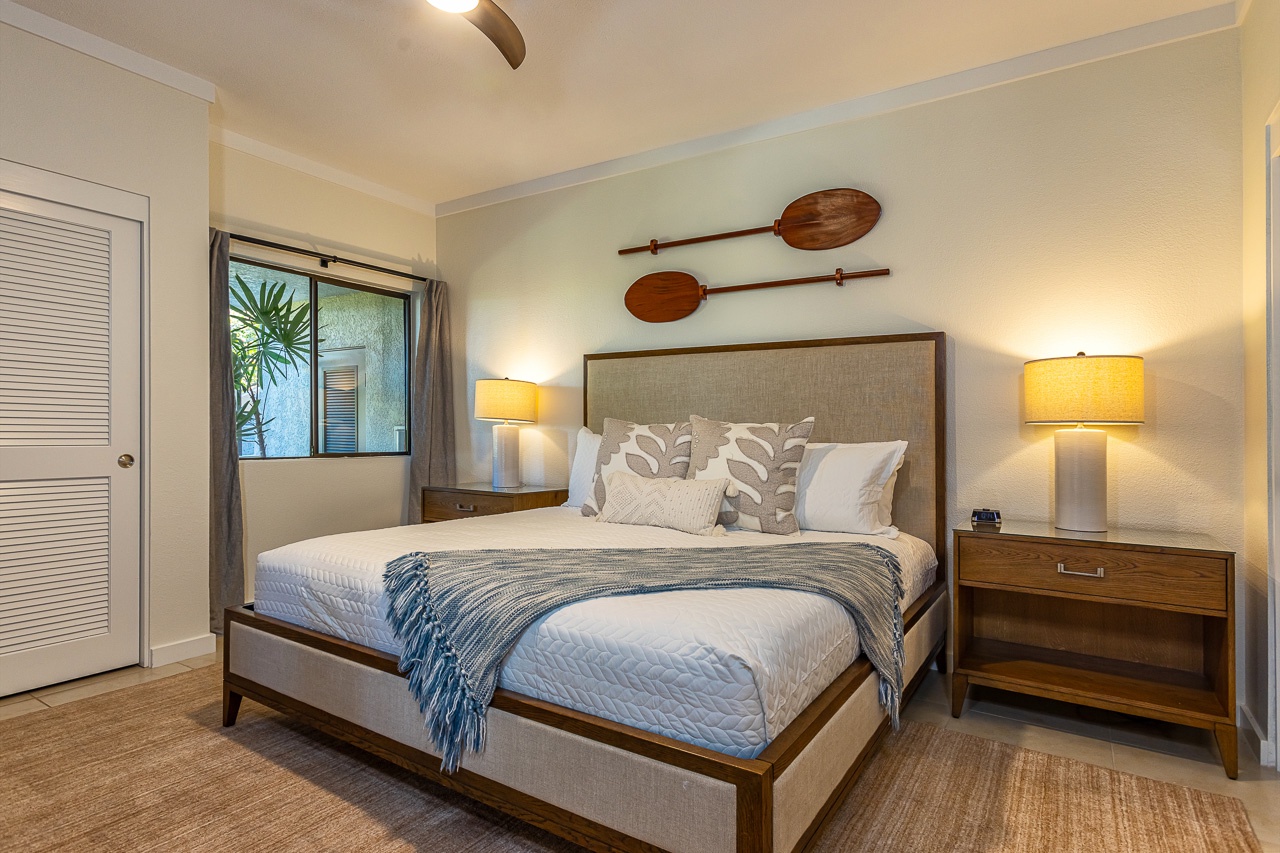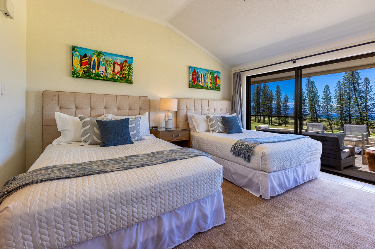 The guest bedroom is equally inviting, boasting two queen-size beds to accommodate your family or friends with utmost comfort. A thoughtfully designed second bathroom ensures that everyone has their own space and privacy. Step out onto your private lanai to greet the day with awe-inspiring views.