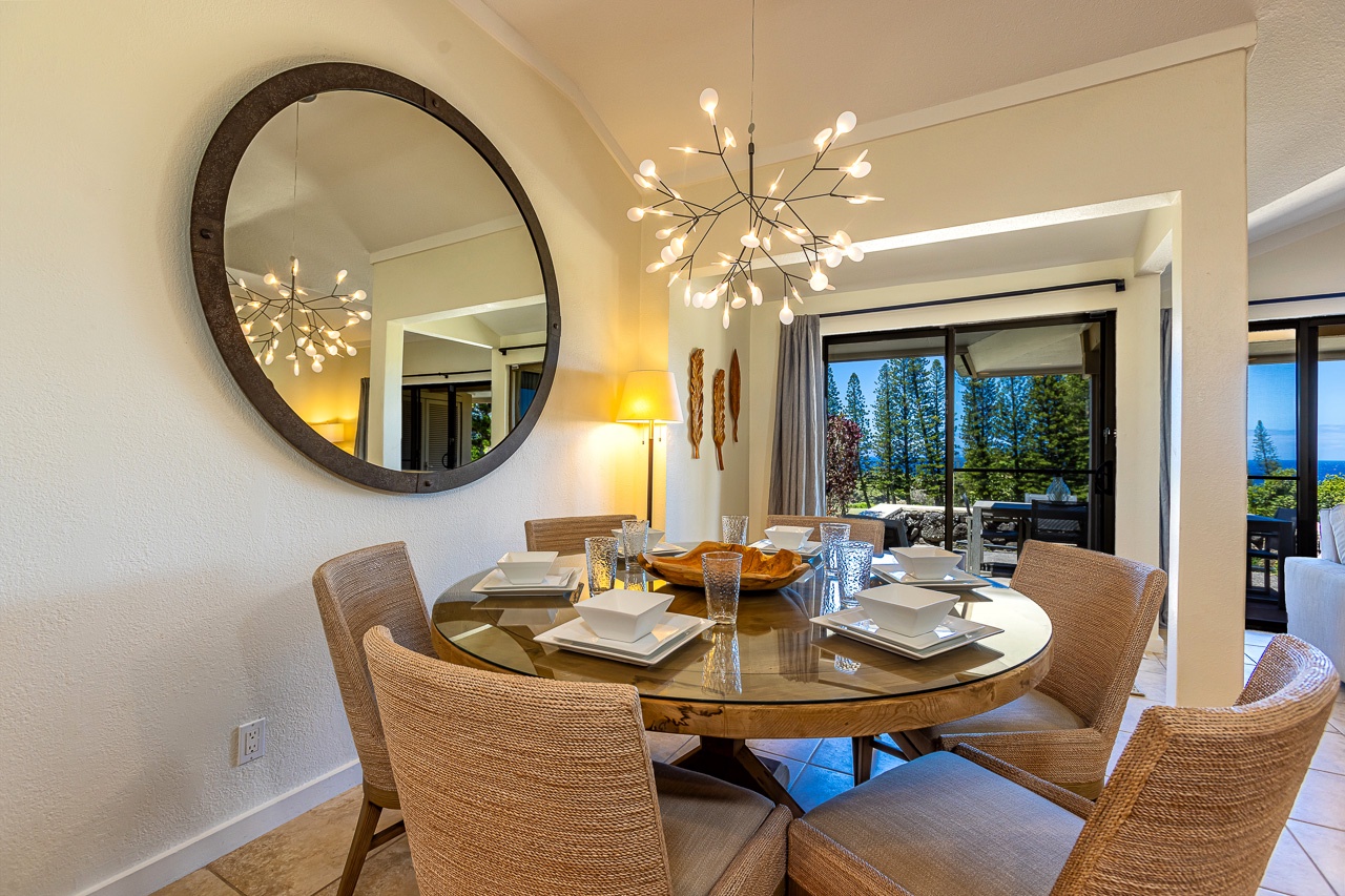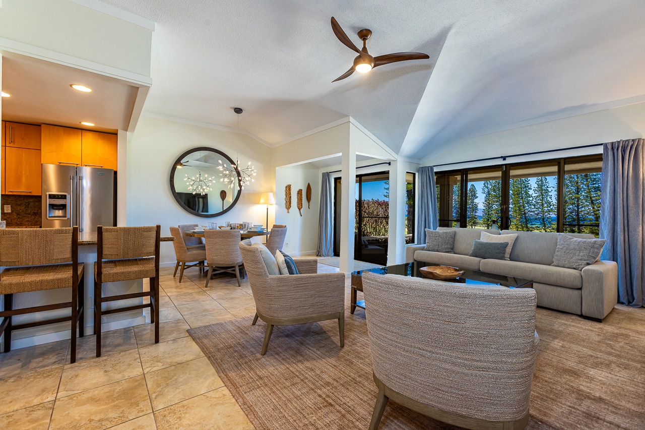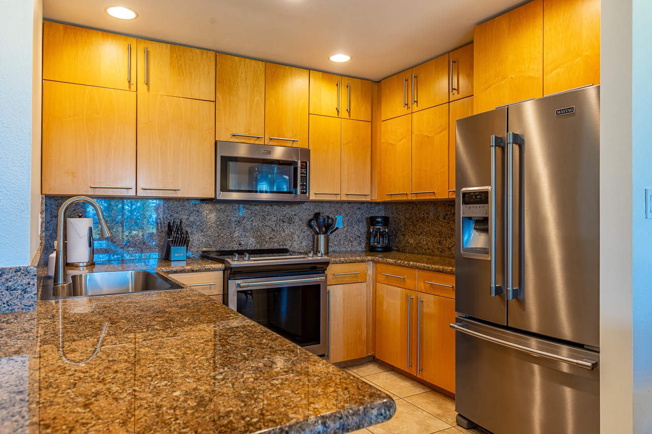 Kitchen: Cooking in paradise becomes a delight in this fully equipped, nicely updated kitchen. Ample prep space makes meal preparation a breeze. Dine indoors with seating for six or al fresco on the lanai, where the panoramic ocean and golf course views create the perfect backdrop for memorable meals.