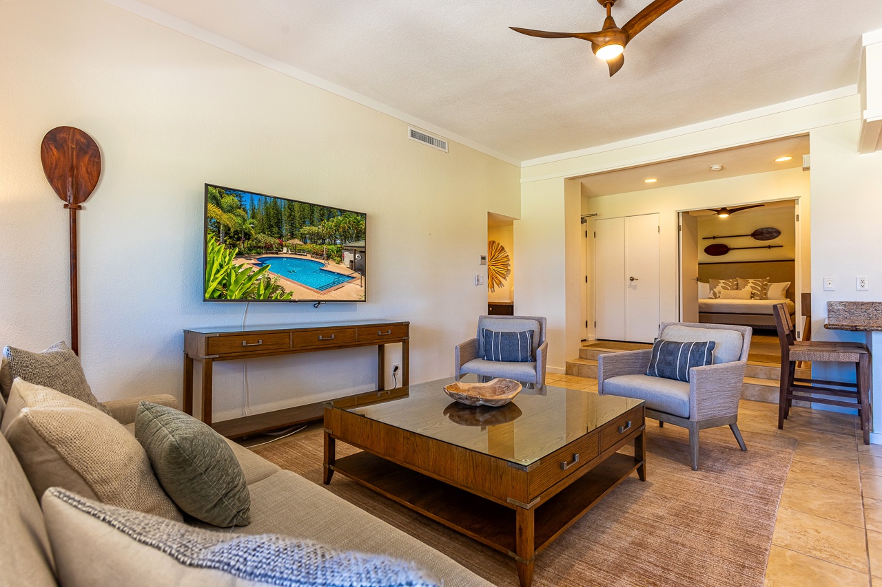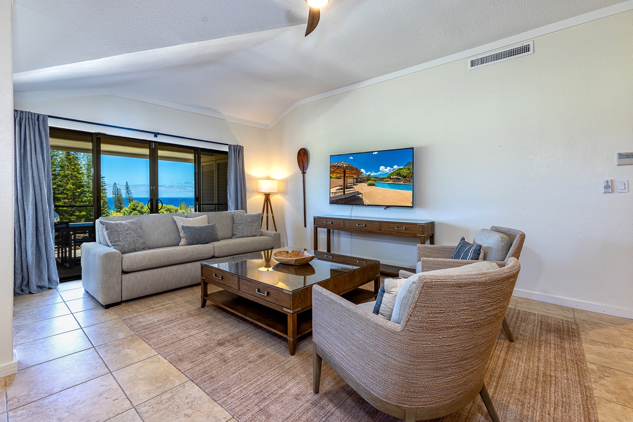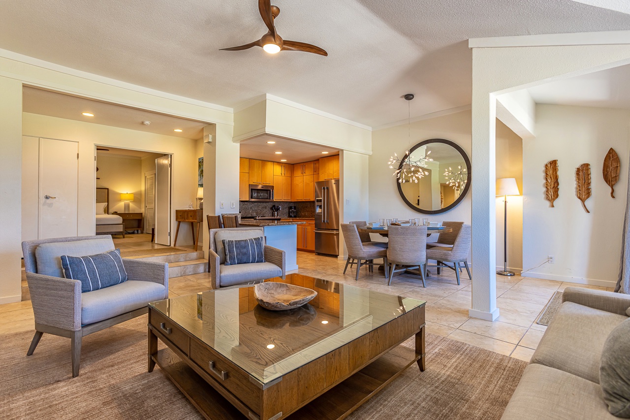 Kitchen: Cooking in paradise becomes a delight in this fully equipped, nicely updated kitchen. Ample prep space makes meal preparation a breeze. Dine indoors with seating for six or al fresco on the lanai, where the panoramic ocean and golf course views create the perfect backdrop for memorable meals.