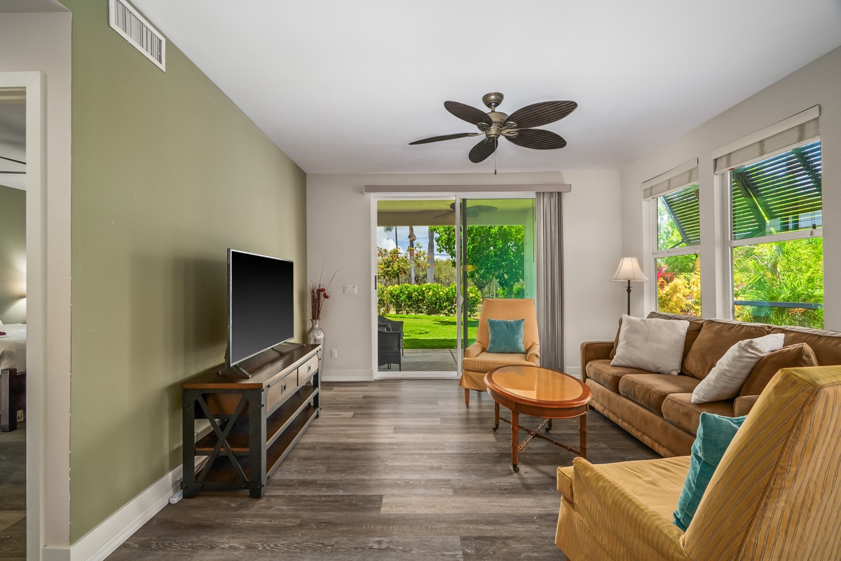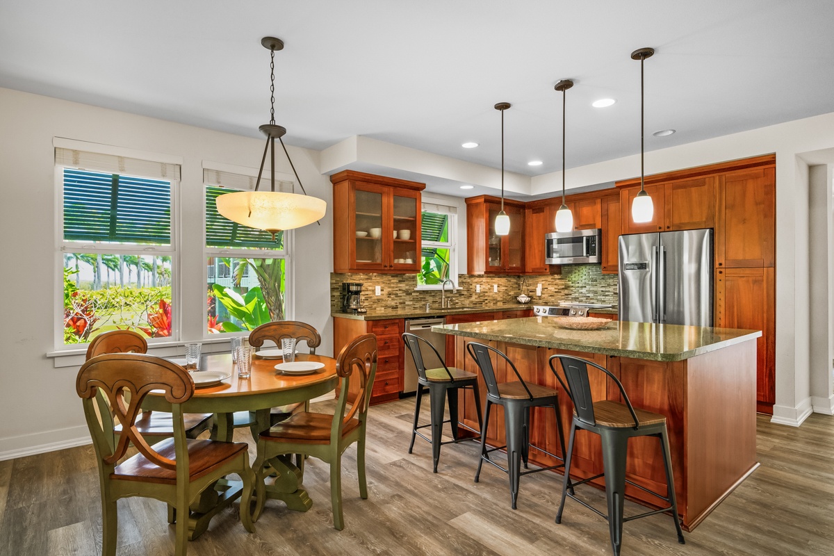 The living space seamlessly blends indoor-outdoor Hawaiian living. The gourmet kitchen features premium stainless steel appliances, elegant granite countertops, and an island with bar seating for three, plus a dining table for four. The bright, window-filled living room showcases comfortable furnishings and a flatscreen TV, while sliding glass doors open to your private lanai—the perfect vantage point for spectacular Kauai sunsets.