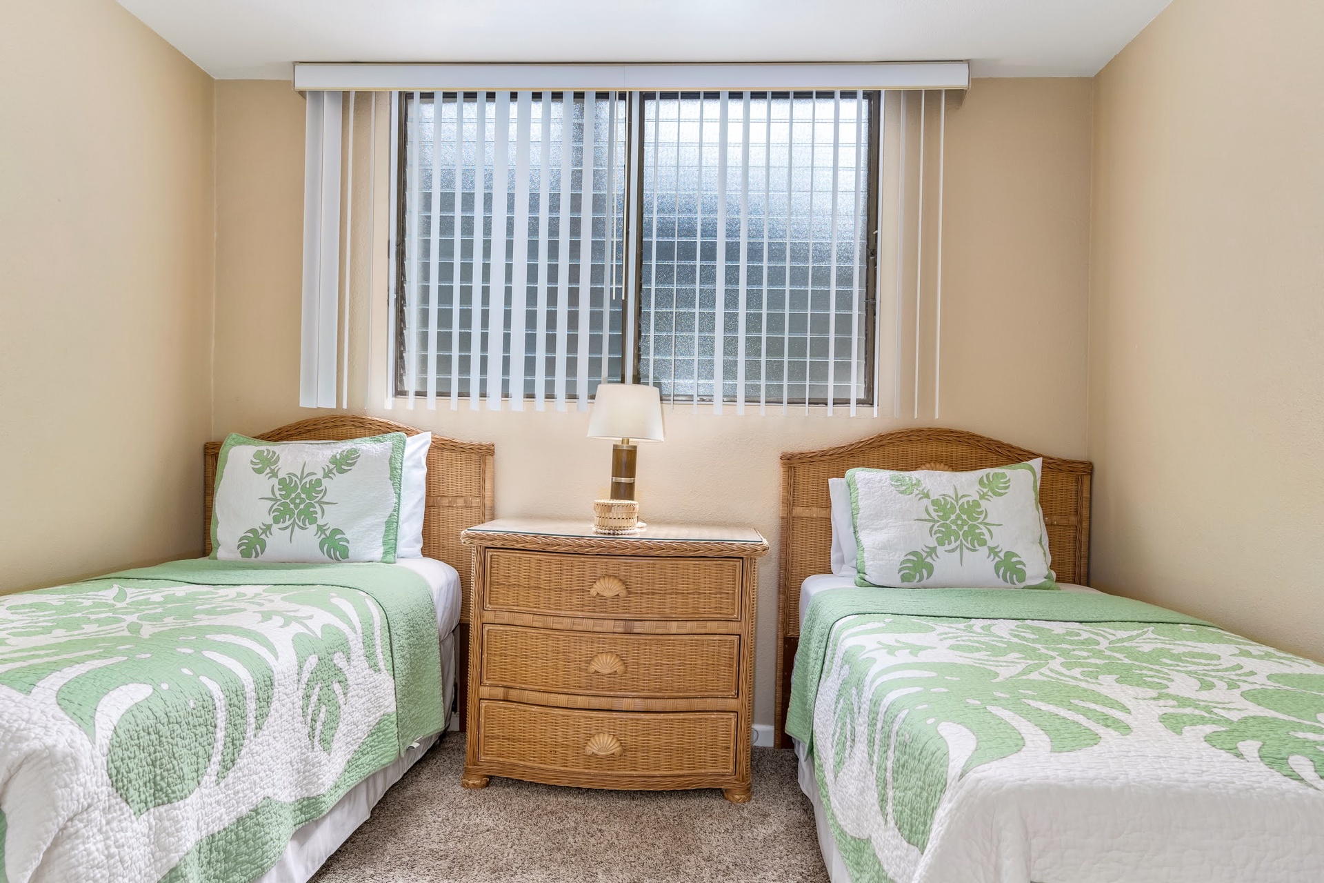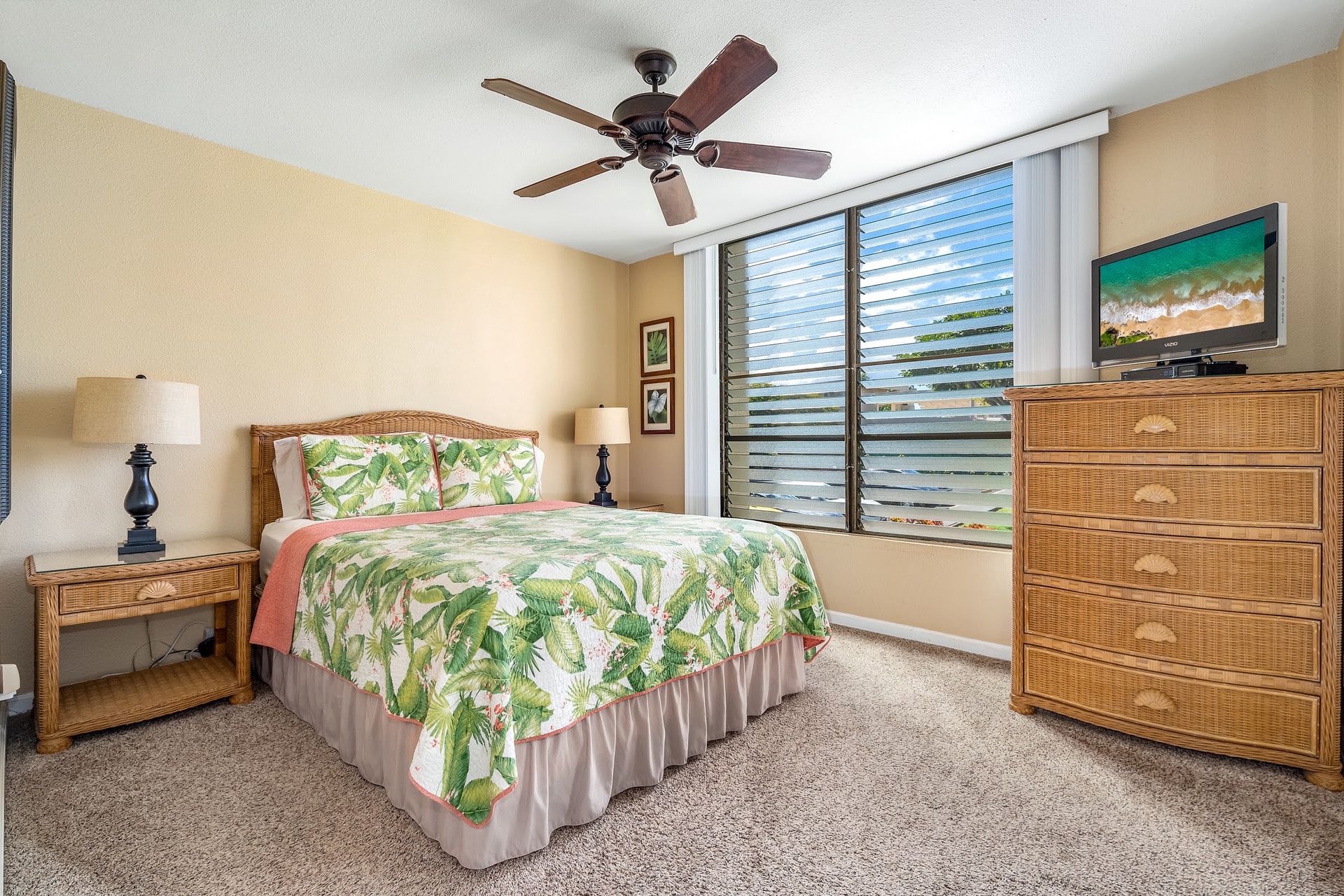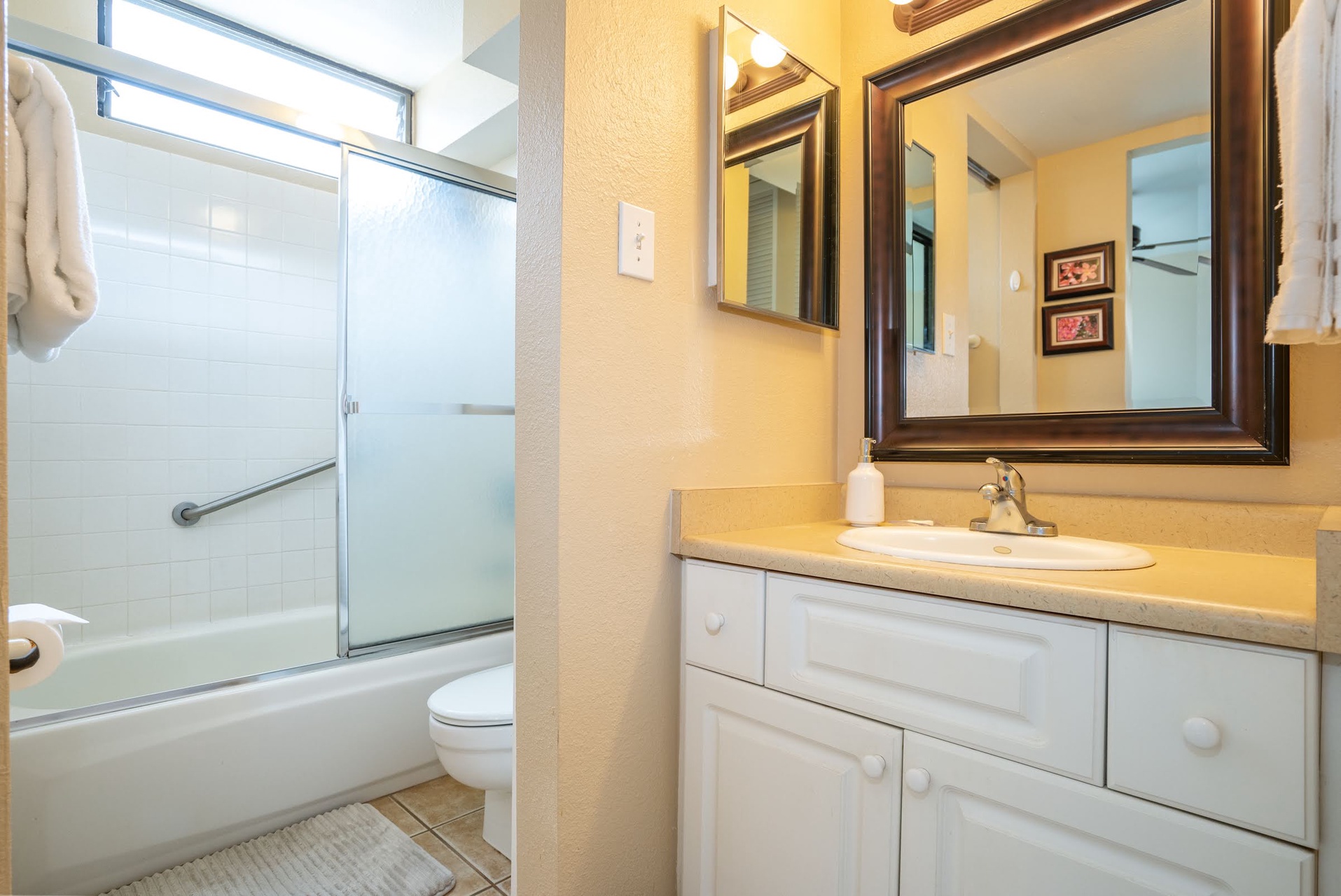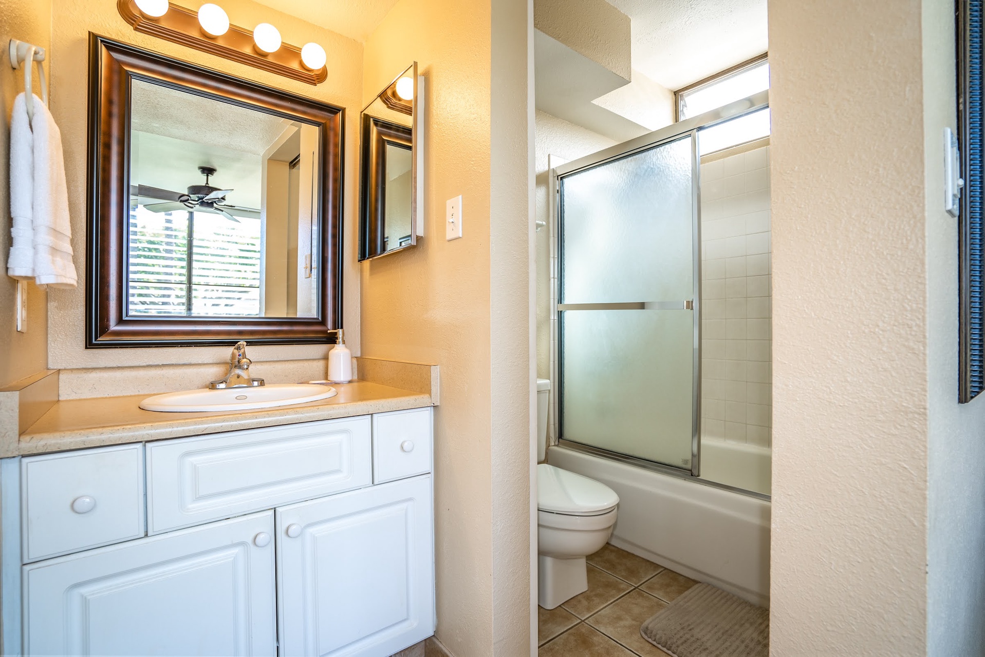 The charming guest bedroom brings the tropical feel in with beautiful linens and twin beds. The guest bath is conveniently adjacent with a tub/shower combo. The primary bedroom features a Queen bed for the perfect night's rest, with a flat-screen TV, ceiling fan, and an en suite bathroom.