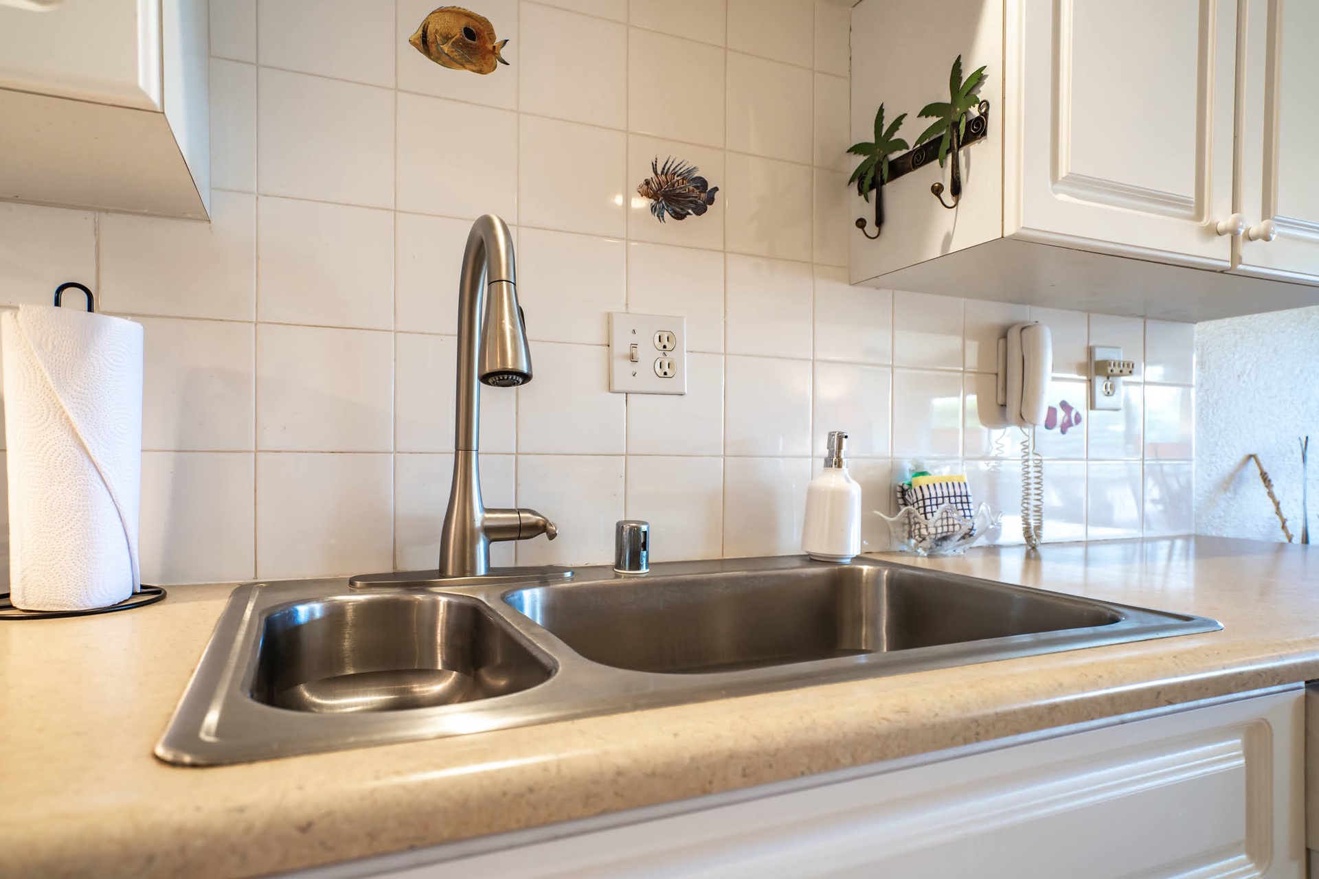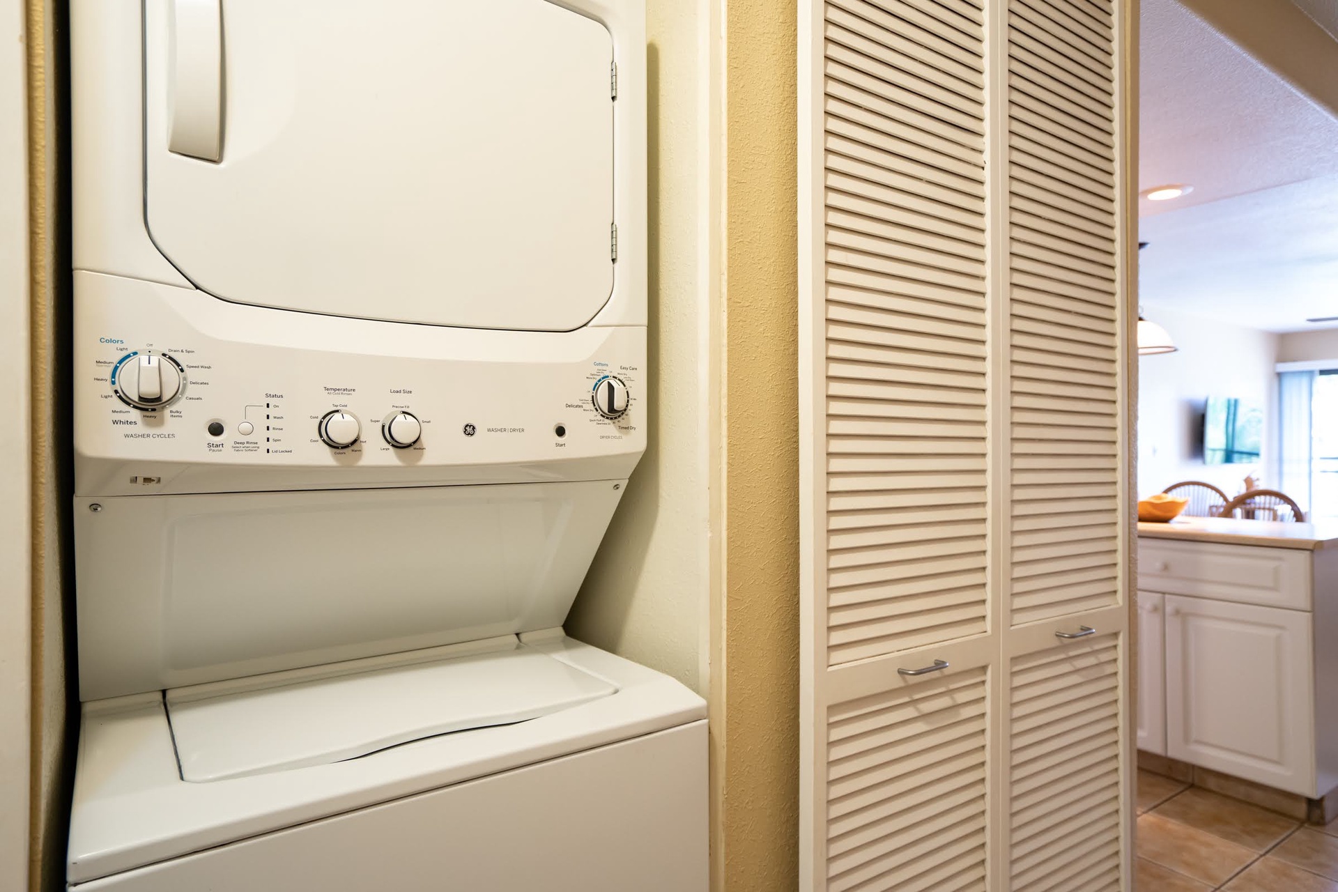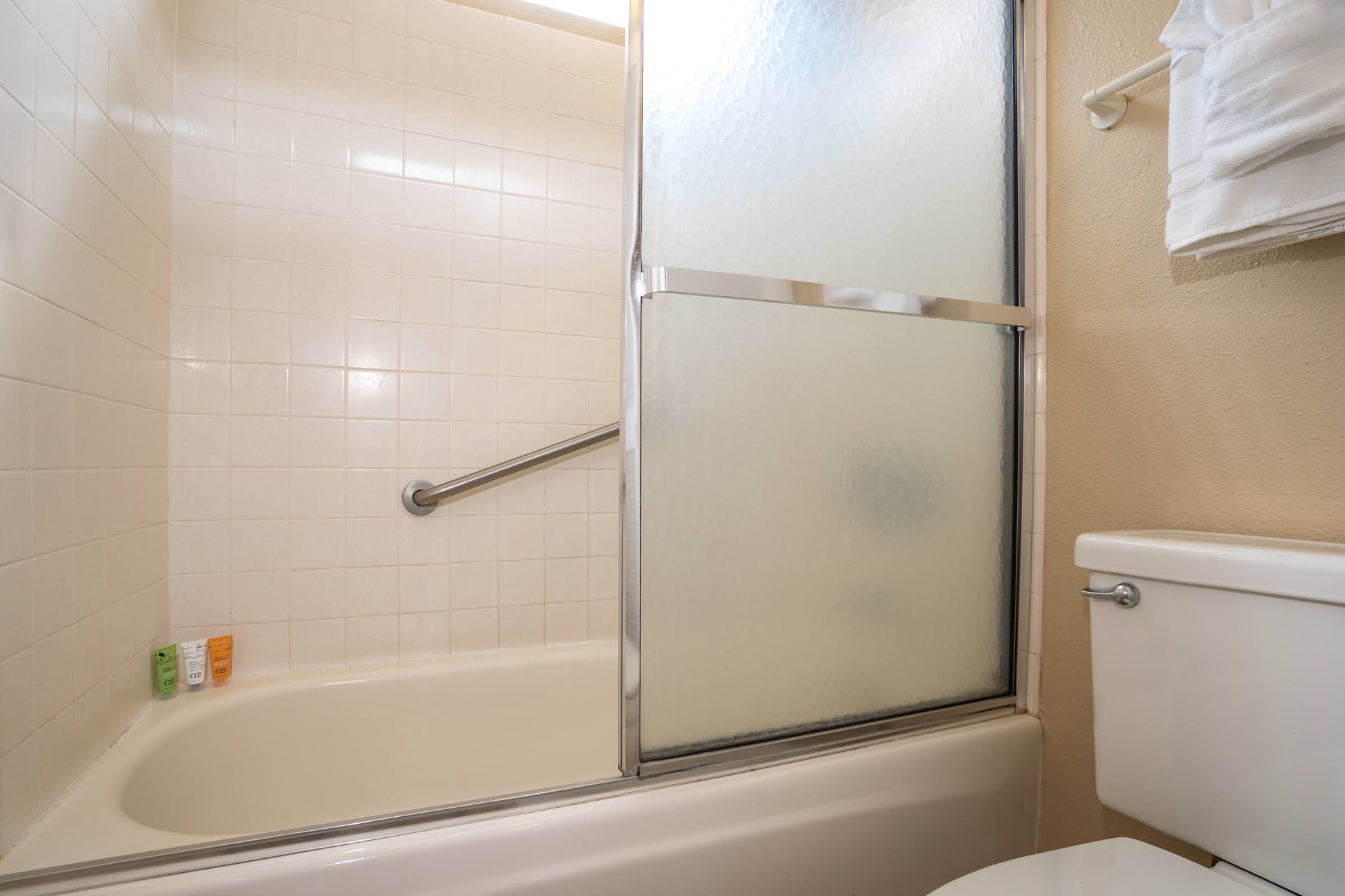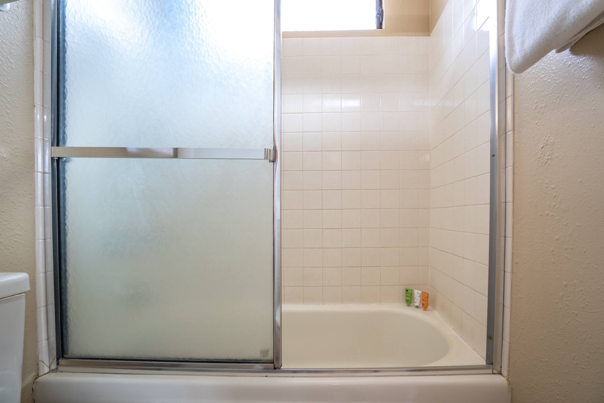 The charming guest bedroom brings the tropical feel in with beautiful linens and twin beds. The guest bath is conveniently adjacent with a tub/shower combo. The primary bedroom features a Queen bed for the perfect night's rest, with a flat-screen TV, ceiling fan, and an en suite bathroom.