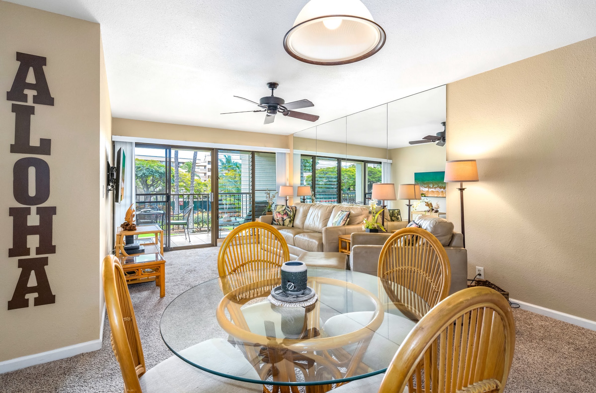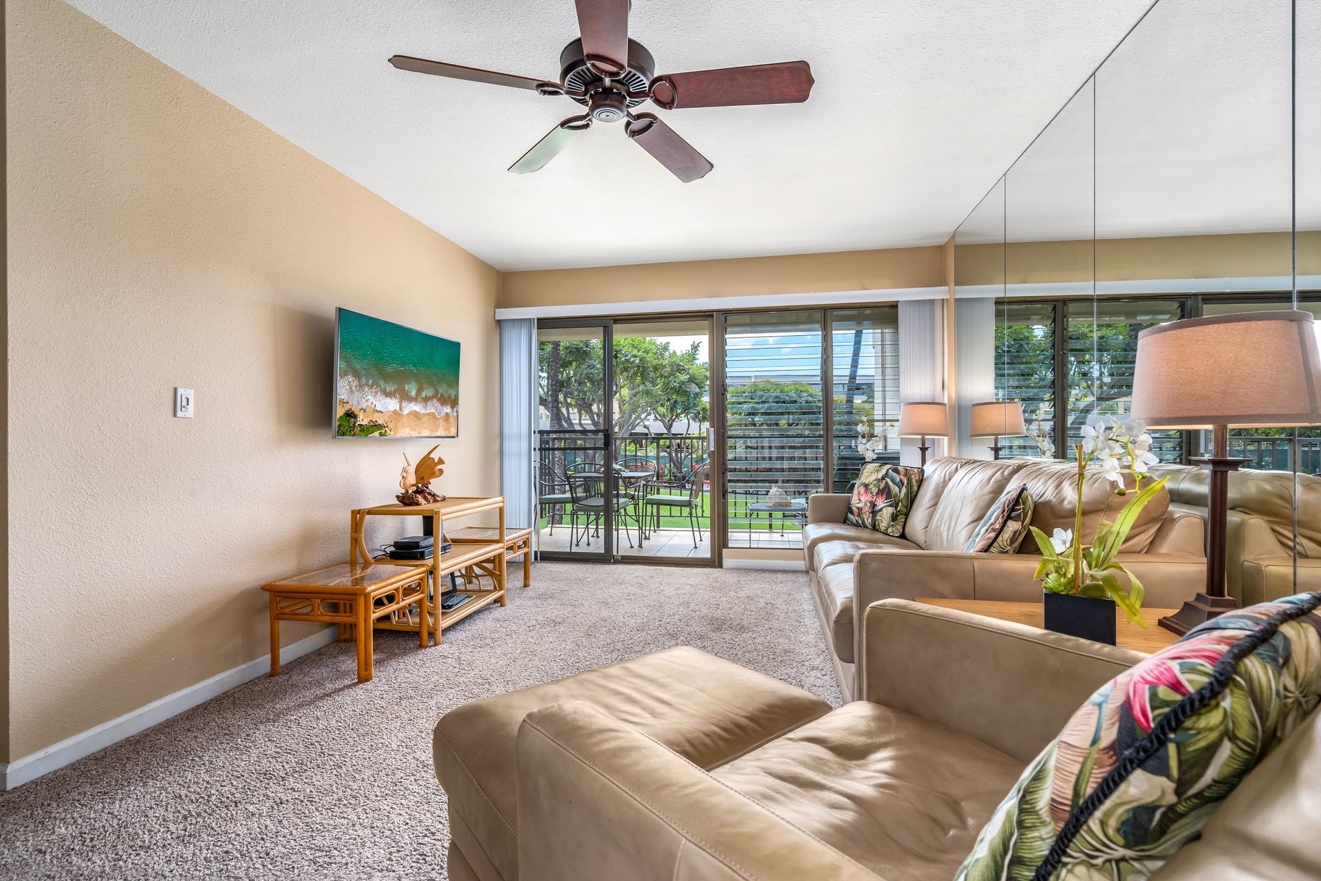 Kihei Akahi C319, Near everything Kihei has to offer! This 2-bedroom/2-bath condo offers the perfect Hawaiian getaway for families or couples traveling together. As you enter, you will be greeted by the light and airy living space. Kick up your feet after a fun-filled day on Maui, complete with a convertible sofa, flat-screen TV, and ceiling fan. Spend your days relaxing on your private lanai, with seating for four. Take in the lovely garden views.