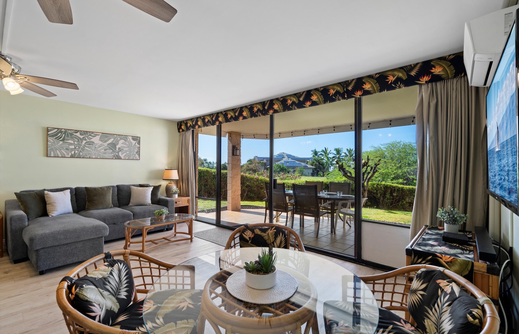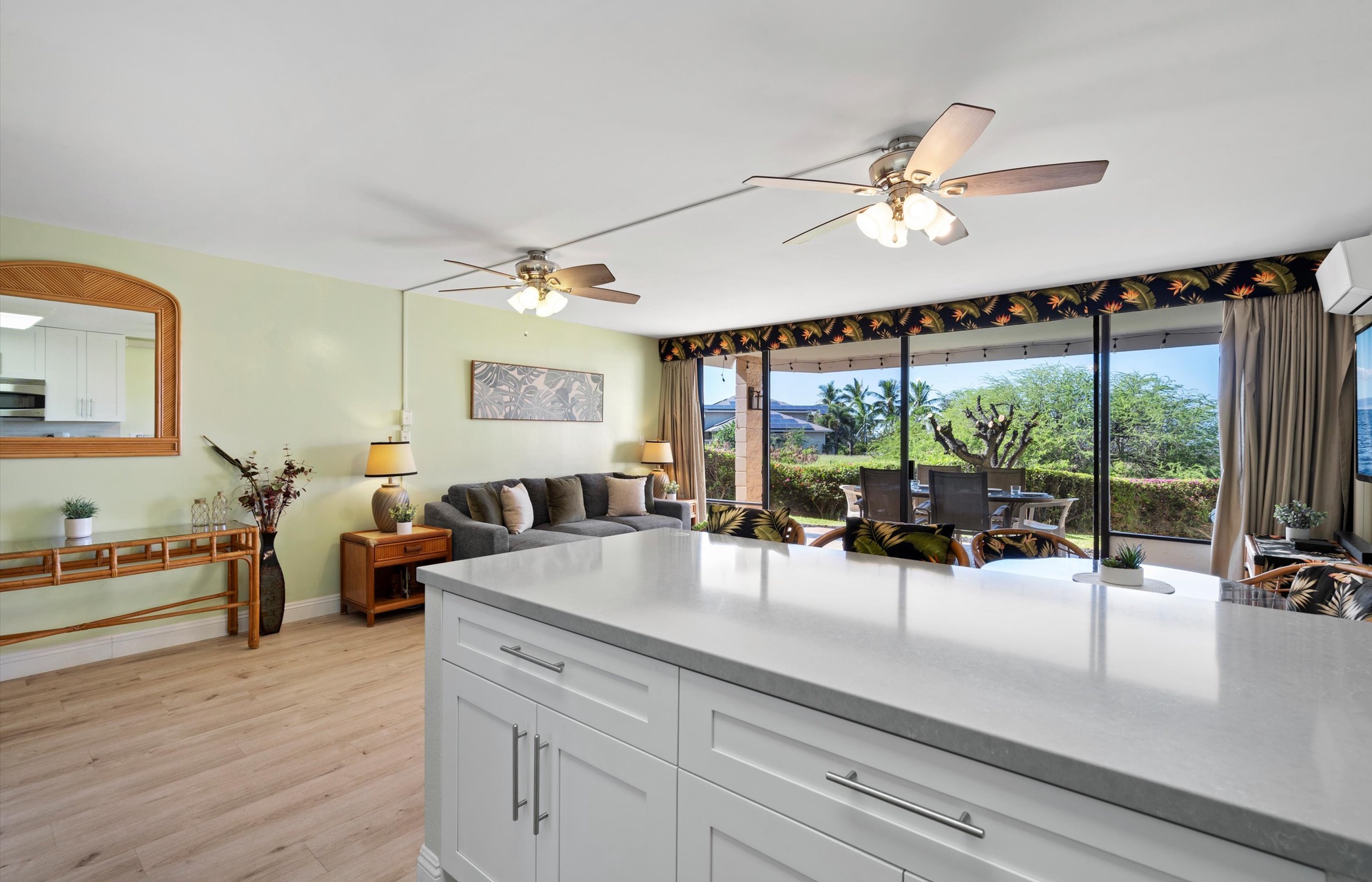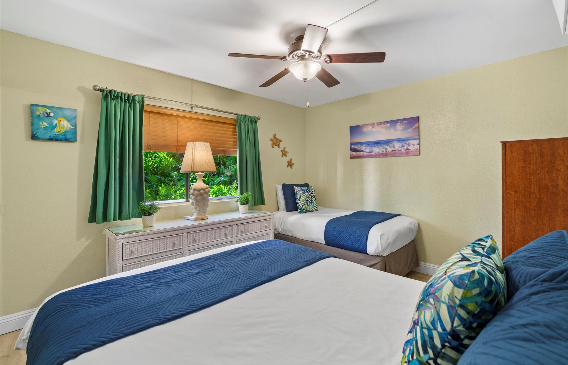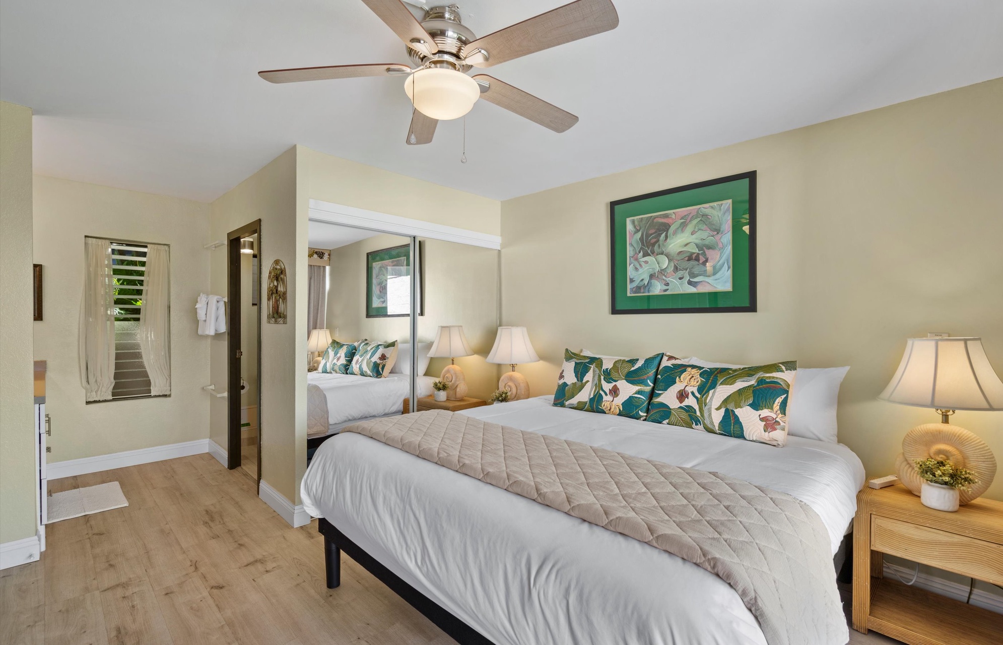 Welcome to Kihei Alii Kai D108, your perfect family-friendly Maui retreat just steps from South Kihei's pristine beaches. This newly renovated 2-bedroom, 2-bathroom condo features a spacious open-concept living area and can comfortably accommodate up to 7 guests. The primary bedroom boasts a new in 2025 king bed, en-suite bathroom with a luxurious tiled walk-in shower, private lanai, and ceiling fan. The guest bedroom offers both a queen and twin bed, while a pull-up sleeper sofa in the living room provides additional sleeping options. Enjoy the Ocean and Sunset Views along with Hawaiian breezes from your main lanai with seating for up to 6. Just off the lanais is a peaceful grassy area perfect for young ones to play.