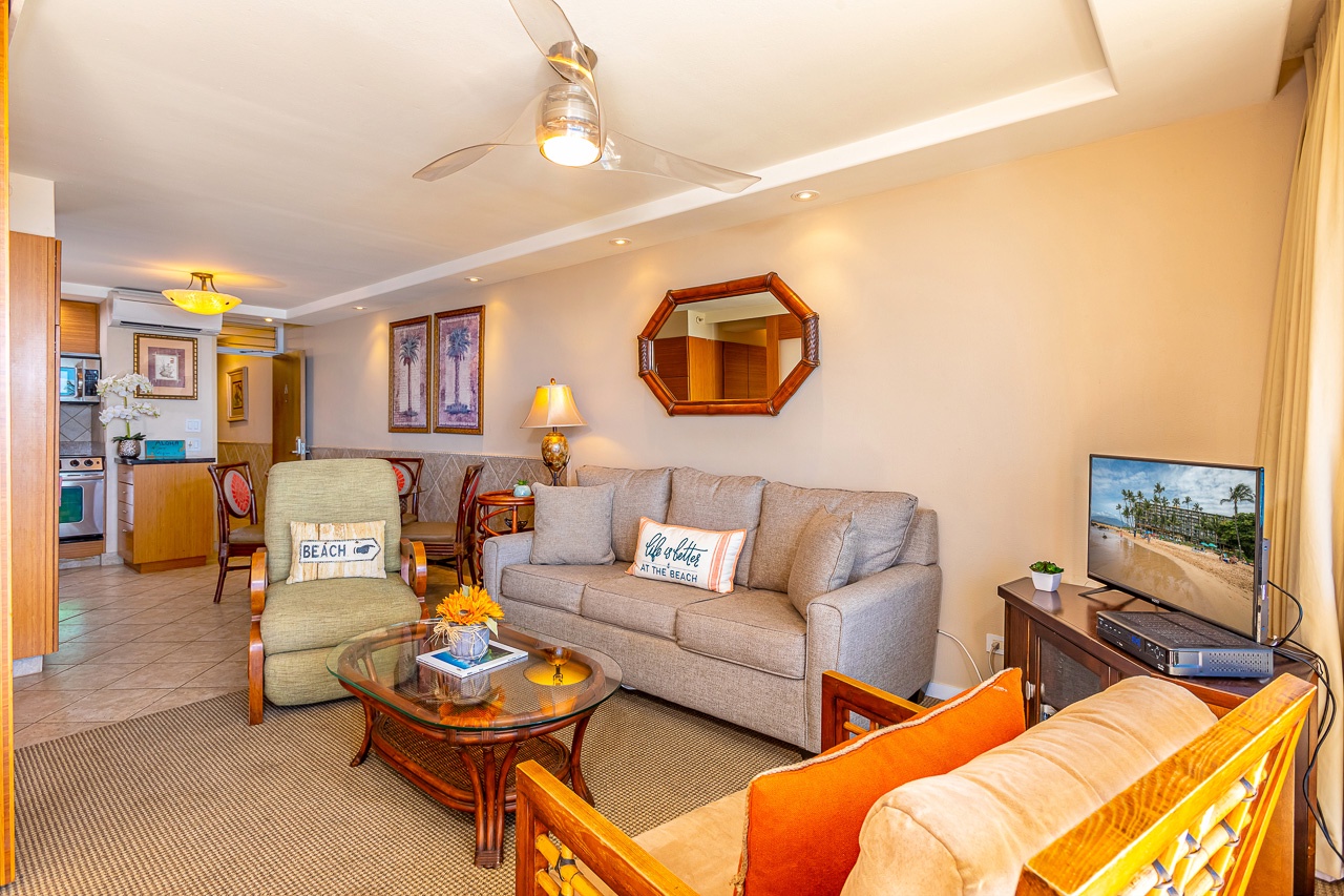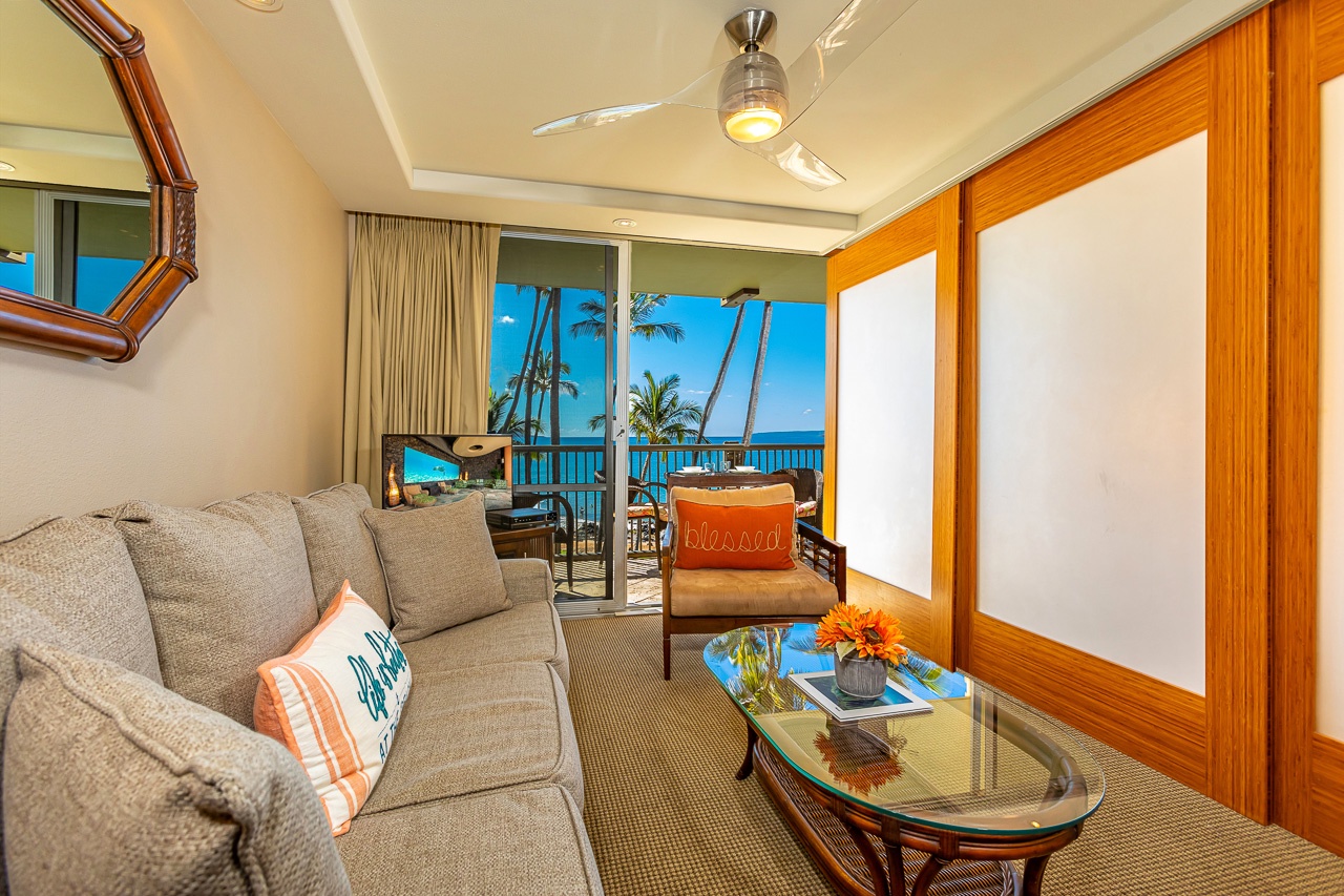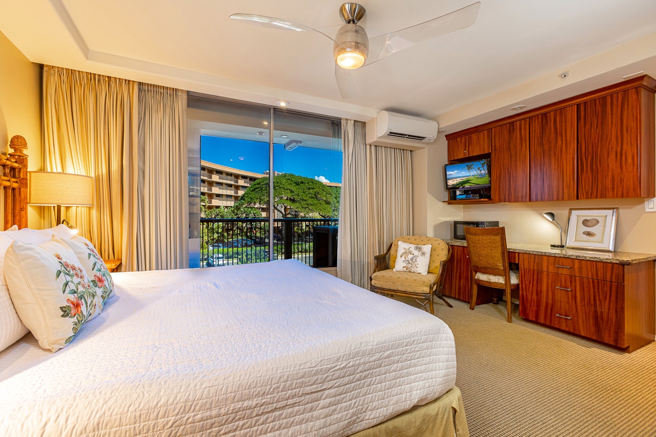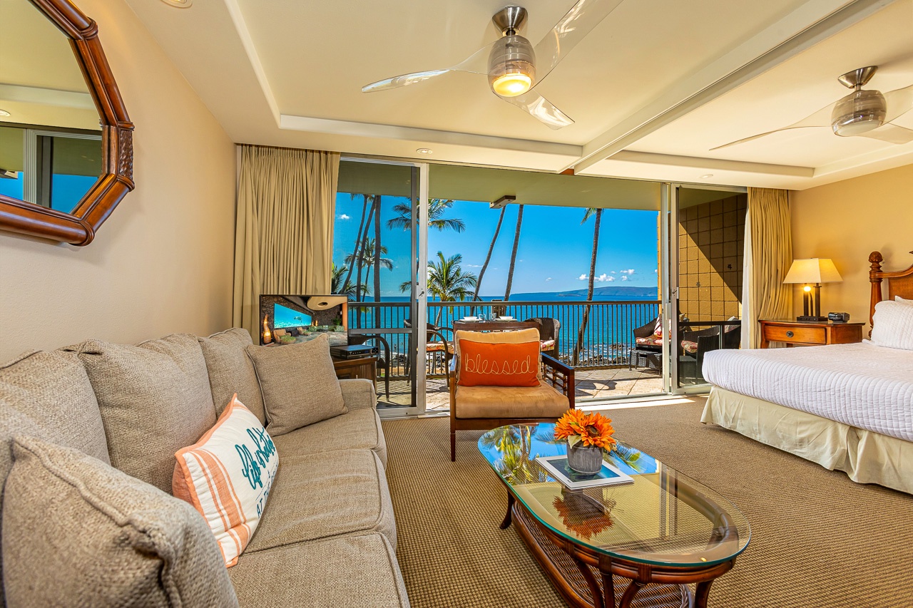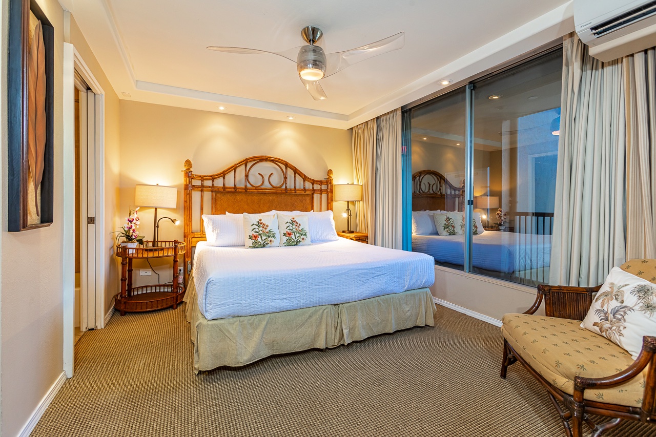 The primary bedroom can be left as an open studio or separated from the living area via Shoji pocket doors. You'll find a plush king bed, ceiling fan and lanai access in the main bedroom along with en suite bathroom with walk-in shower. Guest bedroom also features King sized bed, ceiling fan and en suite bathroom. This room also has a desk/work area, television and grand floor-to-ceiling windows for plenty of natural light.