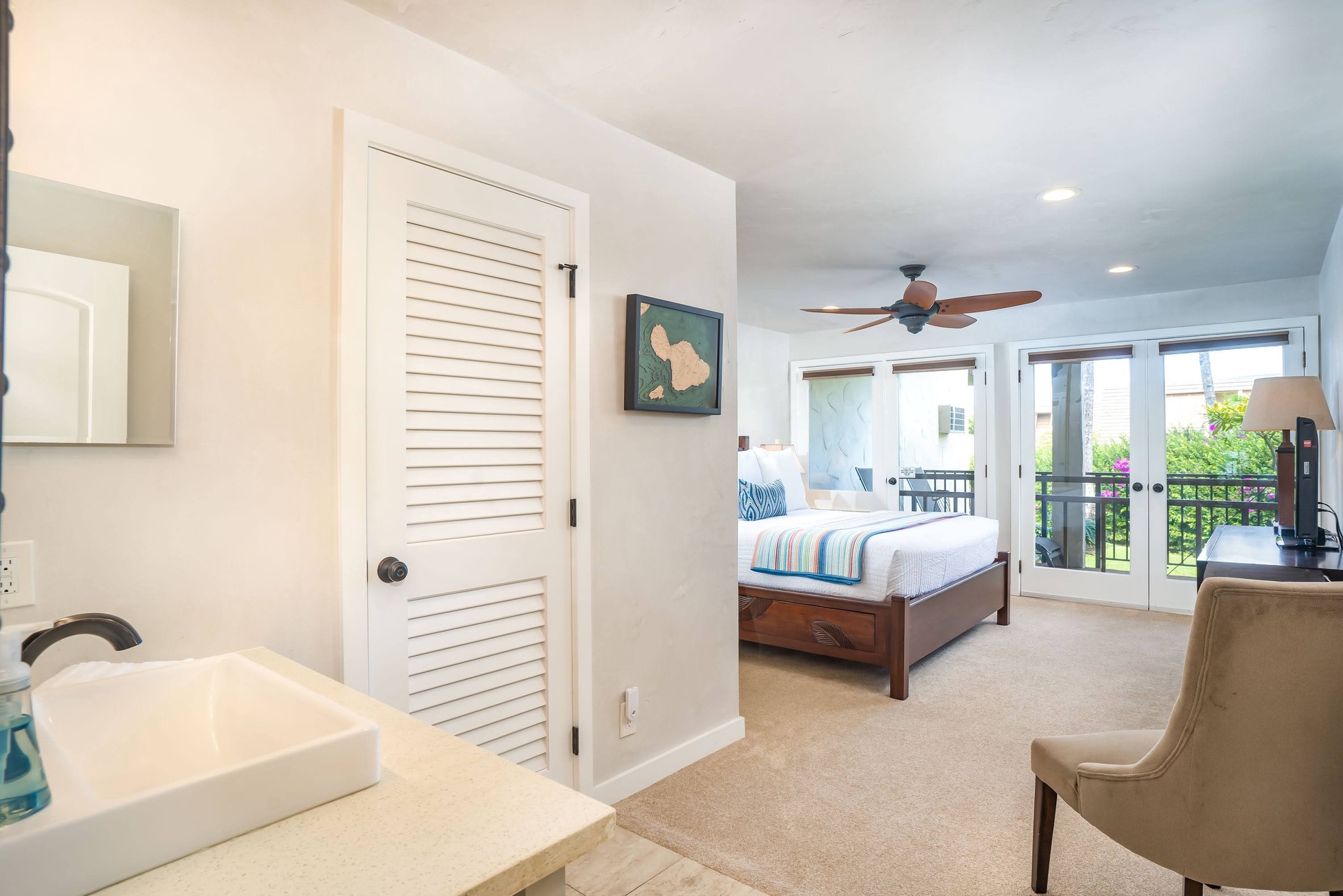 The charming guest bedroom offers that beach feel with crisp white beautiful linens and a cozy queen bed. Enjoy a quiet Maui morning with your own private lanai off the guest bedroom. There is a flat-screen TV and window AC unit for comfortable sleeping.
