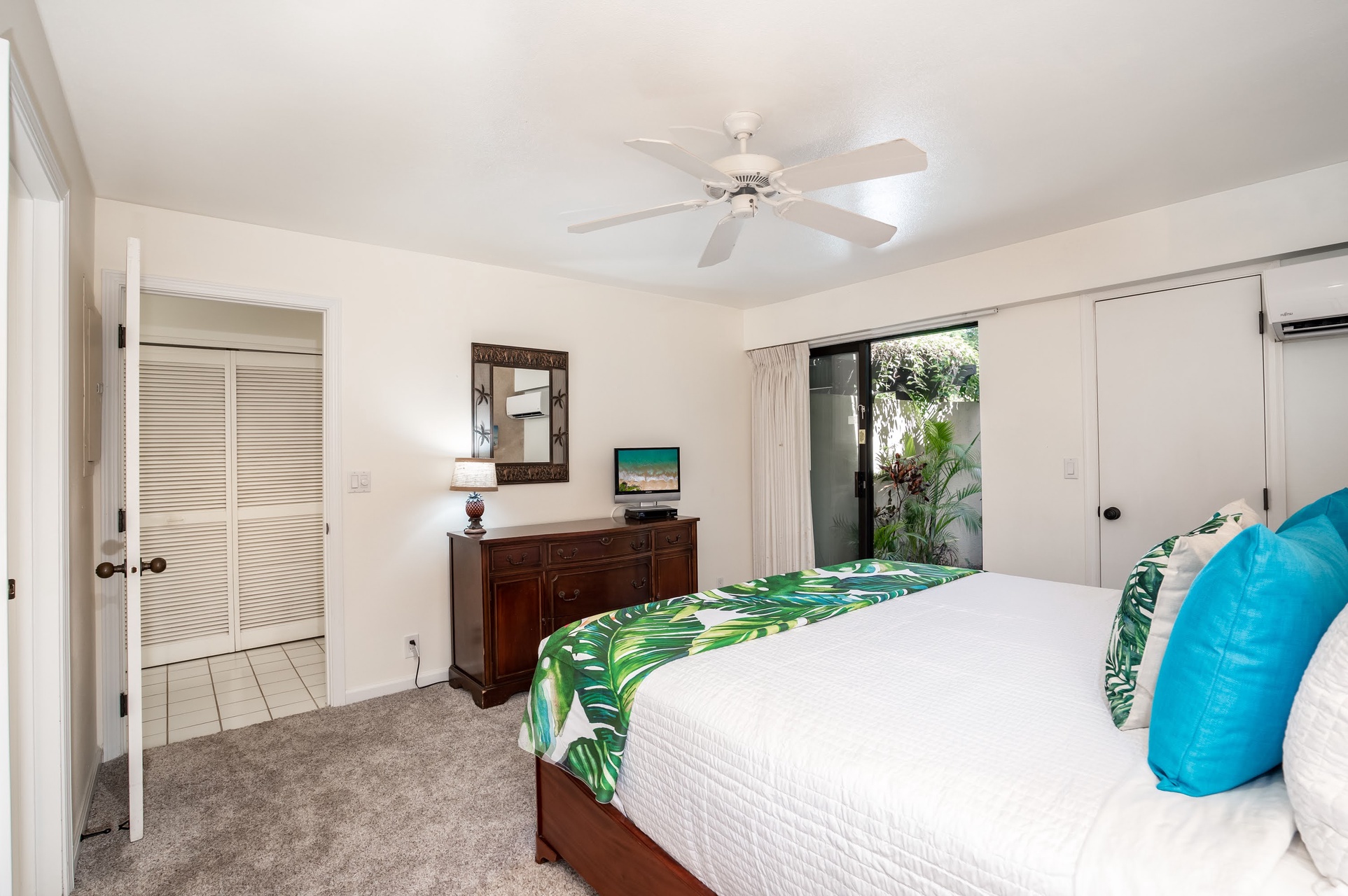 Drift off for the perfect night's rest in this primary suite! With a king-size bed, ceiling fan, split AC, and a quaint outdoor space. The en suite bath has a tub/shower combo and a large vanity area.