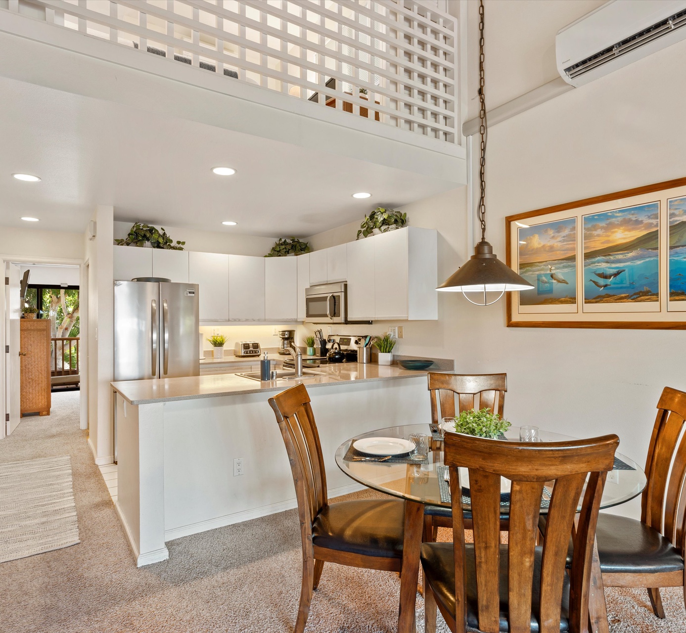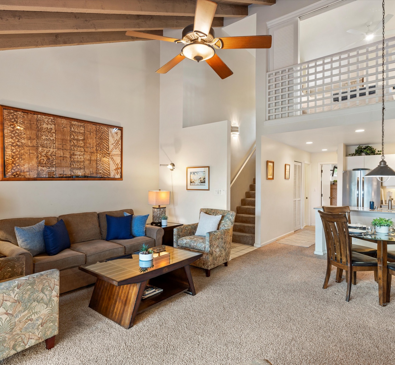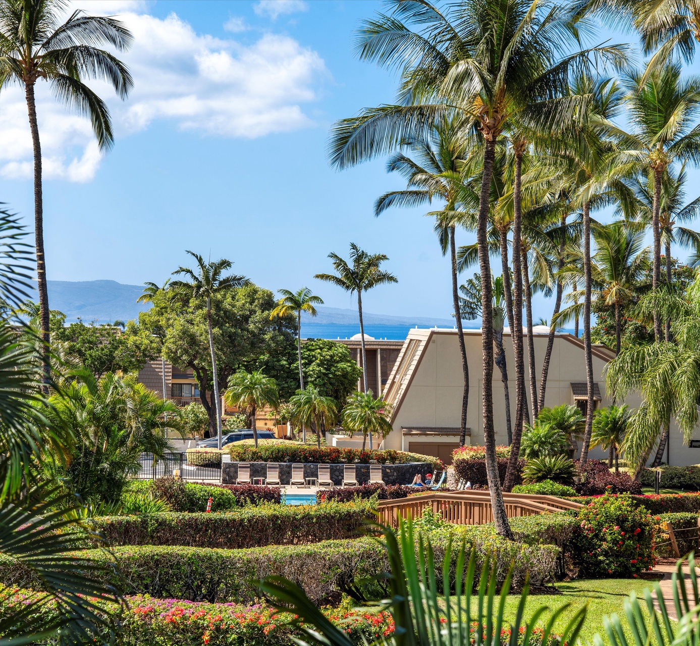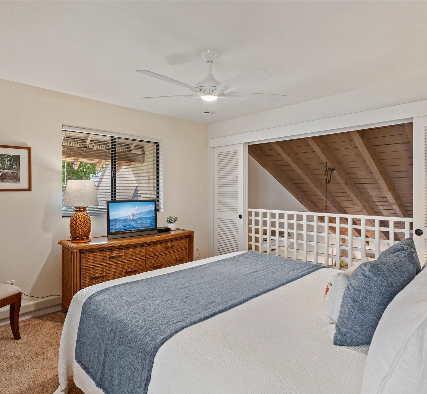 Escape to this spacious 2-bedroom, 2-bathroom loft condo at Maui Kamaole J209. Featuring an open living area, large primary bedroom with King bed, and a guest room with a Queen and a Twin bed, this condo comfortably sleeps up to 6 guests. Enjoy the lush tropical gardens and peeks of the ocean from your large main, lanai. Also catch the beautiful sunset colors every evening. Fully equipped kitchen allows for meals enjoyed at home. With efficient split AC, ample dining, and all the comforts of home, Maui Kamaole J209 is the perfect home base for your Maui adventure.
