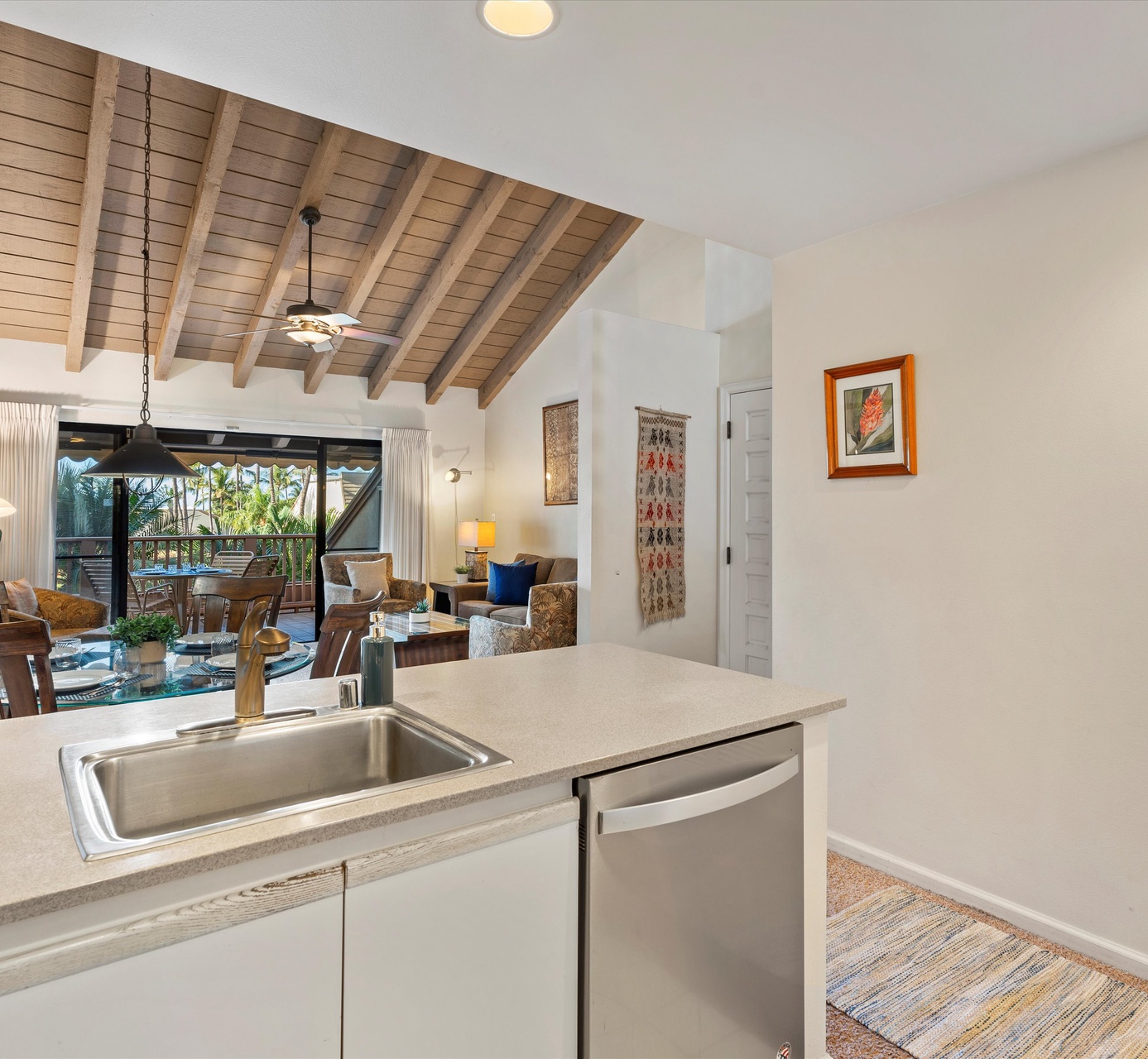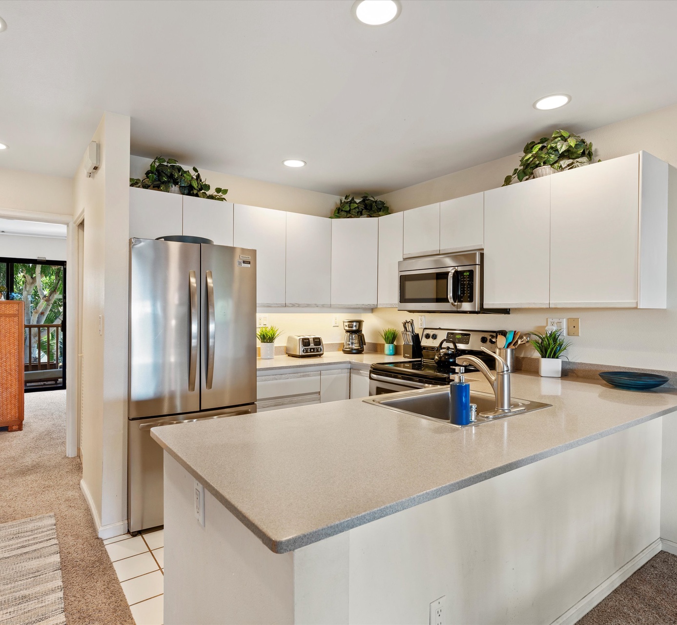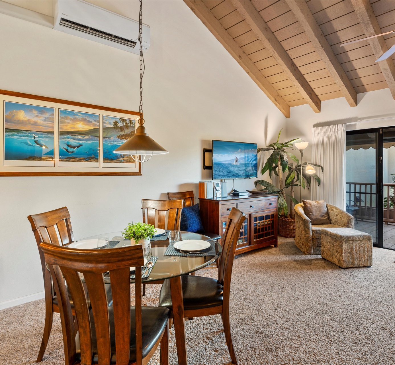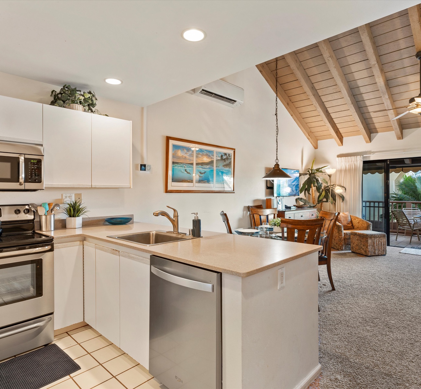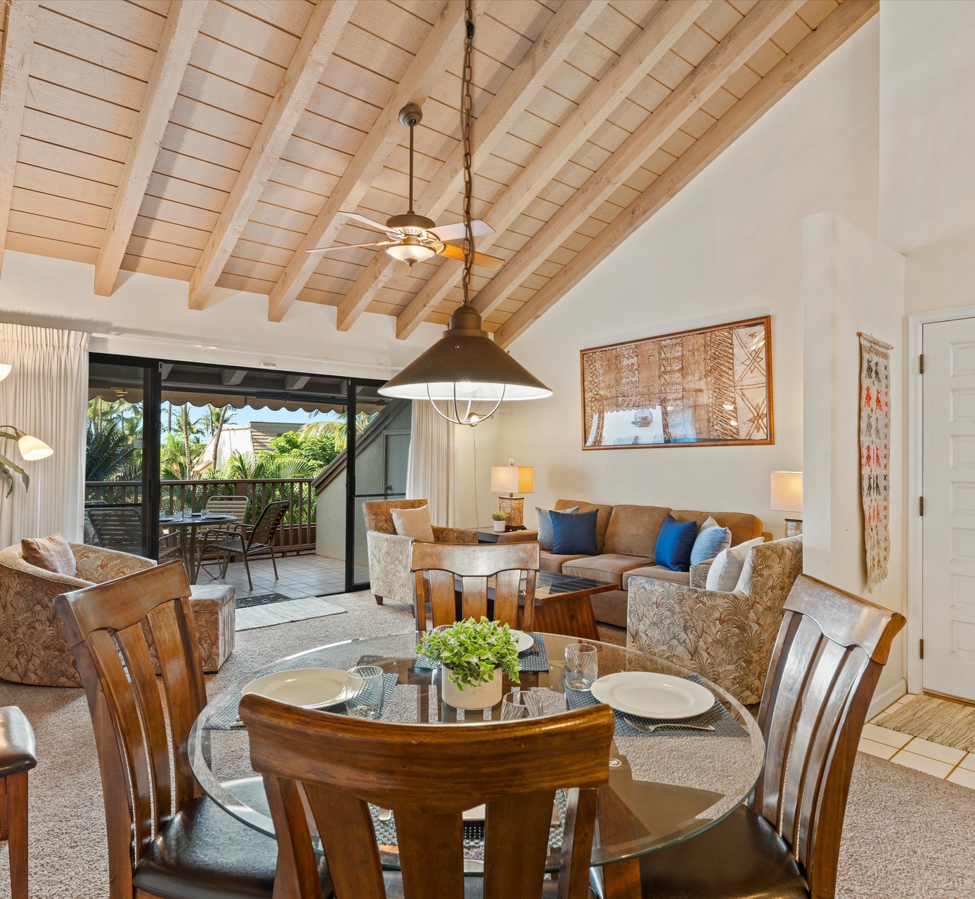 Escape to this spacious 2-bedroom, 2-bathroom loft condo at Maui Kamaole J209. Featuring an open living area, large primary bedroom with King bed, and a guest room with a Queen and a Twin bed, this condo comfortably sleeps up to 6 guests. Enjoy the lush tropical gardens and peeks of the ocean from your large main, lanai. Also catch the beautiful sunset colors every evening. Fully equipped kitchen allows for meals enjoyed at home. With efficient split AC, ample dining, and all the comforts of home, Maui Kamaole J209 is the perfect home base for your Maui adventure.