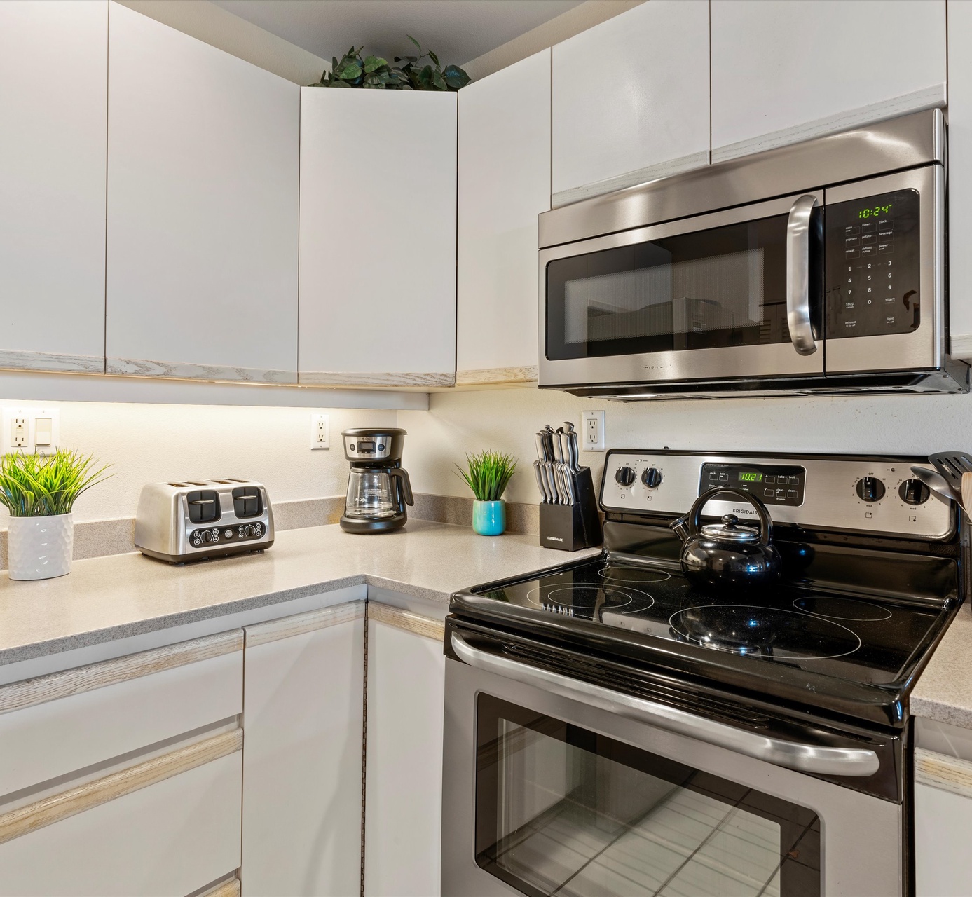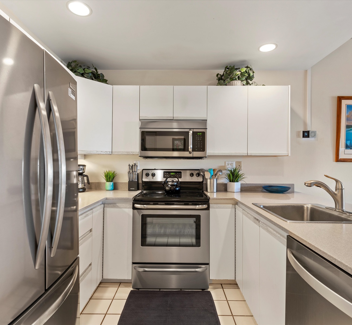 -Kitchen offers full size appliances: fridge w/ice maker, dishwasher, stove, oven, microwave