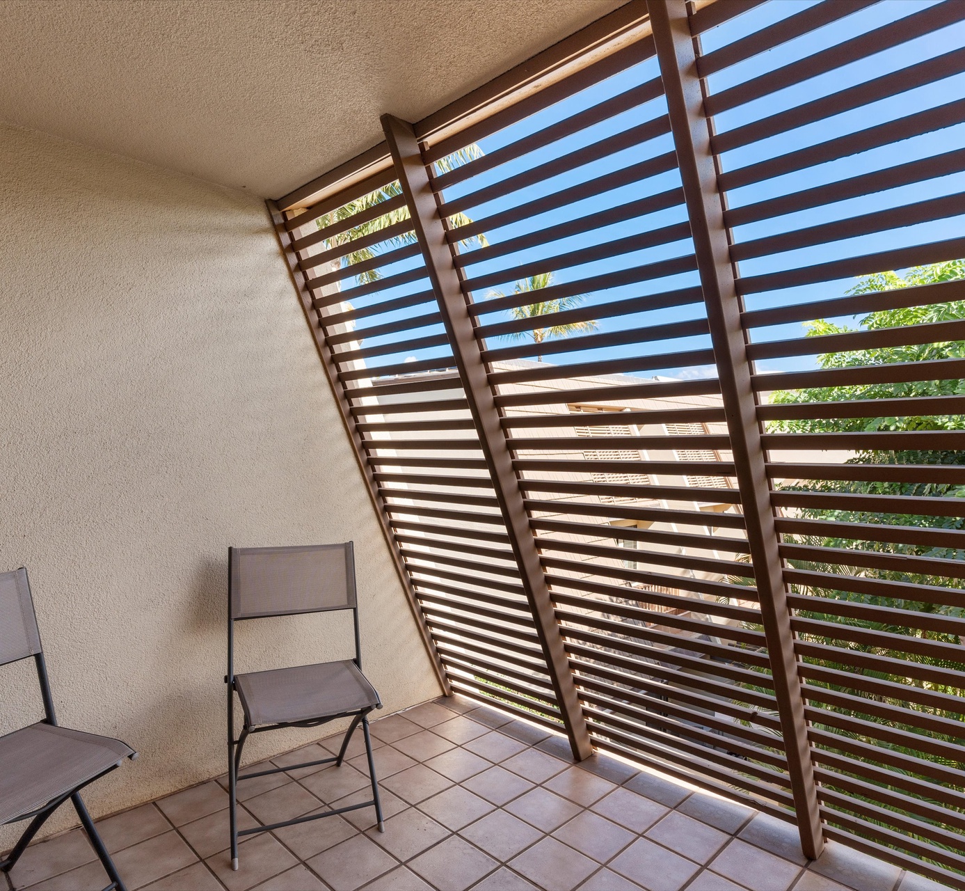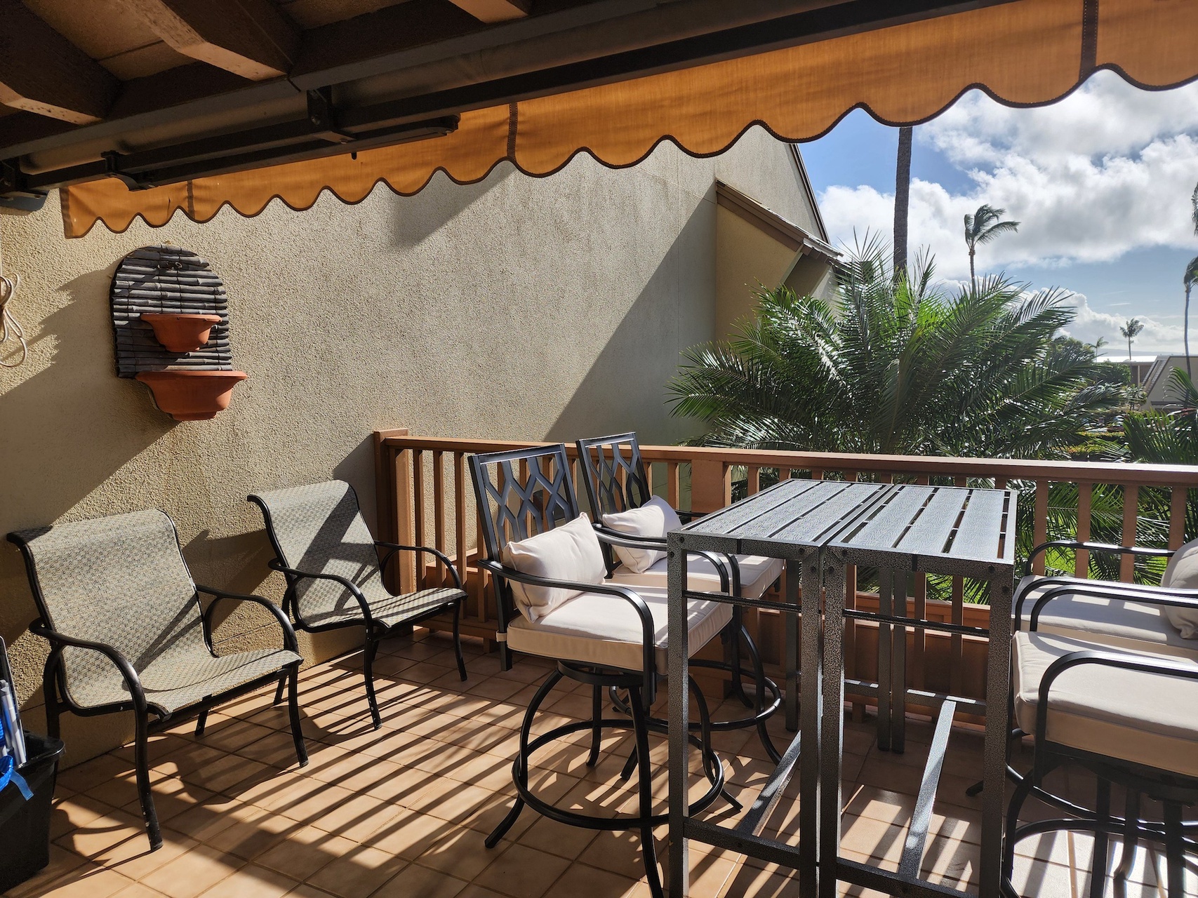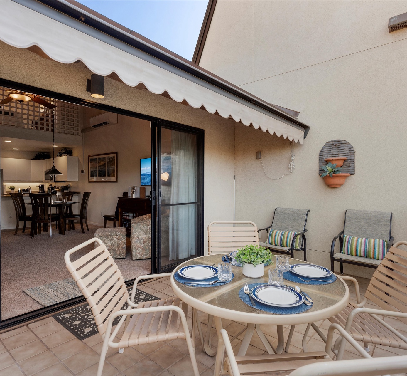 -Large open lanai with seating for 4 and garden view with bonus glimpses of sunset colored skies and peeks of the ocean