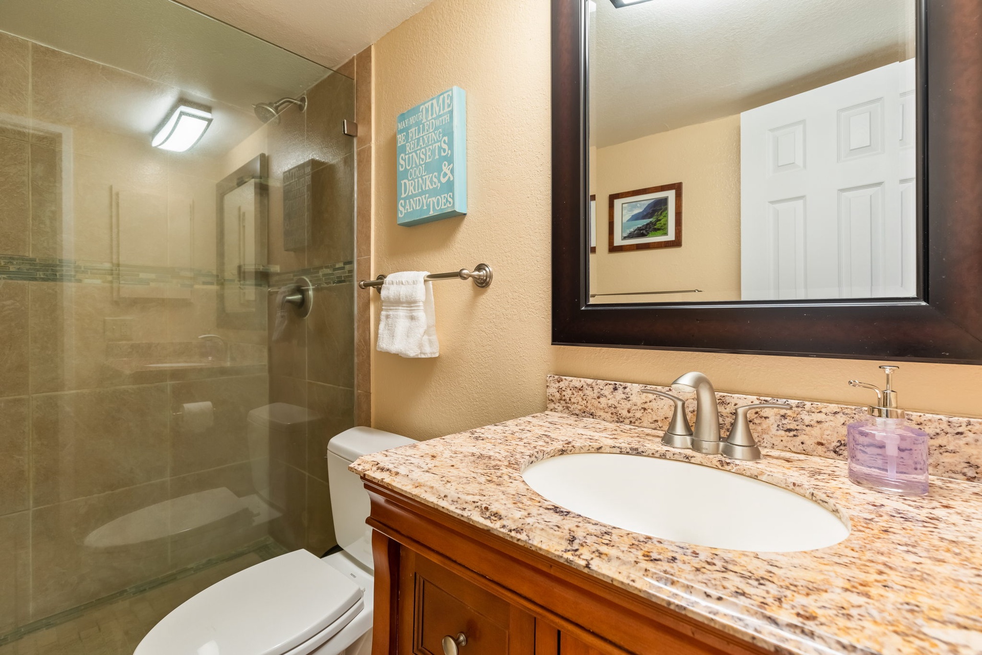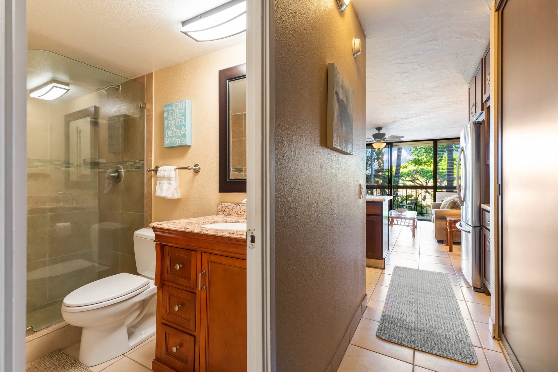 A perfect night’s rest awaits in the charming primary bedroom, which reflects its tropical surroundings with beautiful linens and a cozy queen bed. Just adjacent to the bedroom is the spacious bathroom, which hosts a luxurious tiled shower. A stacked combination washer/dryer adds convenience and makes for lighter packing.