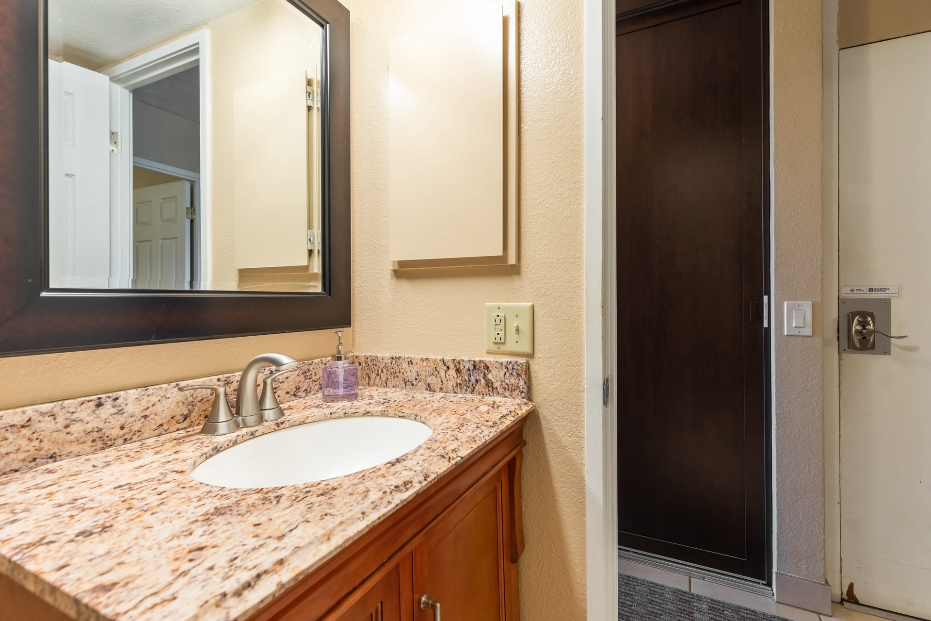 This bathroom features a large mirror