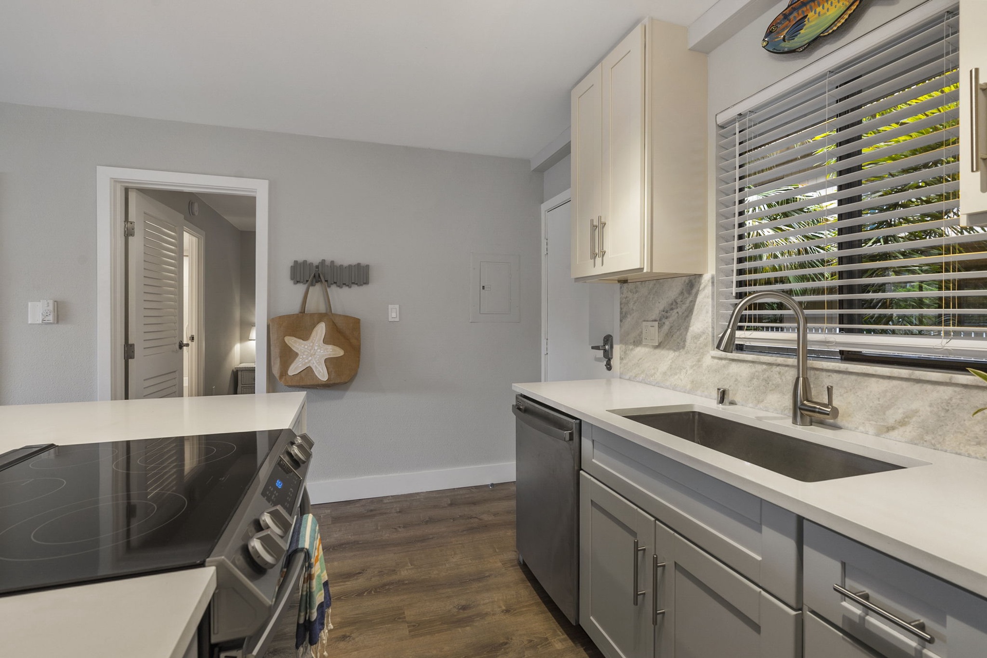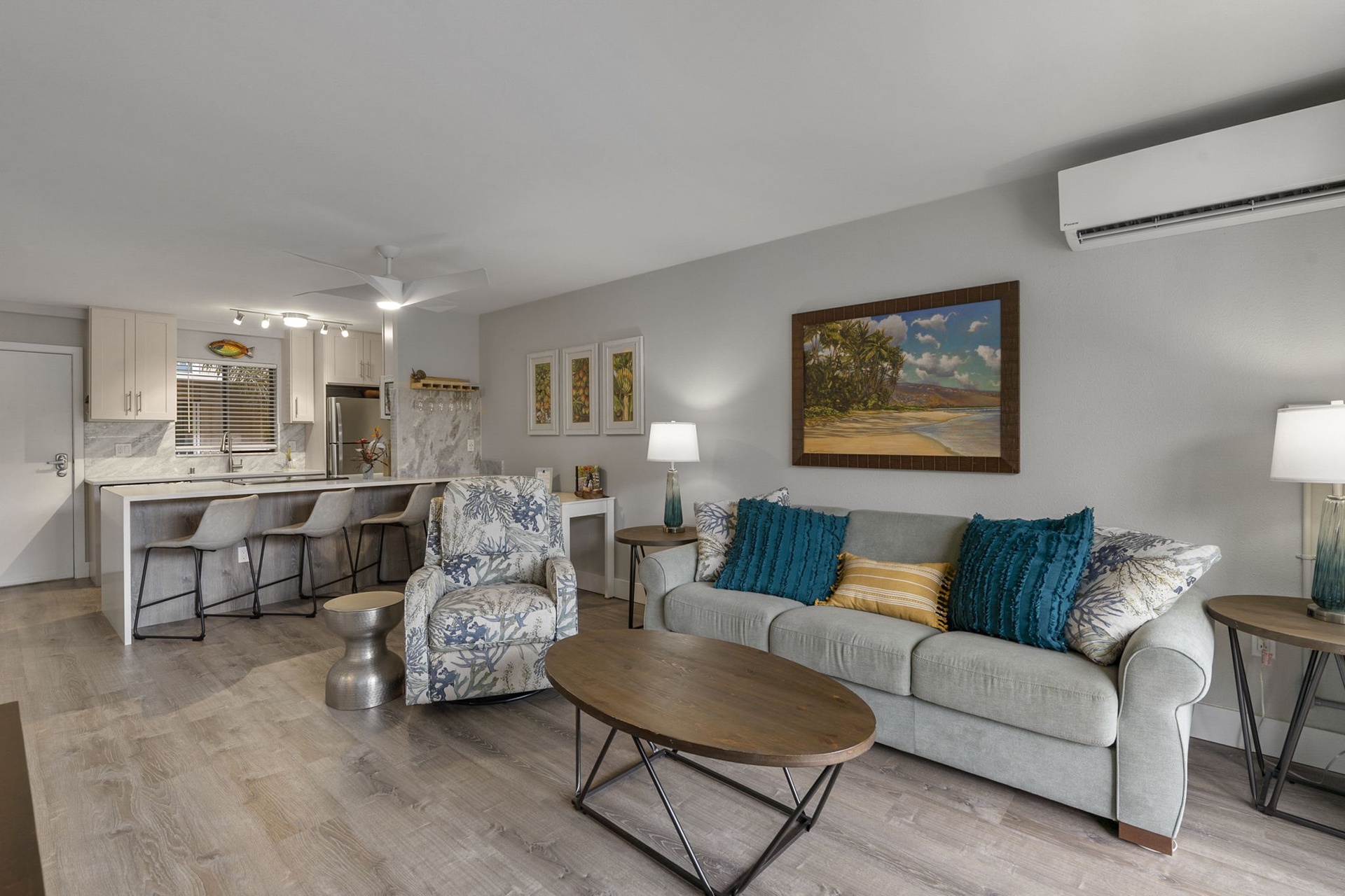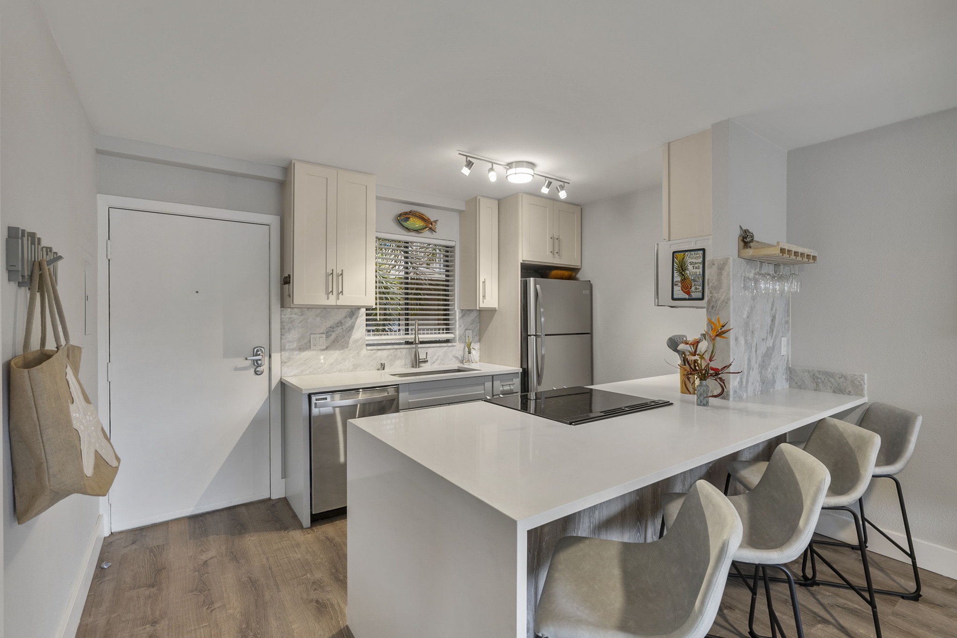 This roomy two-bedroom/two-bath unit comes fully stocked with all the amenities needed to make you feel as if you are in your own home. Enjoy the fabulous modern decor in this tastefully remodeled condo. Updates include waterproof vinyl flooring, Caesarstone countertops with a waterfall edge, new cabinets, new appliances, new AC, and new beachy furnishings throughout. Seating for 4 at the stone bar top as well as space for 2 on the lanai.
