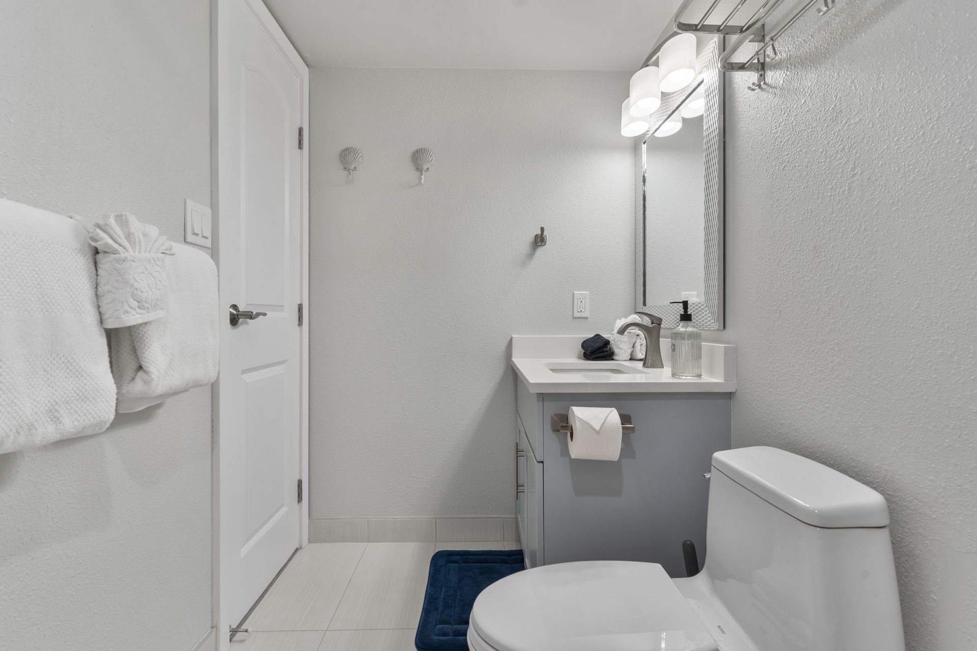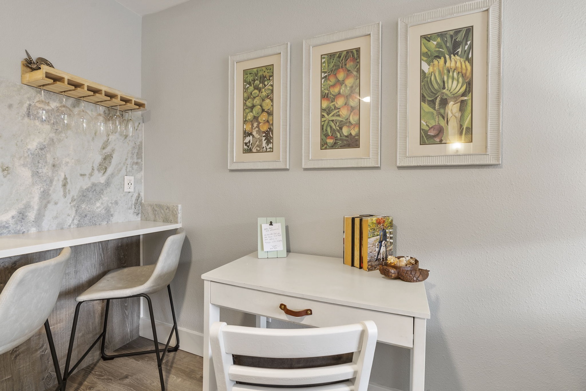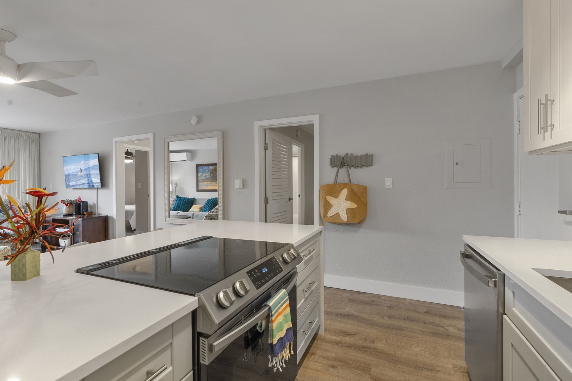 This roomy two-bedroom/two-bath unit comes fully stocked with all the amenities needed to make you feel as if you are in your own home. Enjoy the fabulous modern decor in this tastefully remodeled condo. Updates include waterproof vinyl flooring, Caesarstone countertops with a waterfall edge, new cabinets, new appliances, new AC, and new beachy furnishings throughout. Seating for 4 at the stone bar top as well as space for 2 on the lanai.