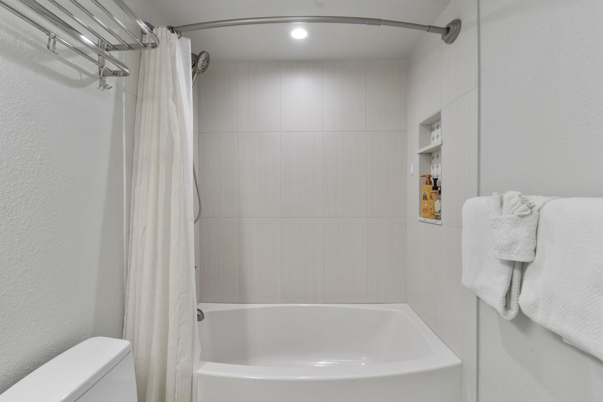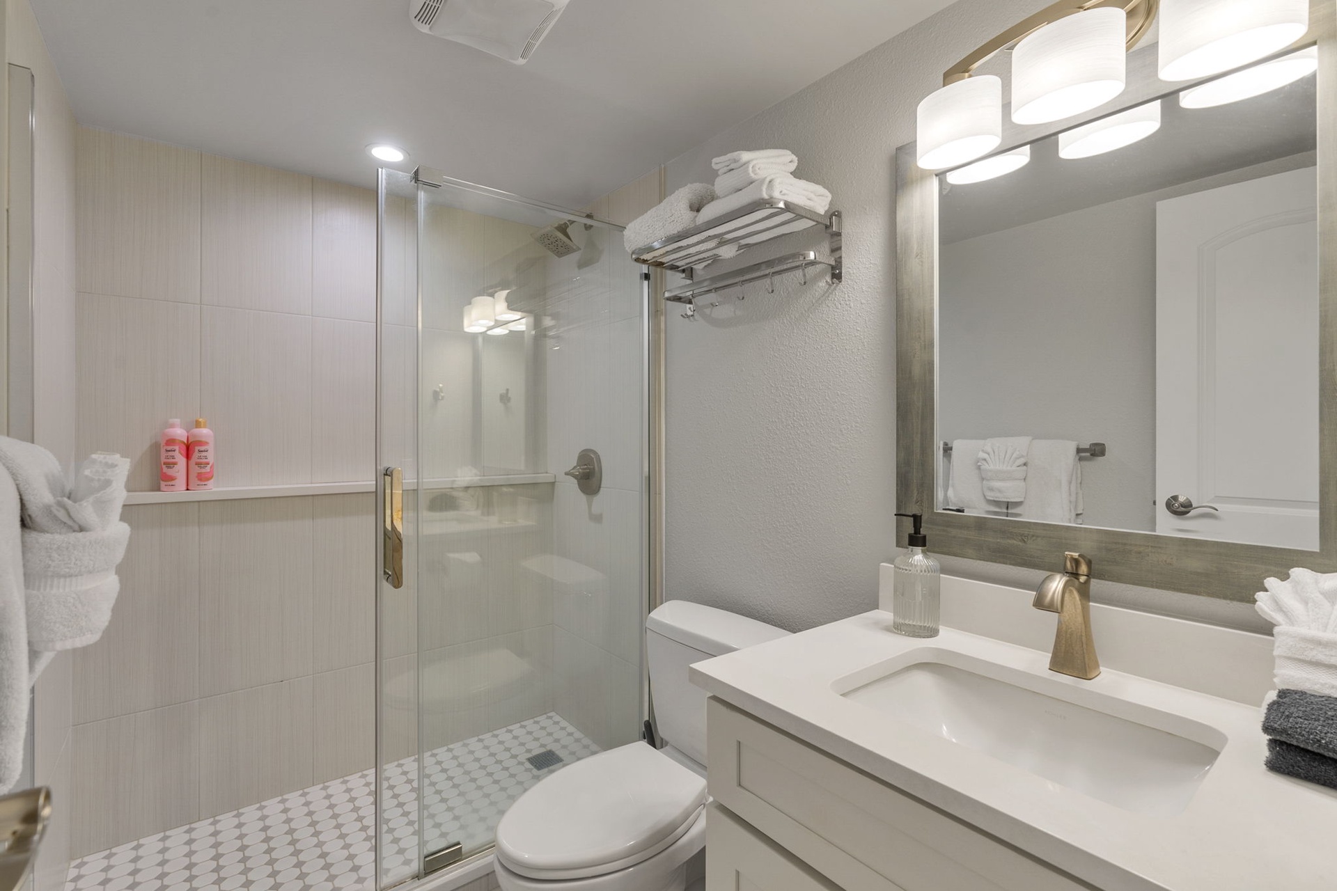 The living space offers a large Smart TV and added sleep space on the sofa sleeper. Both bedrooms feature Queen beds, and both have TVs for those who like to drift off to sleep while watching their shows. The primary bedroom has an en suite full bathroom with a soaking tub with a shower. The guest bathroom has a walk-in tiled shower with glass doors.