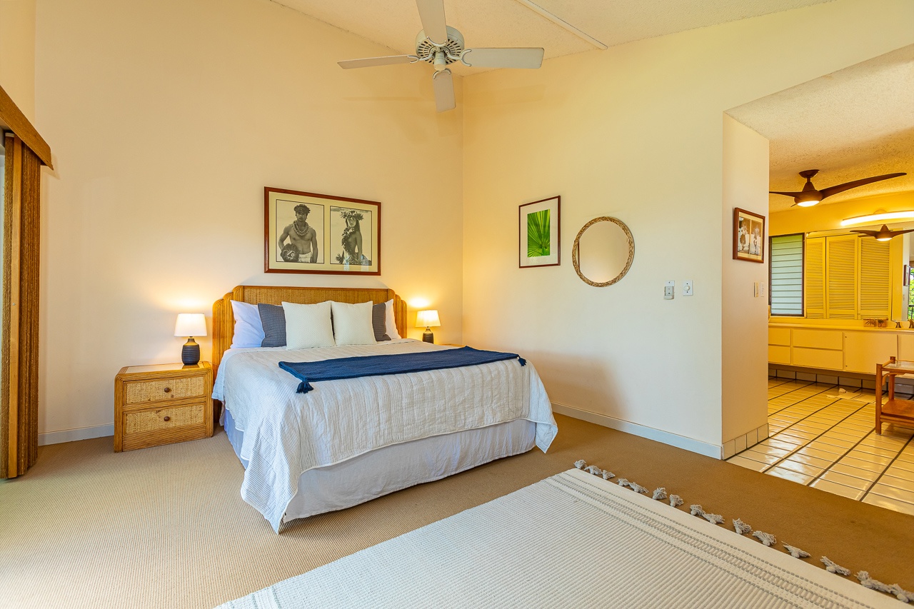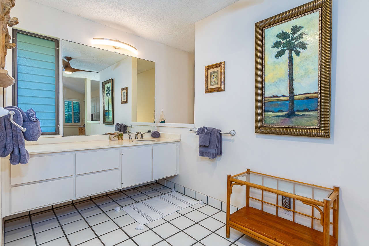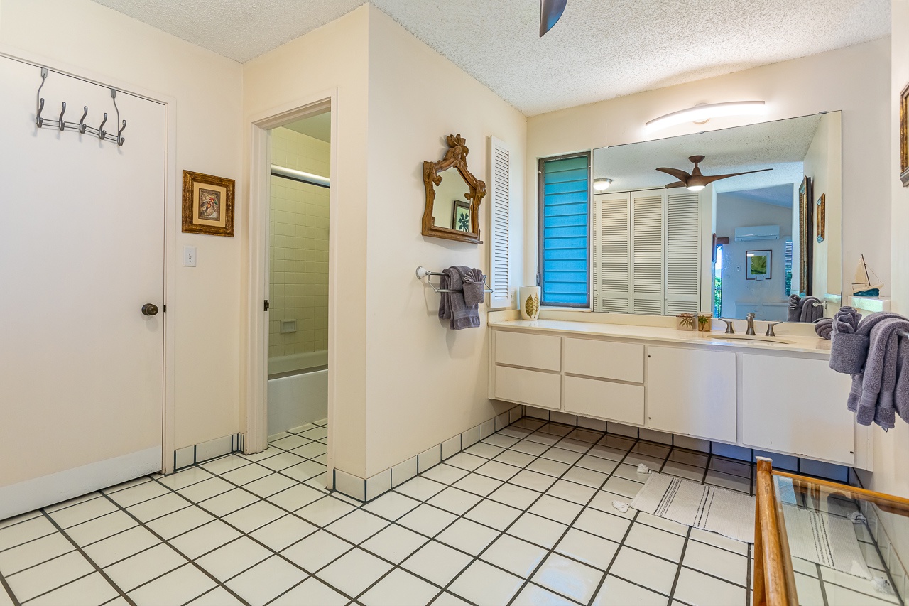 The primary suite utilizes the entire upstairs floor. This huge space offers king size bed, chaise lounge and its own private lanai that is excellent for enjoying your morning coffee. With a TV, AC and more than enough room, your daily yoga practice can continue with ease. En suite bathroom provides plenty of space for your morning routine and has a tiled tub/shower combo with detachable shower head. There is also a washer and dryer in the condo for your private use.