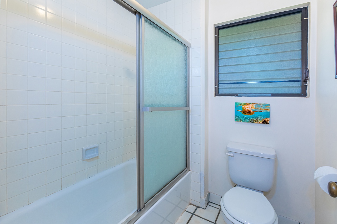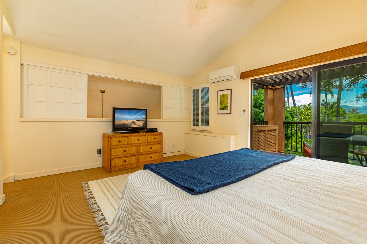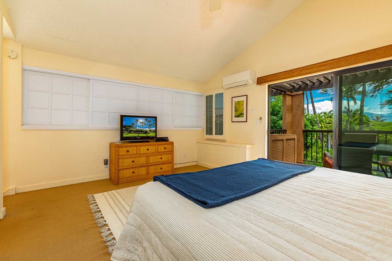 The primary suite utilizes the entire upstairs floor. This huge space offers king size bed, chaise lounge and its own private lanai that is excellent for enjoying your morning coffee. With a TV, AC and more than enough room, your daily yoga practice can continue with ease. En suite bathroom provides plenty of space for your morning routine and has a tiled tub/shower combo with detachable shower head. There is also a washer and dryer in the condo for your private use.