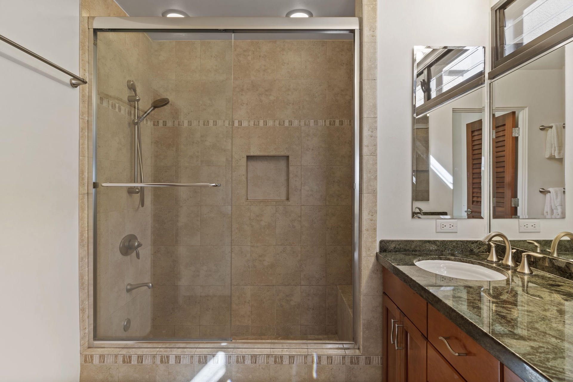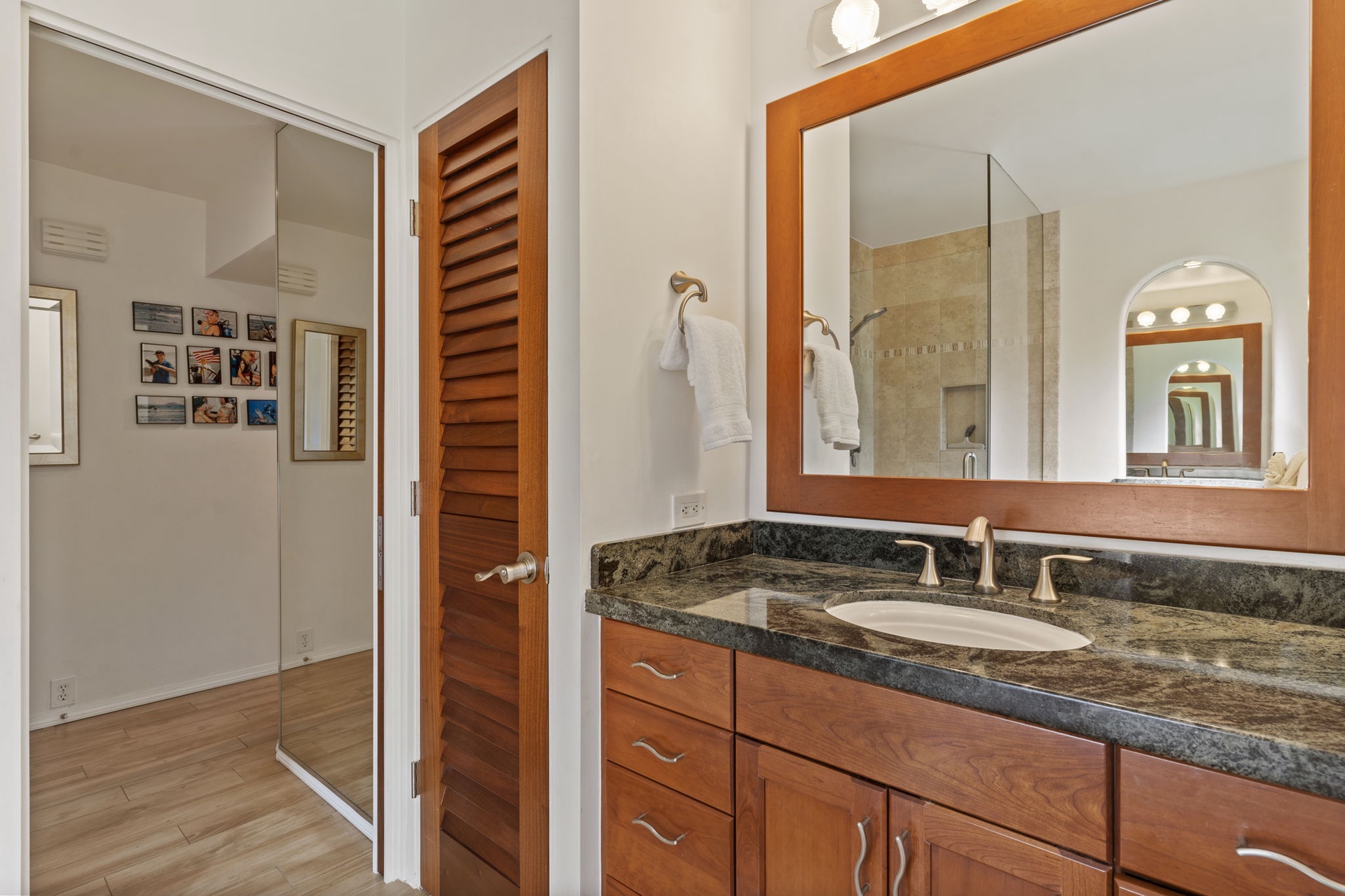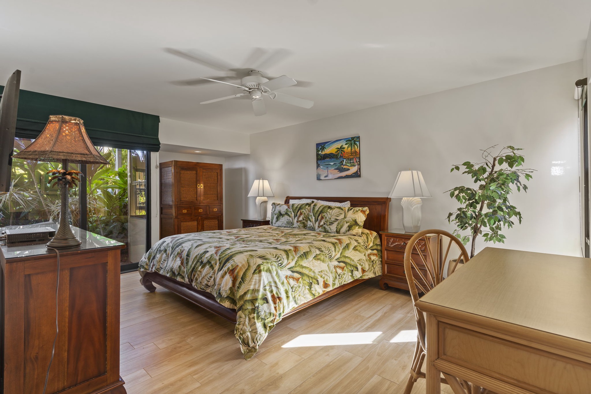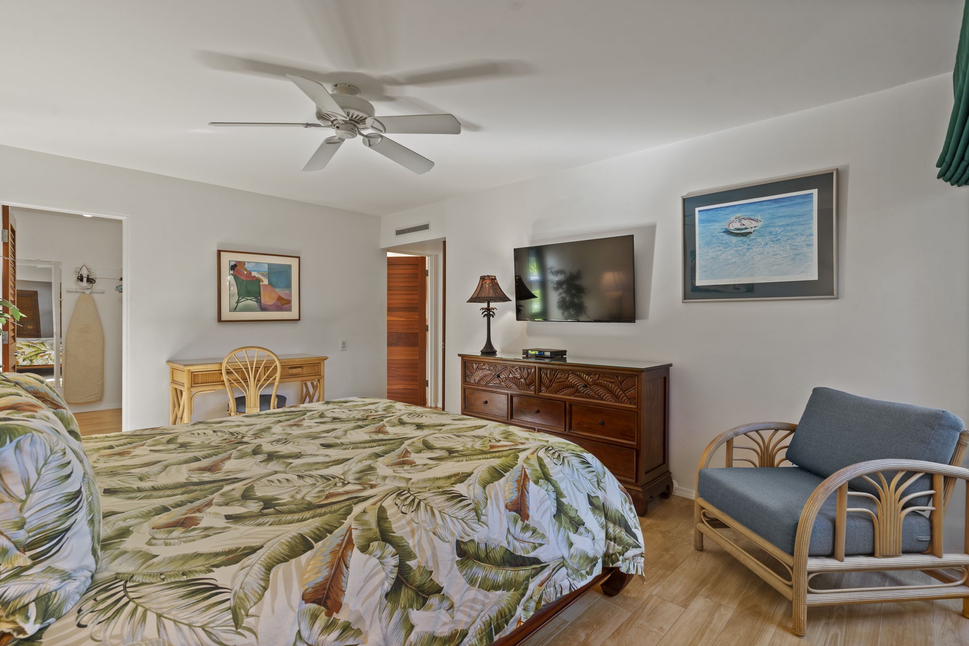 The large bedroom suite offers a plush California King memory foam bed with tropical bedding and elegant mahogany "island style" furnishings. Central AC, ceiling fan, and a Smart TV in this room allow for cozy movie nights in bed. Large en suite bathroom features a spacious walk-in shower, and dual sinks provide plenty of space to get beach and dinner ready. Second full bathroom with walk-in shower is conveniently located off the living areas.