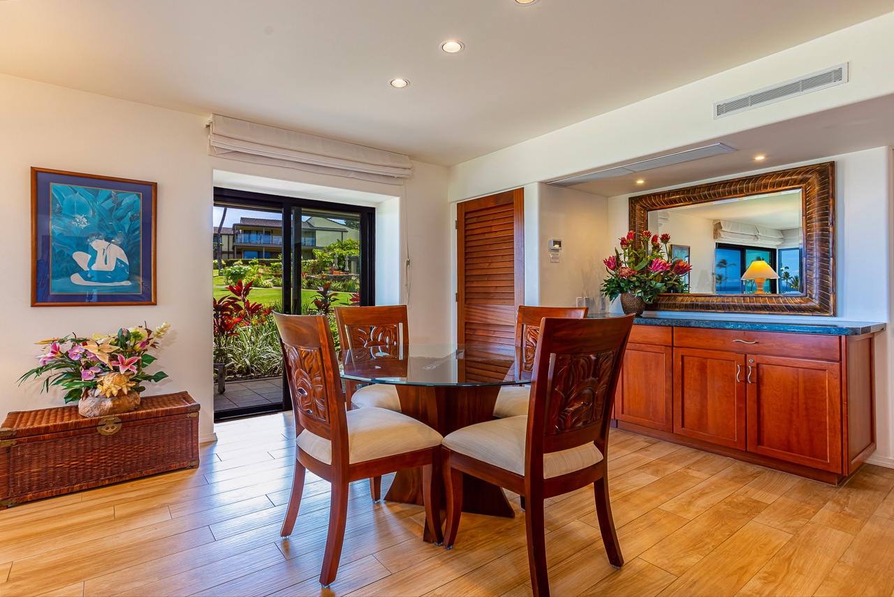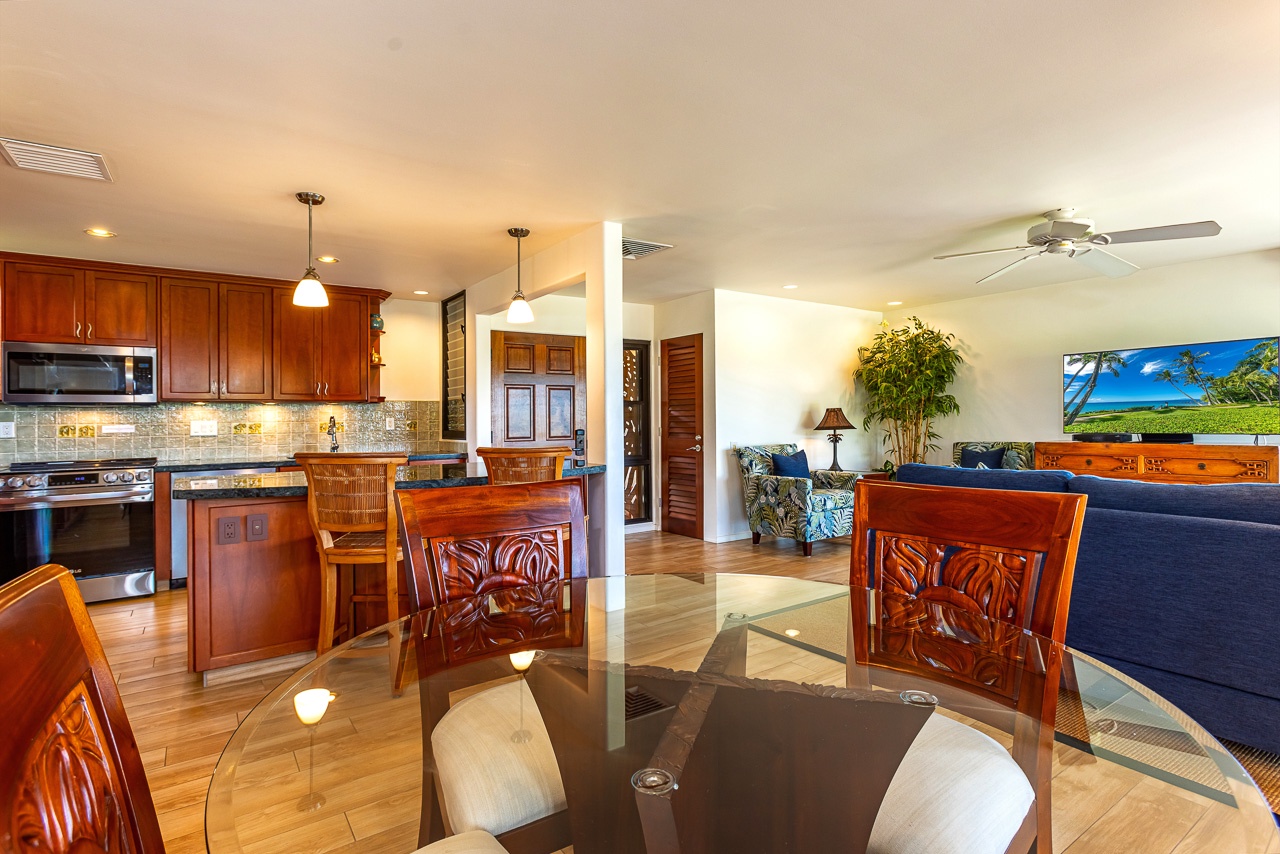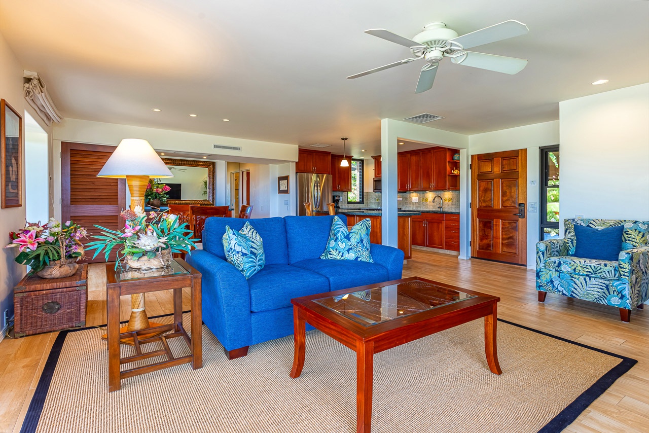 The Living Room features a large wall-mounted HD Smart TV, central A/C, ceiling fan, a spectacular ocean view, and a huge wall of floor-to-ceiling glass doors that allow the famous Maui trade winds in and lead to your private ground floor lanai.
