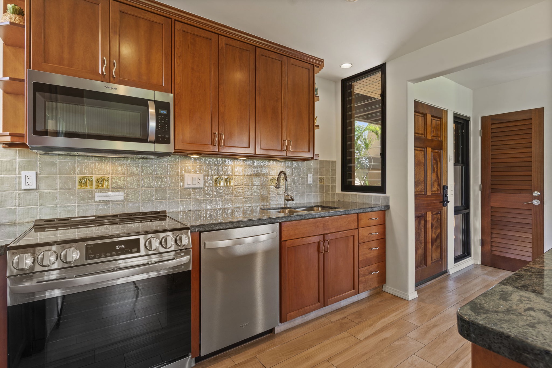 The updated, open concept kitchen features granite counters, beautiful cherry wood cabinets, newer stainless appliances and is fully equipped for the home chef to whip up hearty brunch buffets as well as gourmet dinners. County fire code does not allow private BBQ's, but a 3-grill gourmet Weber grilling station is located just yards away. The inside dining table is perfect for quiet meals or a game of gin rummy or bridge... We supply the cards!!